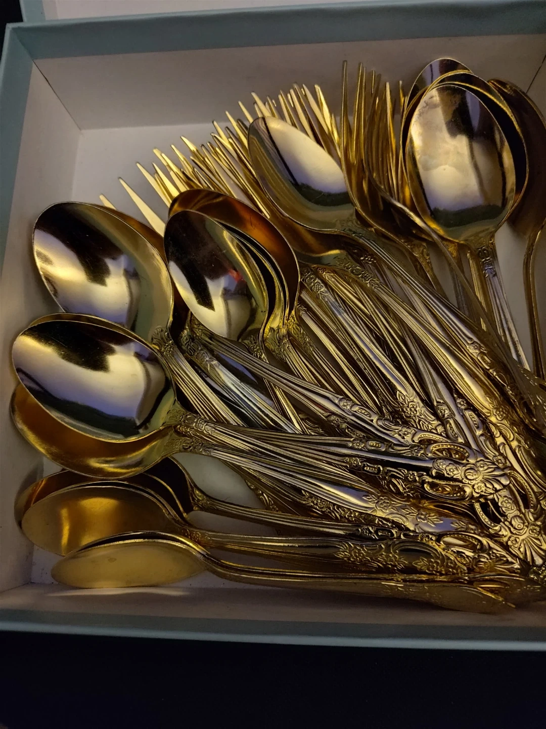 This cutlery set features a beautiful gold-tone finish and intricate ornate detailing on the handles. It includes a variety of spoons and forks, perfect for special occasions. The set is presented in a light blue box.