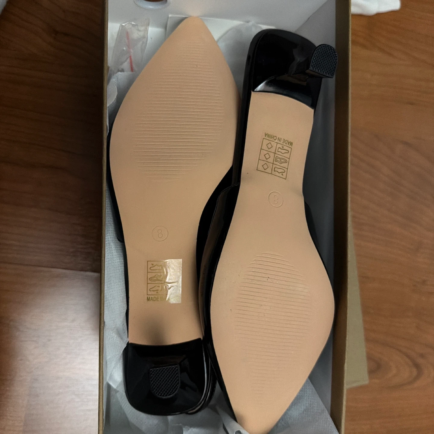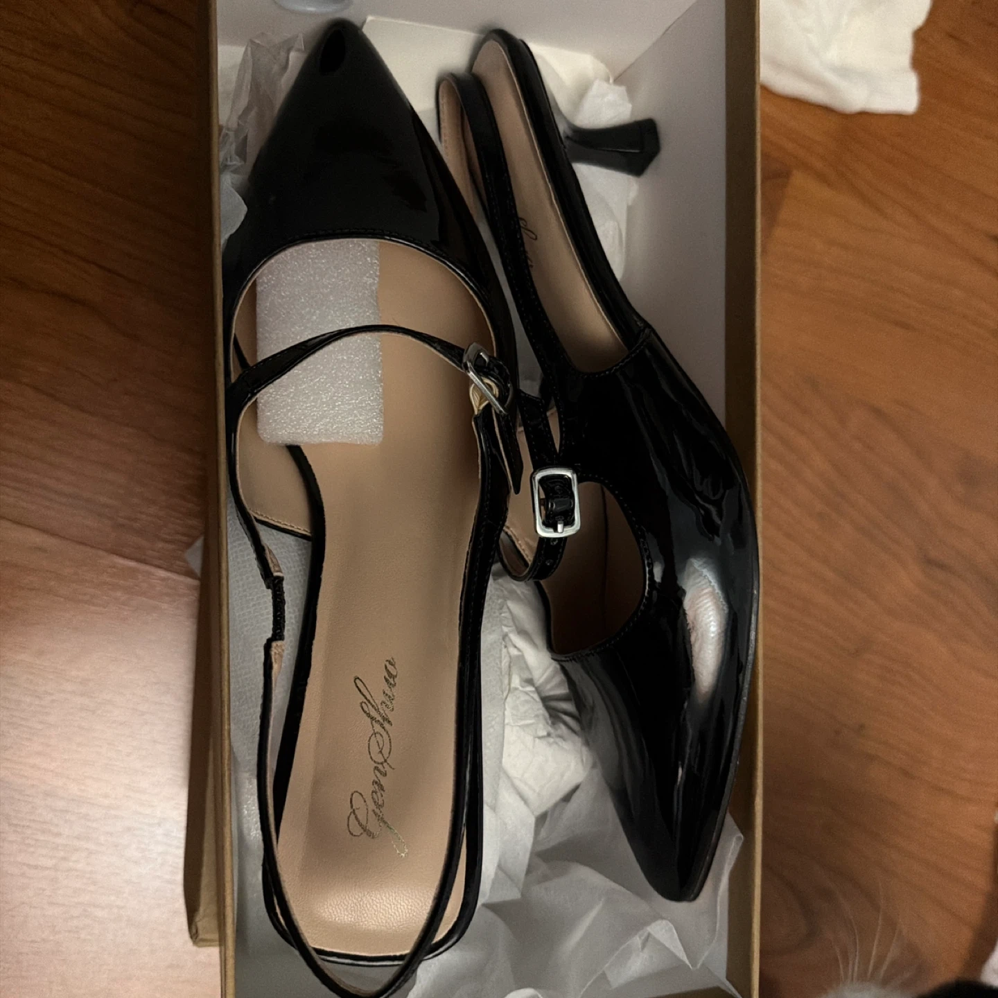 Chic black patent slingback heels from Gen Nova. Features a pointed toe and adjustable ankle strap. Heel height is approximately 2 inches. Size is 8.