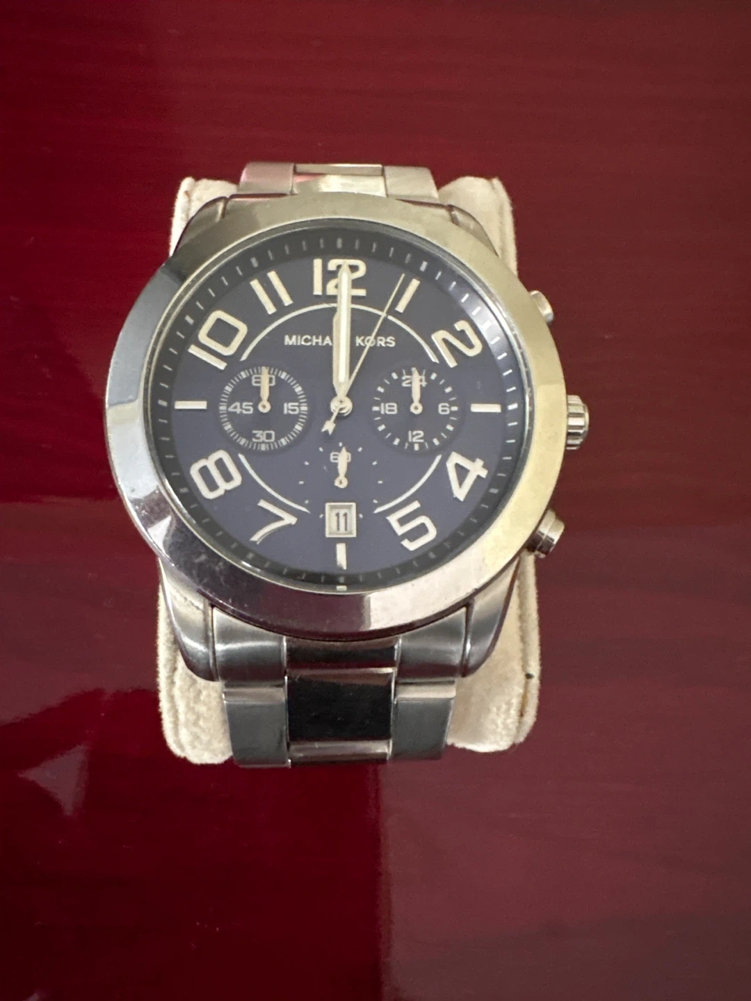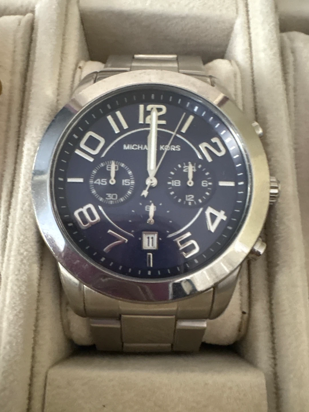 Michael Kors stainless steel chronograph watch with a blue dial. It features a date window and sub-dials for stopwatch functions. This watch is a stylish accessory for everyday wear.
