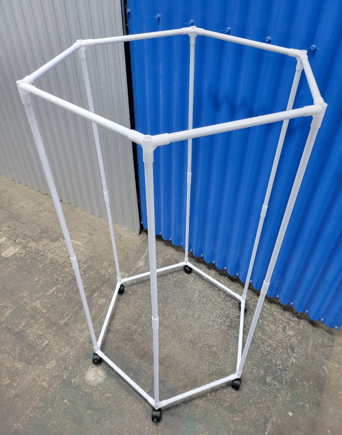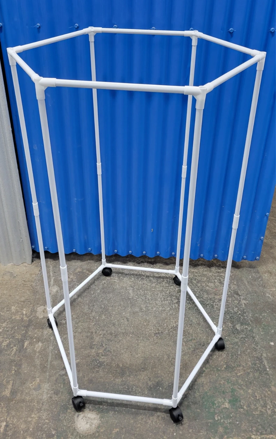 I'm selling a portable garment rack. It's white and has wheels, making it easy to move around your space. The rack comes in its original box with all the necessary components included