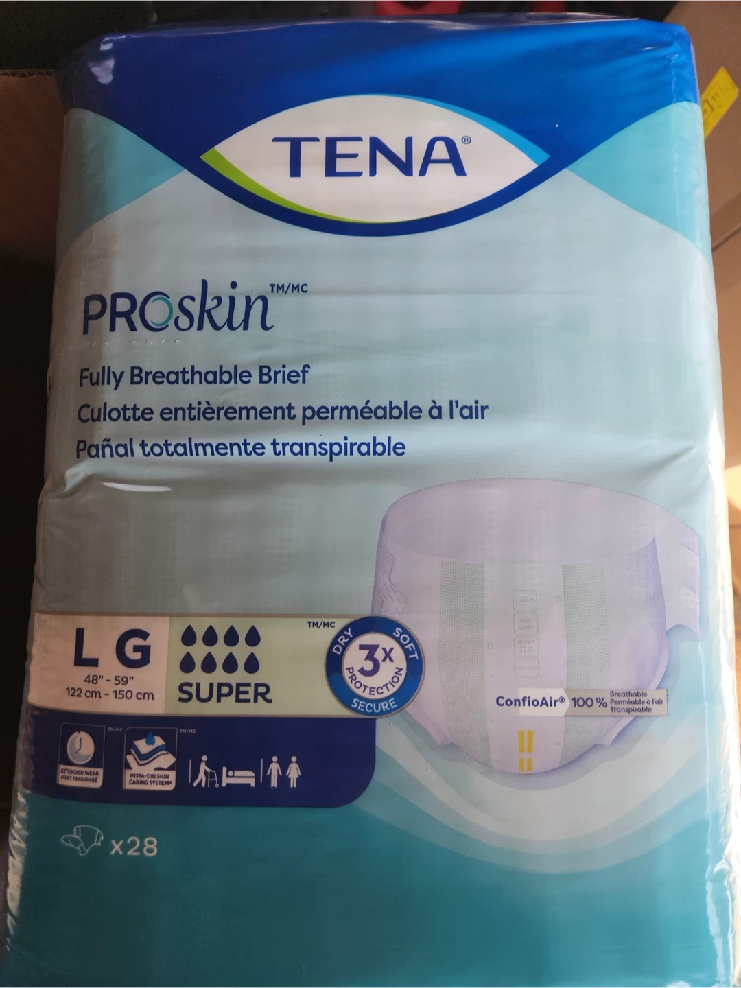 These TENA ProSkin briefs are designed for maximum absorbency and skin protection. They feature a fully breathable design to promote skin health. This package contains 28 briefs in size Large. $25 a pack, if you purchase 10 packs or more $20 each, porch pick up Kennedy and Eglinton.
