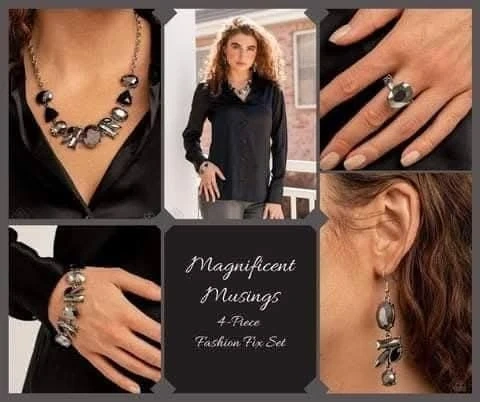 Selling a beautiful Paparazzi Magnificent Musings 4-Piece Fashion Fix Set! This set includes a necklace, ring, bracelet, and earrings, all with a stylish design. Perfect for adding a touch of elegance to any outfit
