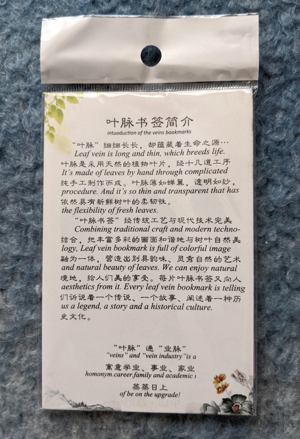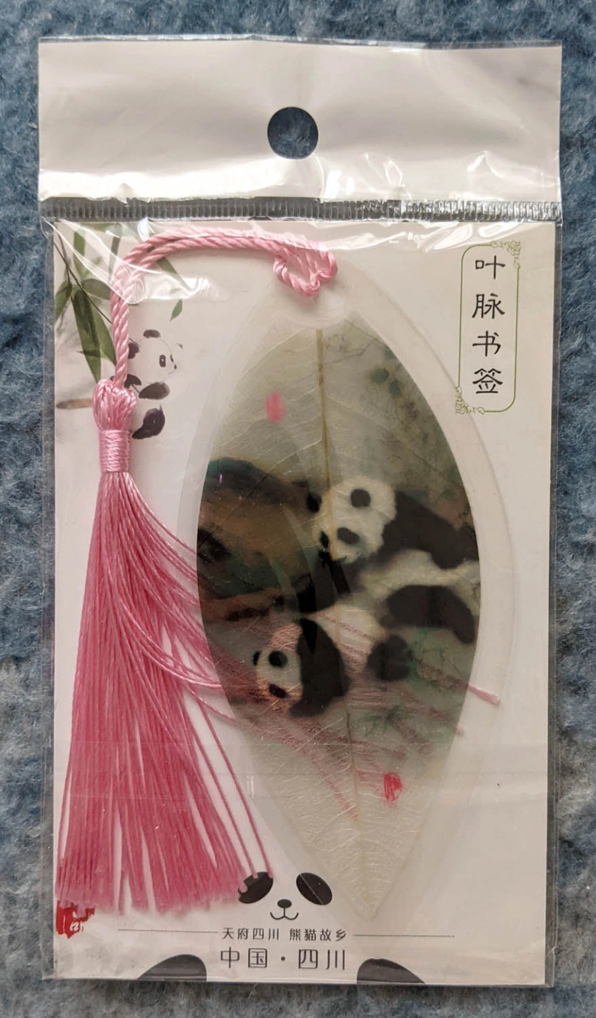Leaf vein bookmark with image of two pandas in sealed package, brand new, never used.