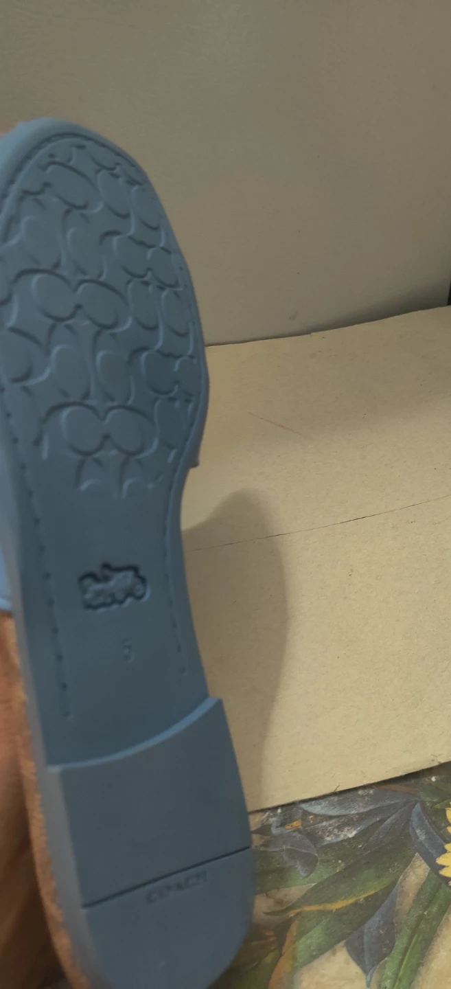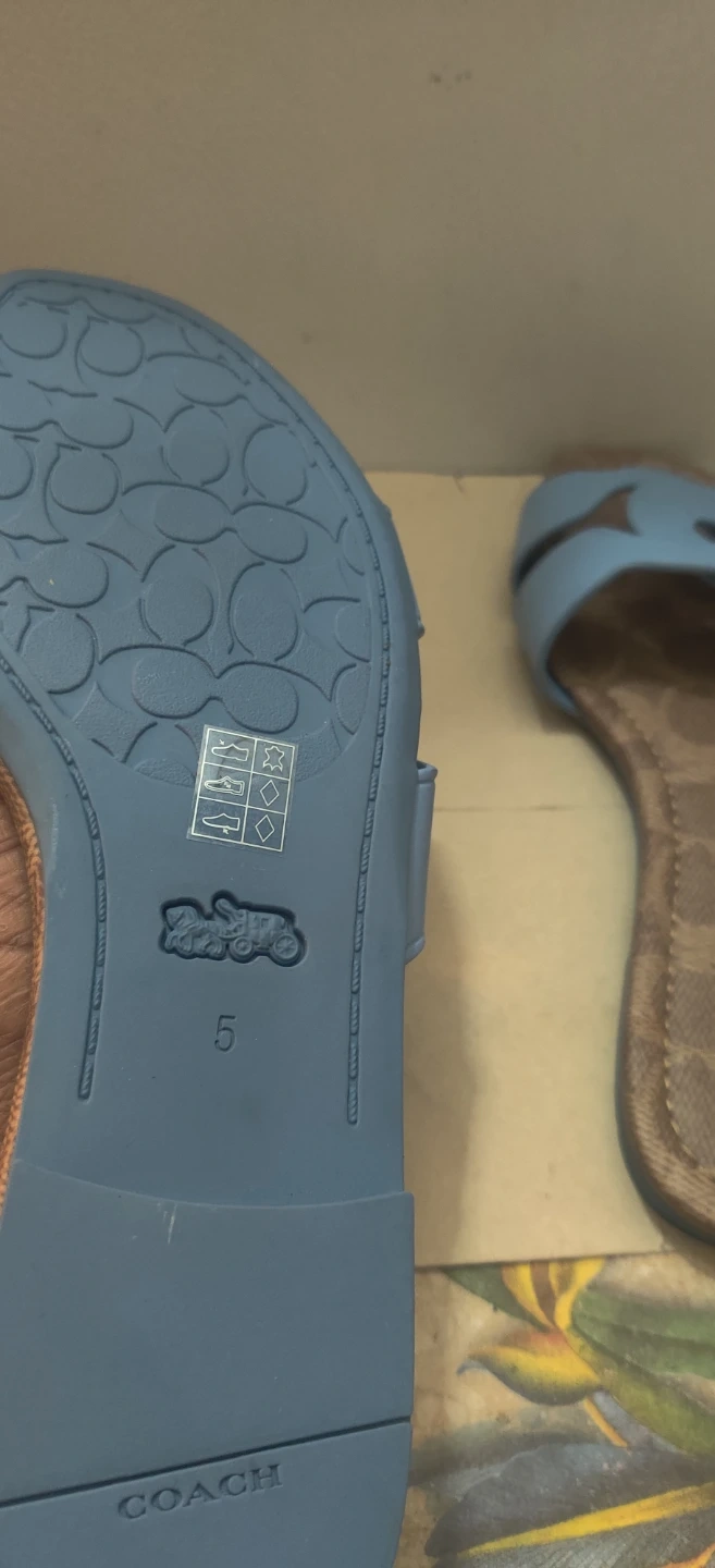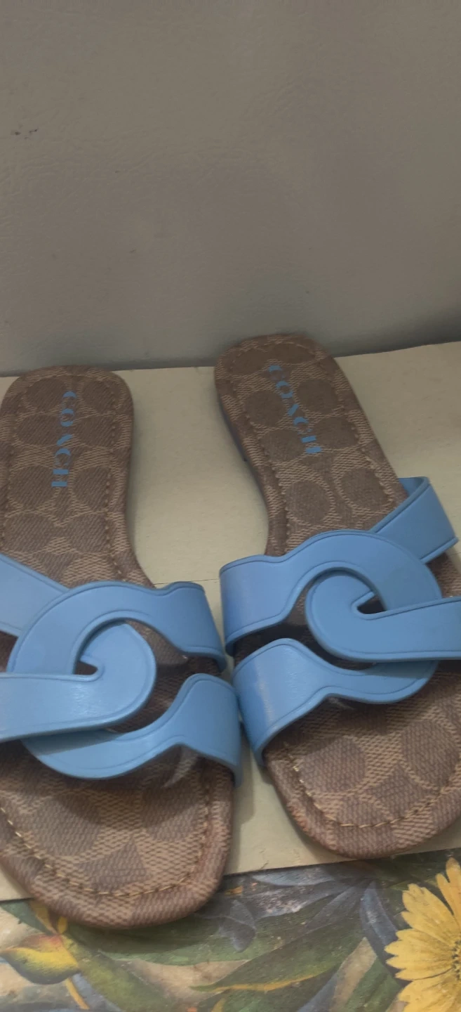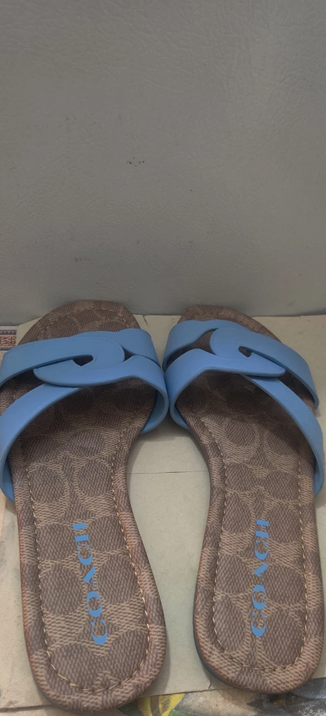 Selling a pair of Coach sandals in size 5. They feature a light blue strap and the classic Coach logo pattern on the footbed. Sandals is new but might have gotten marked from storage .I will not reserve this item .No holds .