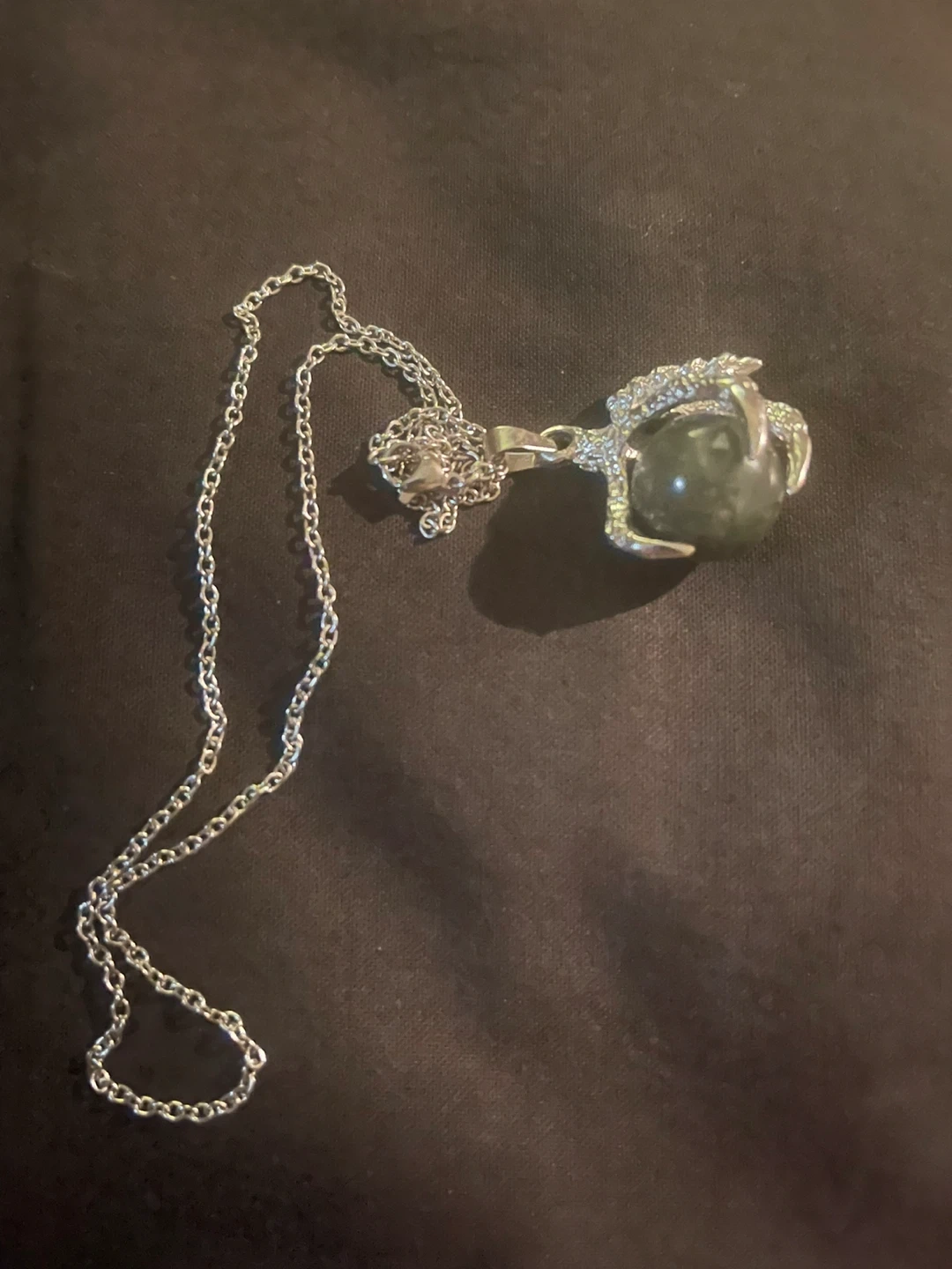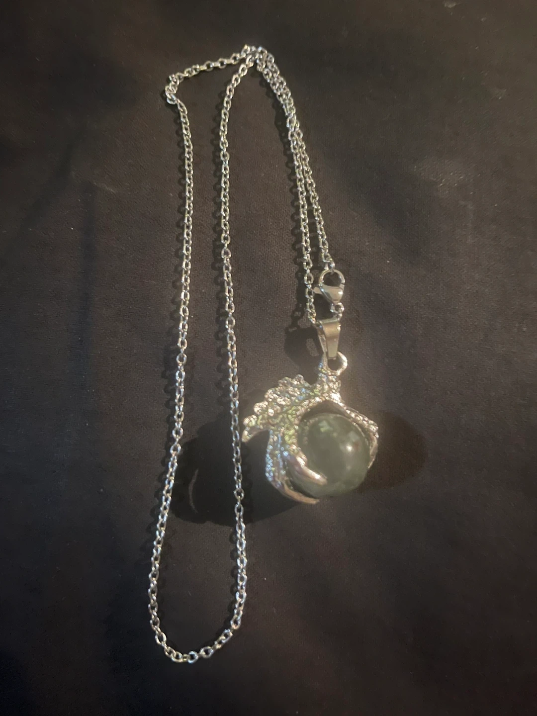 This unique necklace features a eagle claw gripping a smooth, gray stone. The chain is made of silver-toned metal. It's a statement piece for any fantasy enthusiast!