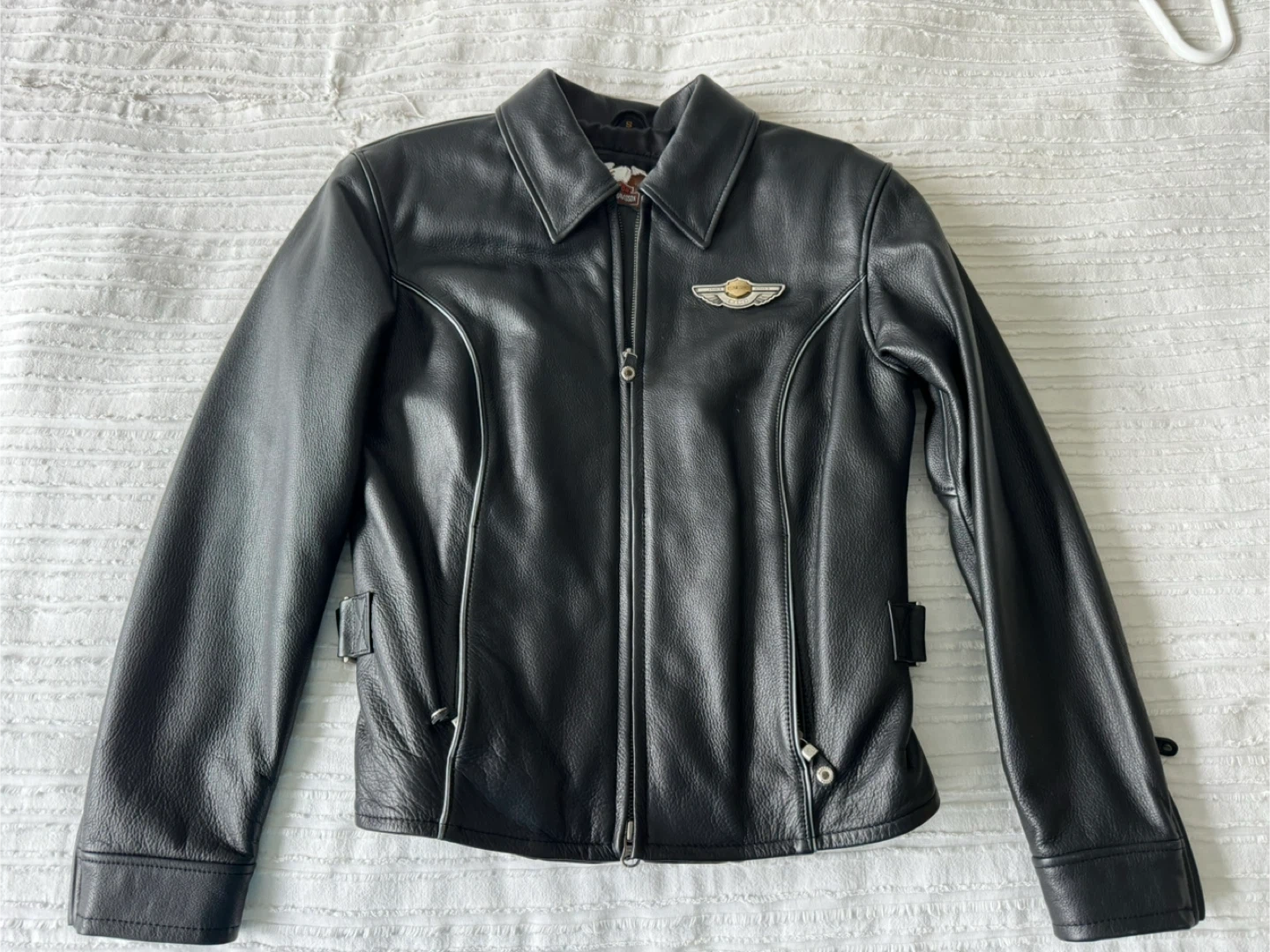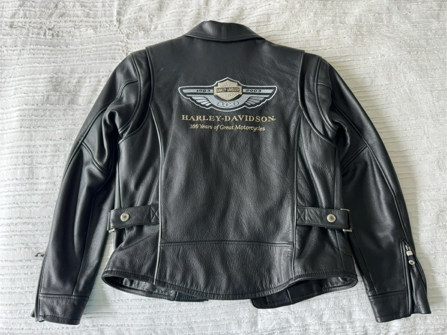 Woman’s Harley-Davidson leather jacket in new condition! The jacket is black and features the Harley-Davidson logo on the back, celebrating 100 years of great motorcycles