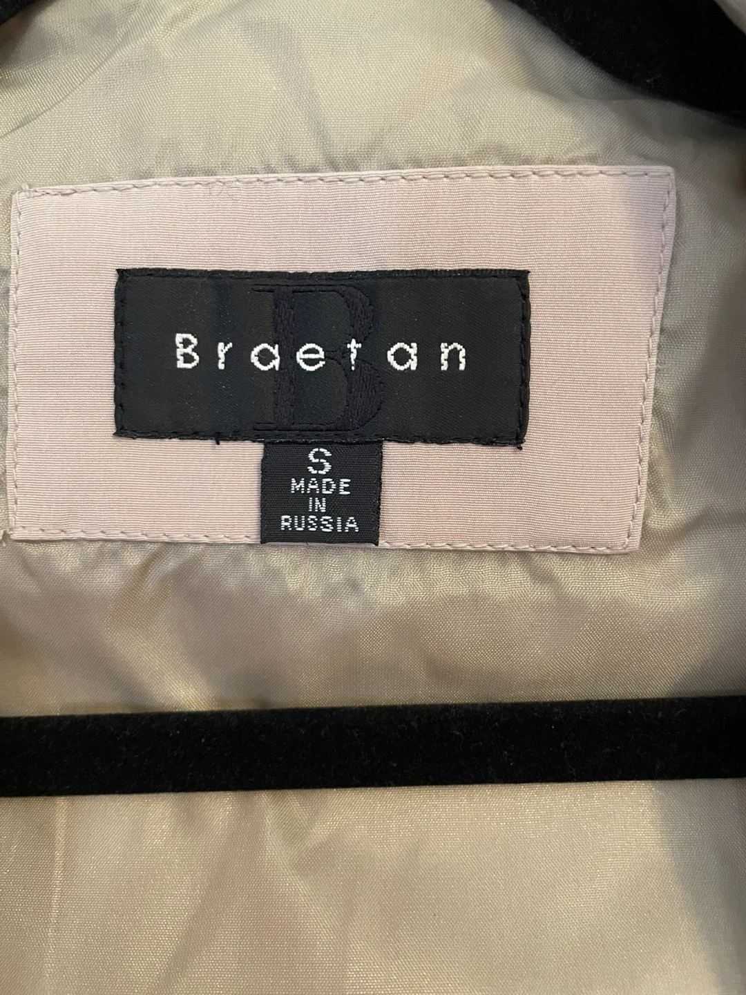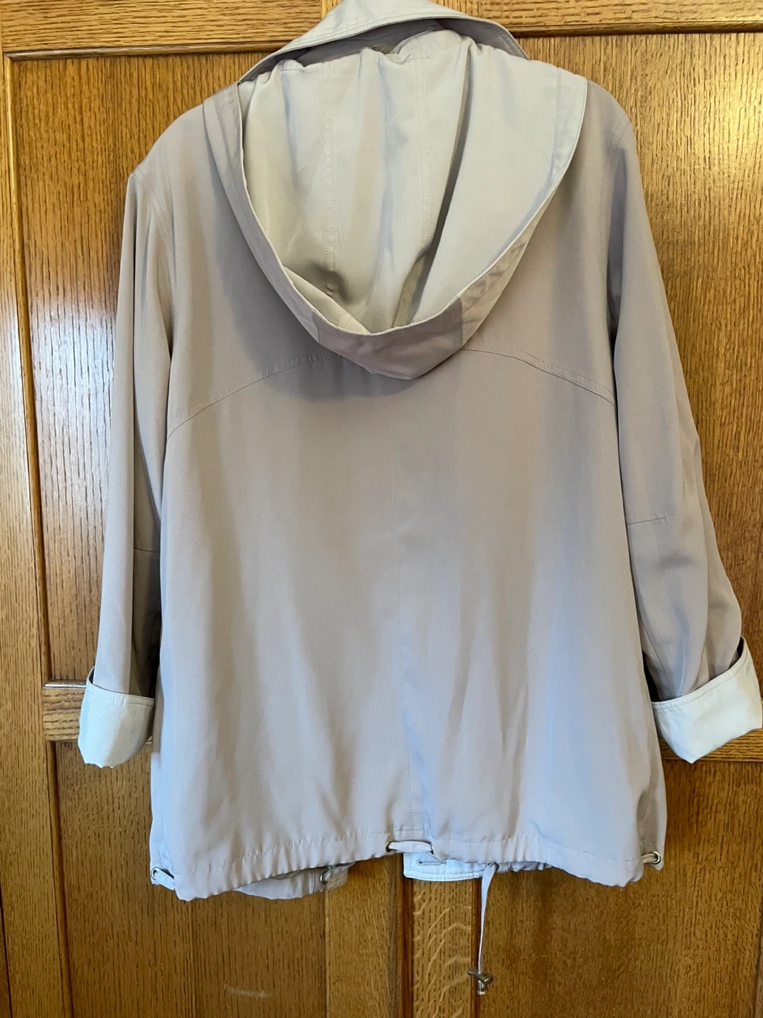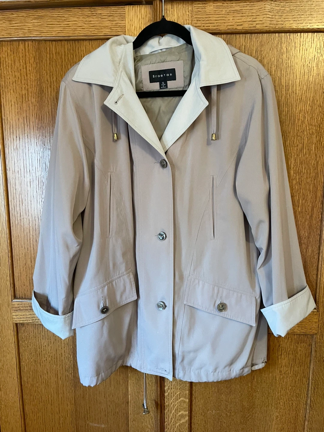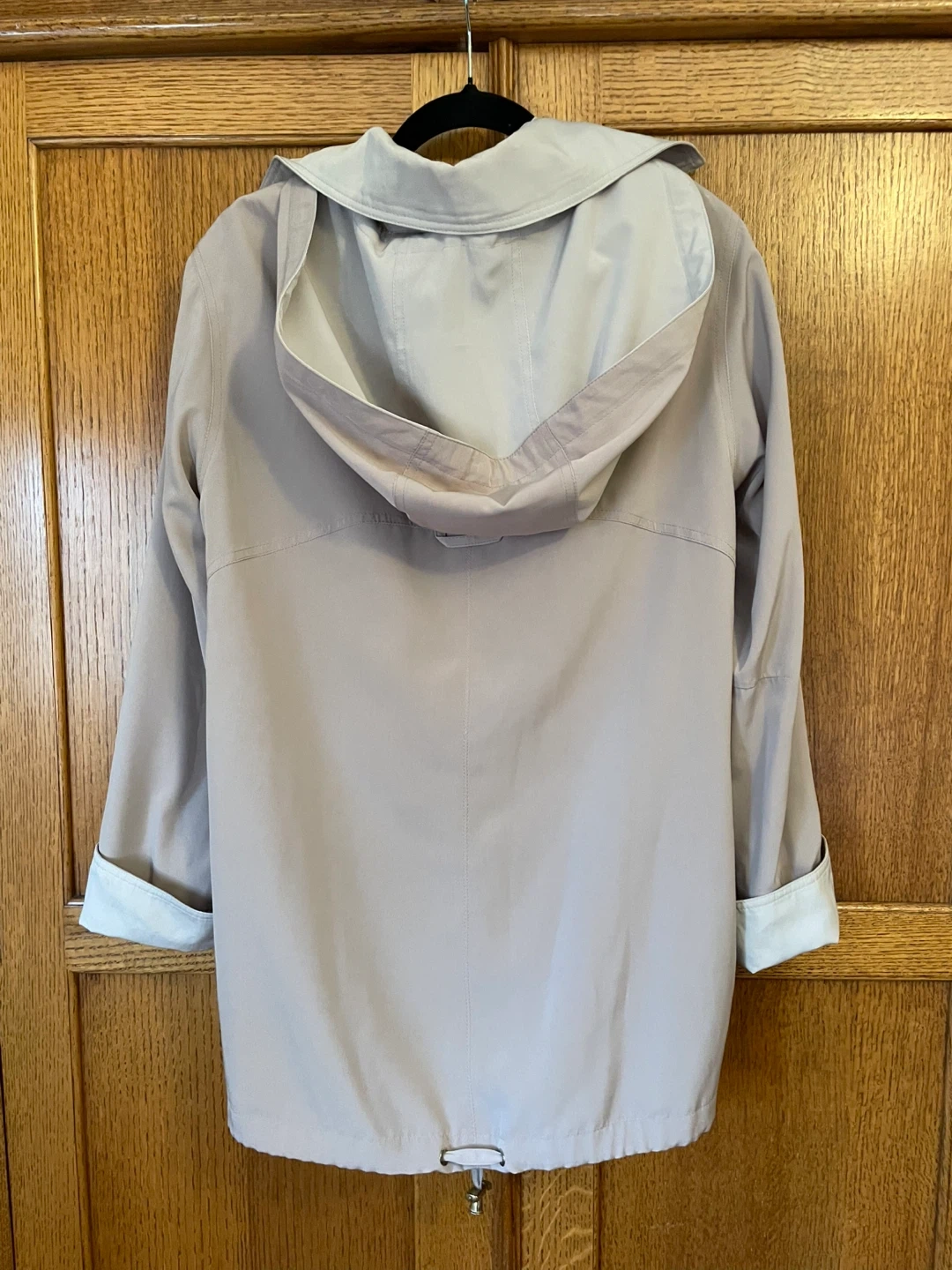 Elegant trench coat with a sleek design. Features a beige exterior with black accents. In excellent condition. Mid-thigh length. Size small.