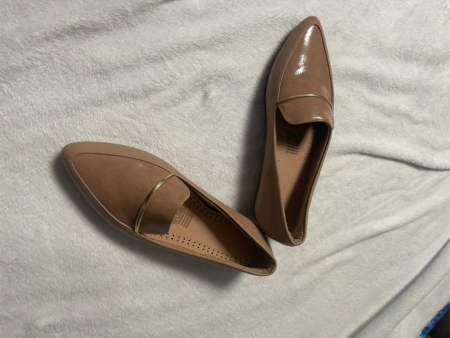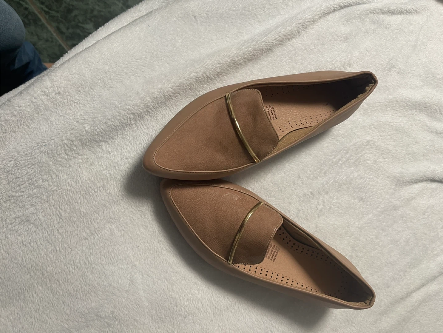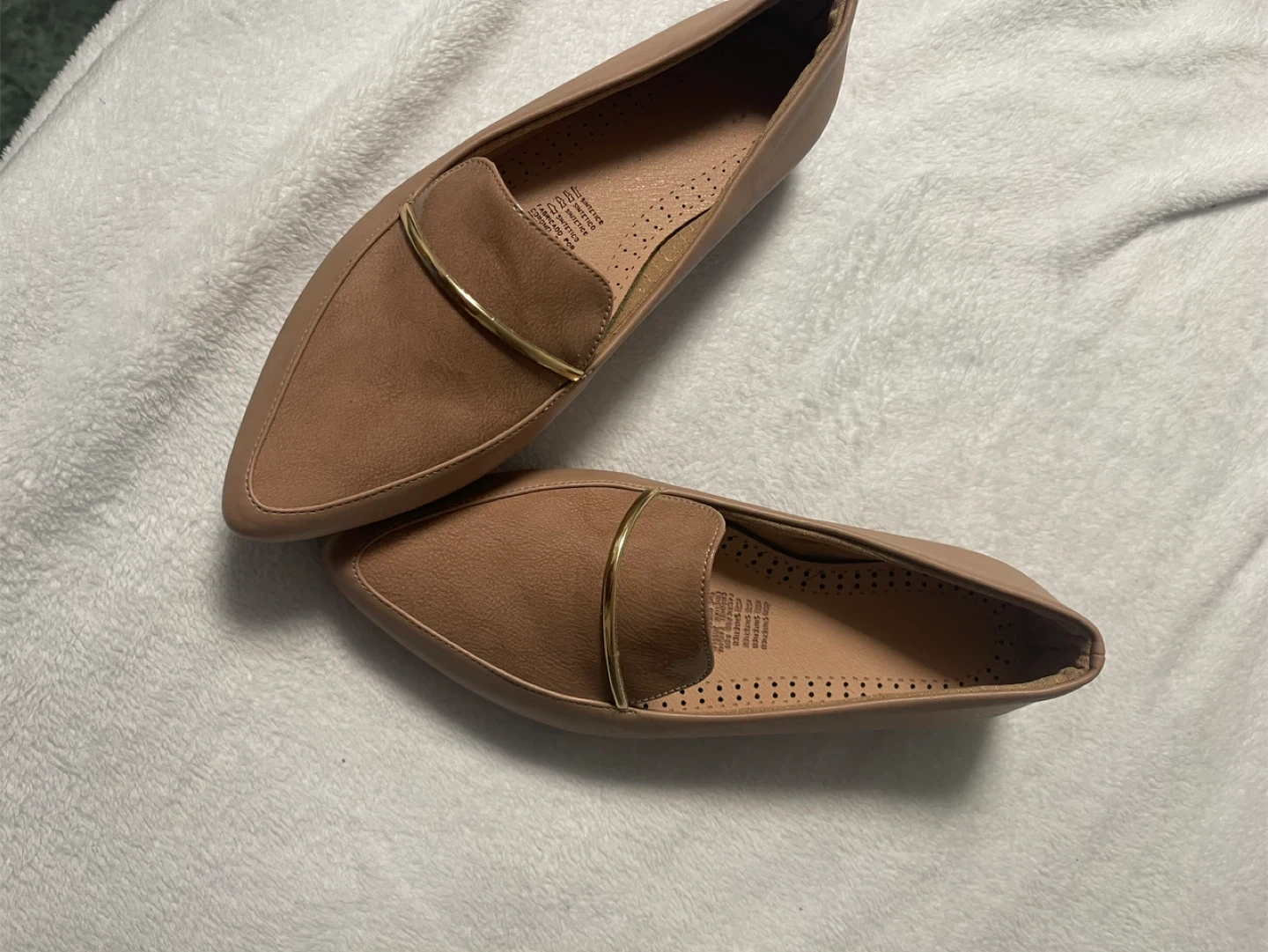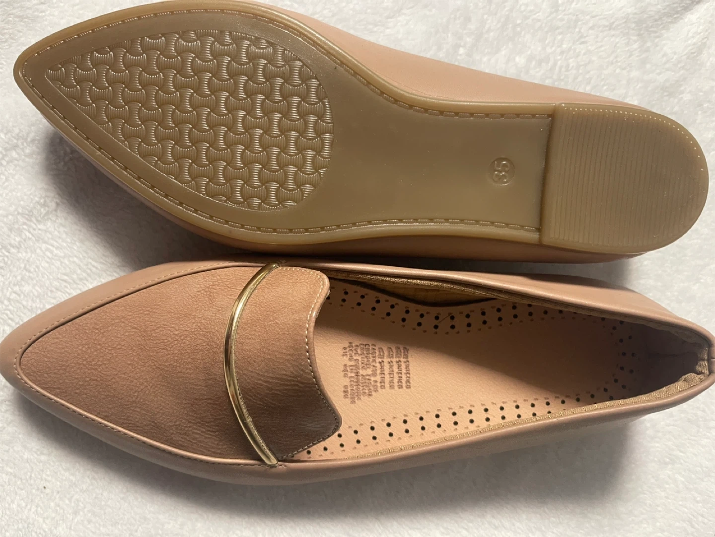 67Selling a pair of women's flats in a neutral color. They are a size 5 and feature a gold-toned accent. Perfect for everyday wear!