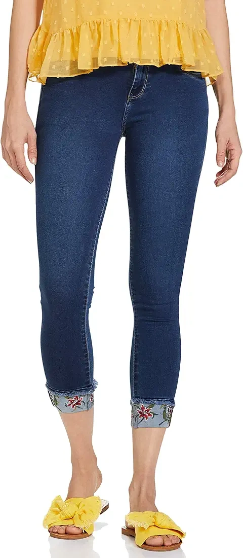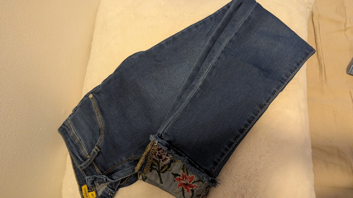 139Women's jeans in great condition! They're a stylish dark wash denim with a floral embroidered cuff. They are a perfect ankle length on a petite person!