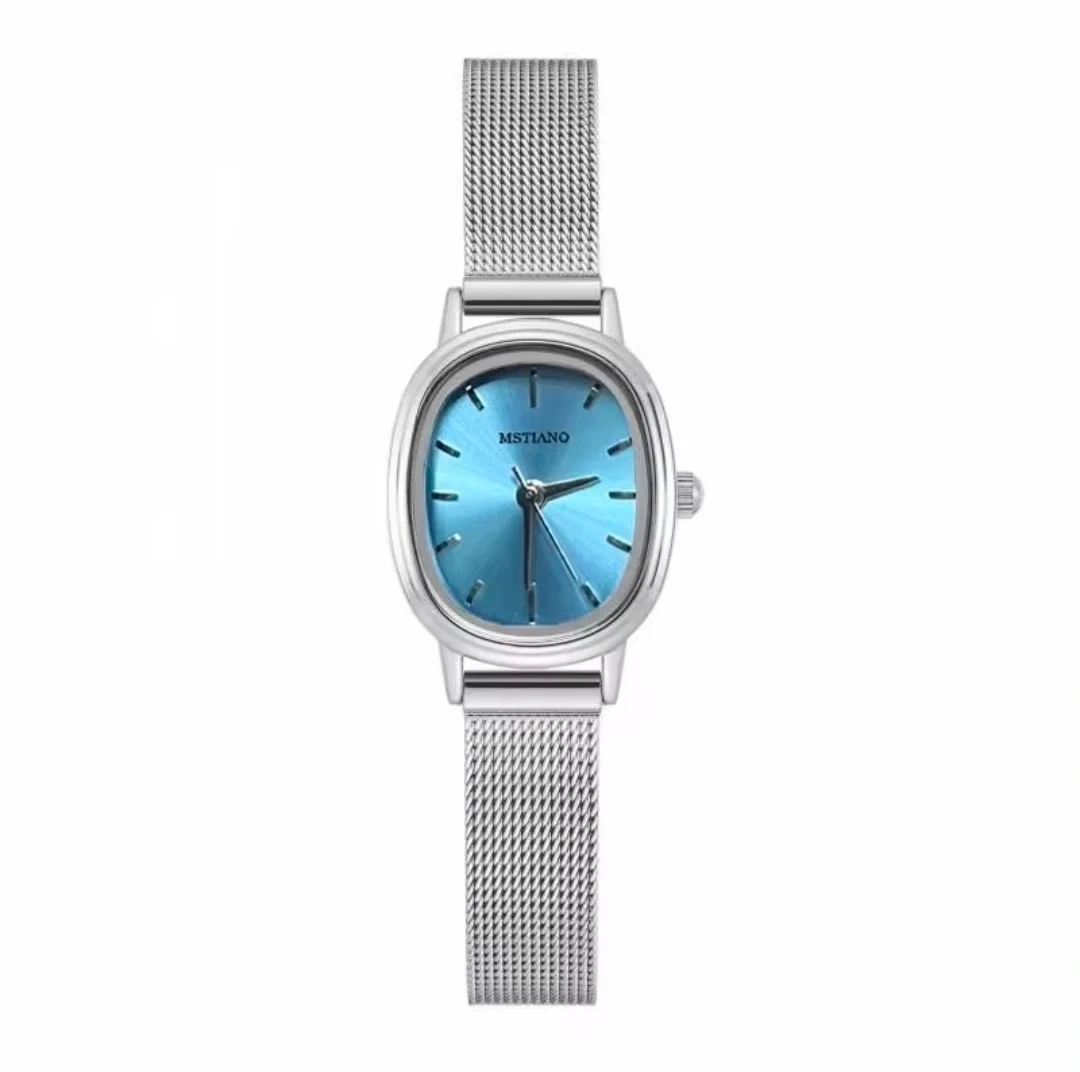 10This elegant watch features a smooth oval case paired with a silver mesh band for a refined, modern look. The gradient blue dial adds depth and sophistication, complemented by minimalist silver hour markers and hands. A stylish piece that transitions effortlessly from day to evening.
