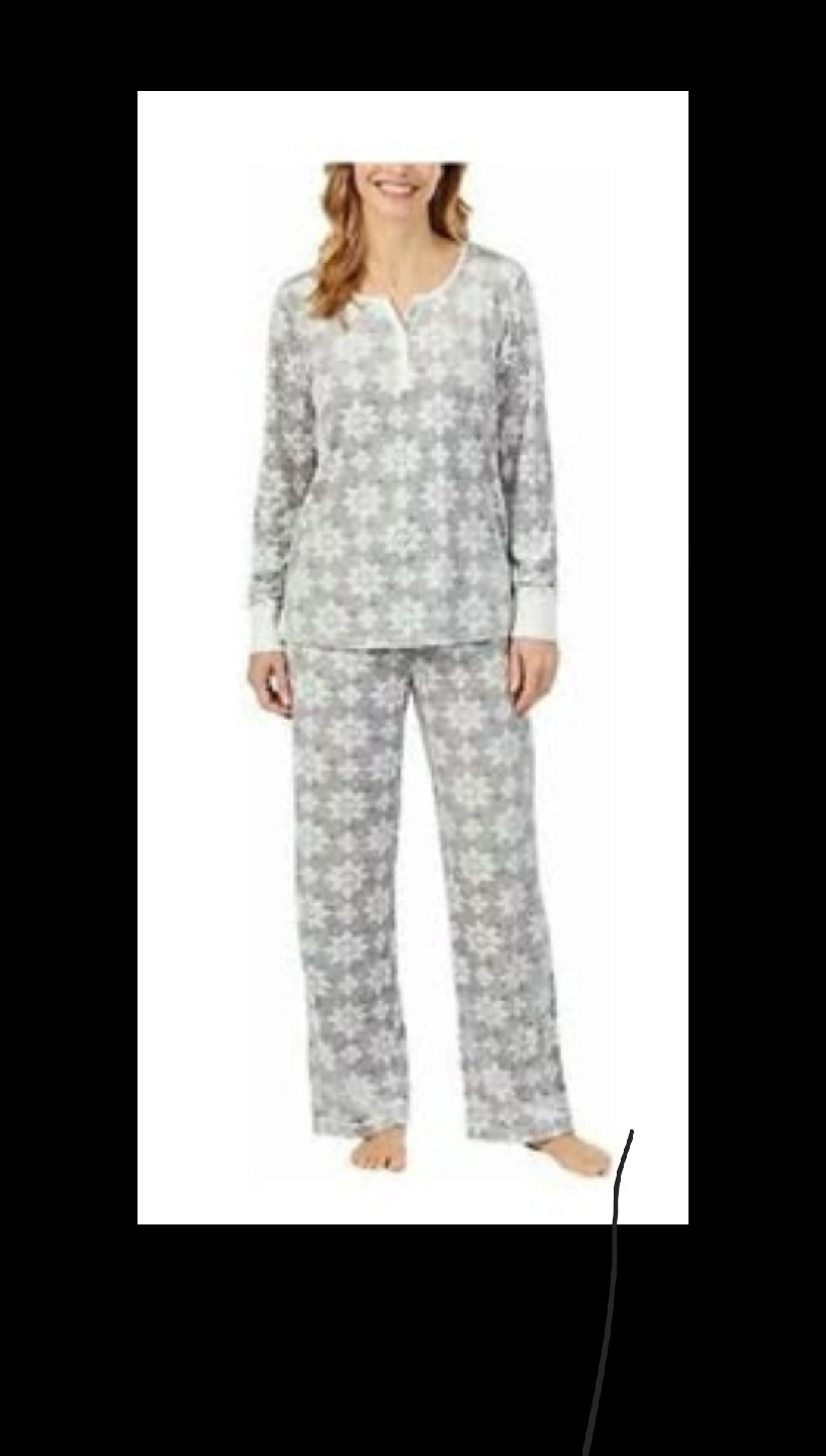 This is a women's pajama set with a snowflake pattern. It includes a long-sleeved top and pants. The material appears to be soft and comfortable for lounging or sleeping.Item size is large (14-16) & color is white/grey & it's new and has product tag on it