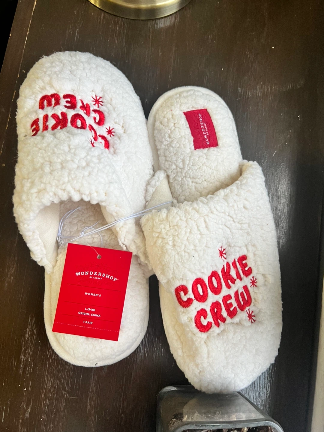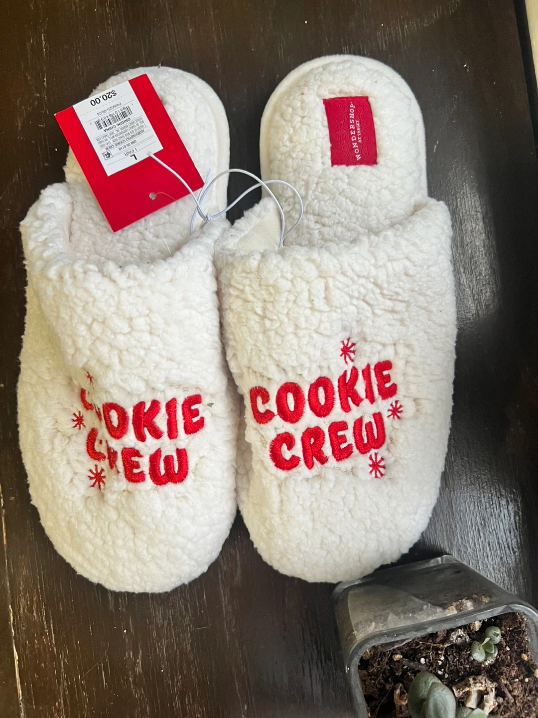 20Cozy up with these Wondershop Cookie Crew slippers! They're a size large (9-10) and feature a fun cookie design. Perfect for keeping your feet warm and festive around the house