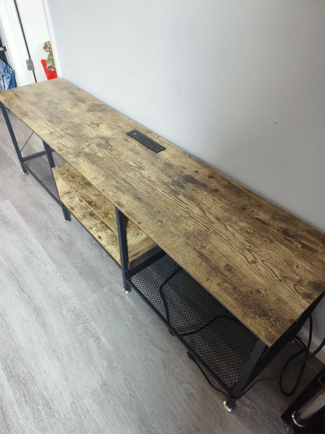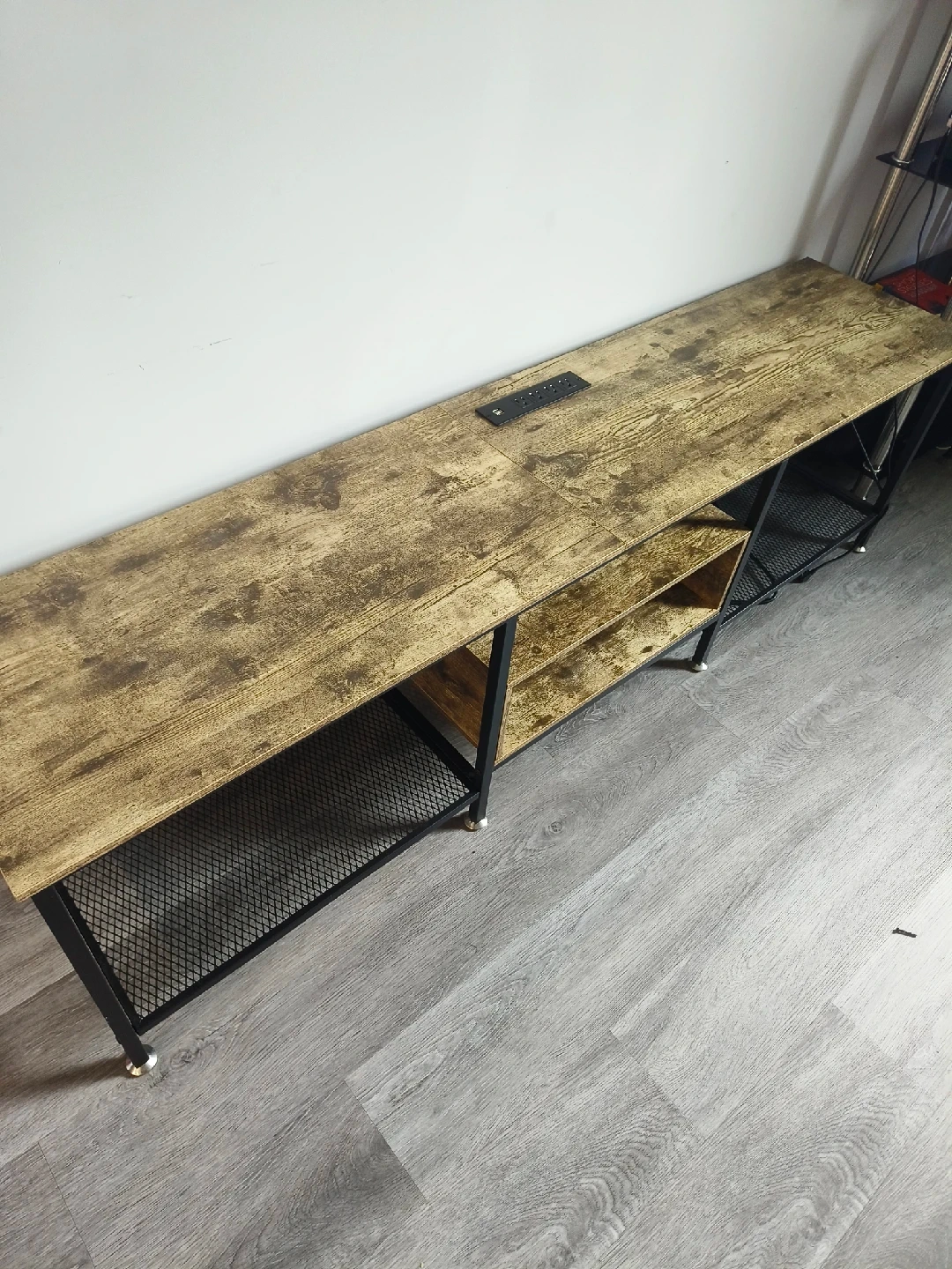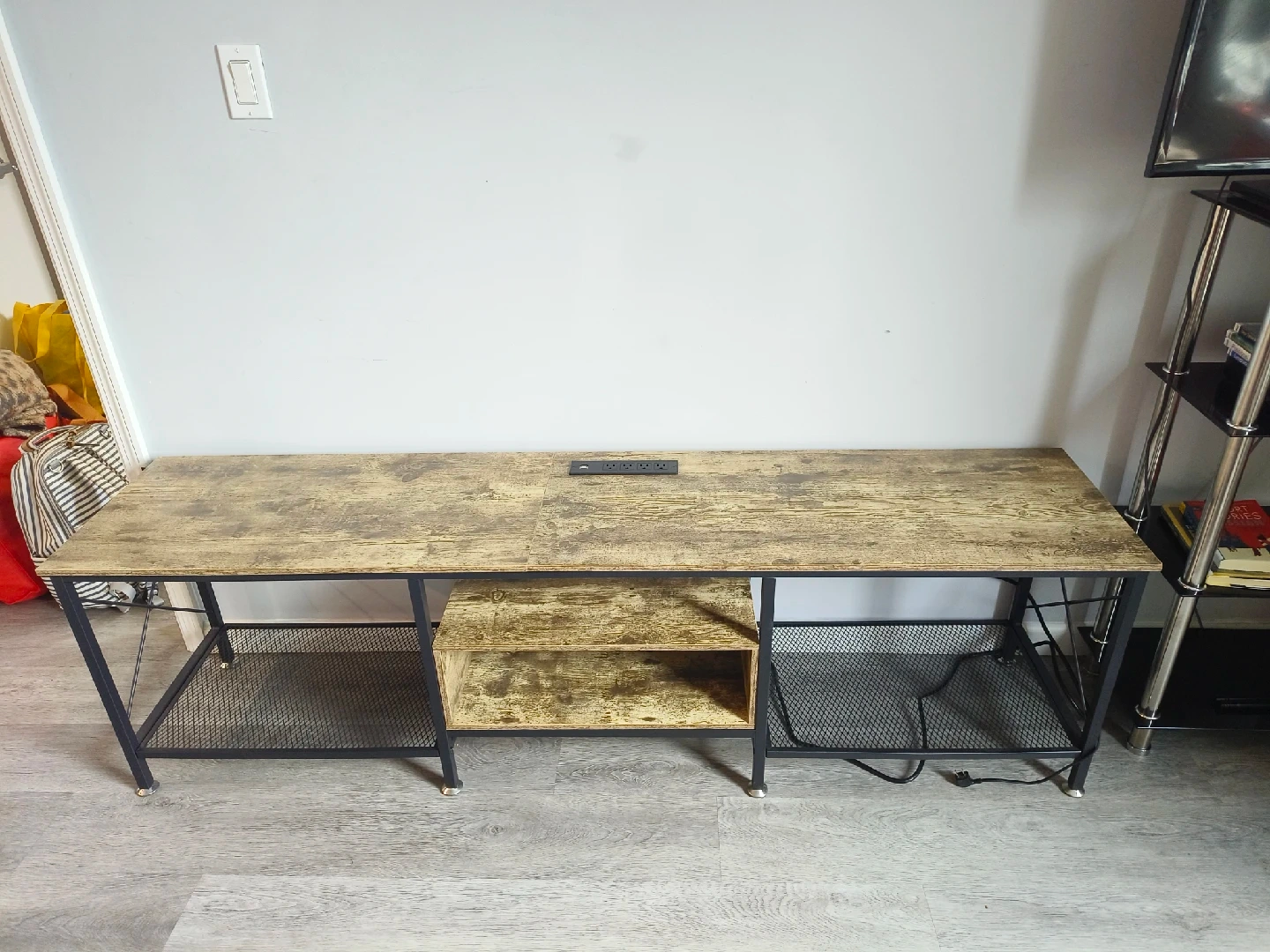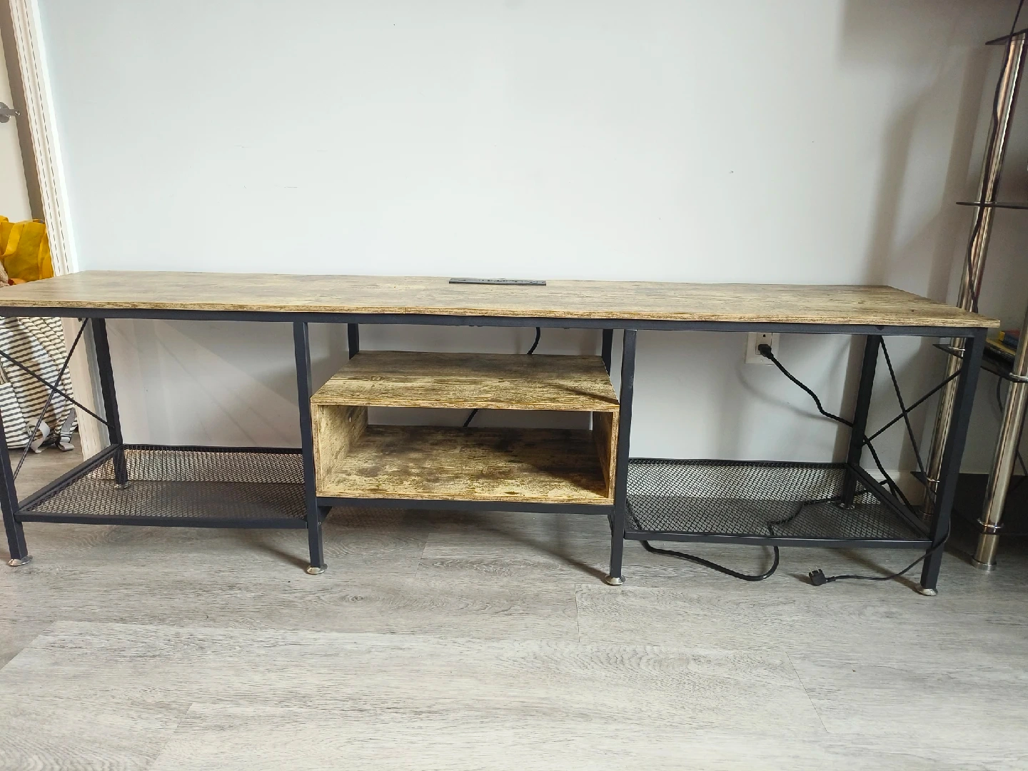 39This is a wood-look top TV stand with a metal frame. It has a shelf in the middle and mesh-style shelves on either side. It also has a built-in power strip on the top surface for your electronics. Pick up only, I have an elevator.