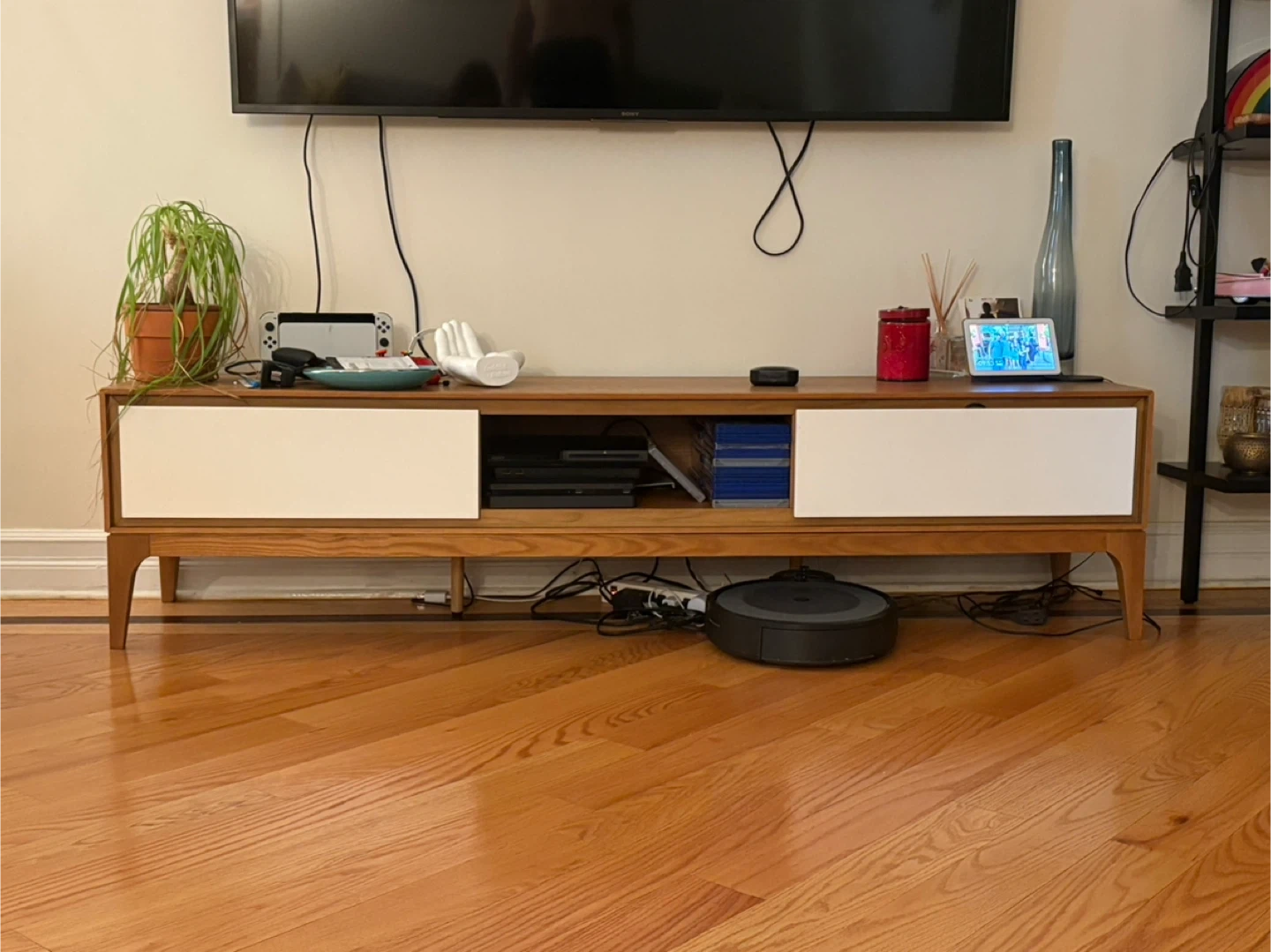 Selling a stylish media console with a wood frame and white drawers. It's perfect for organizing your entertainment setup and adding a mid-century modern touch to your living room