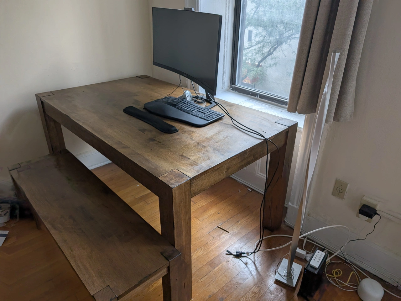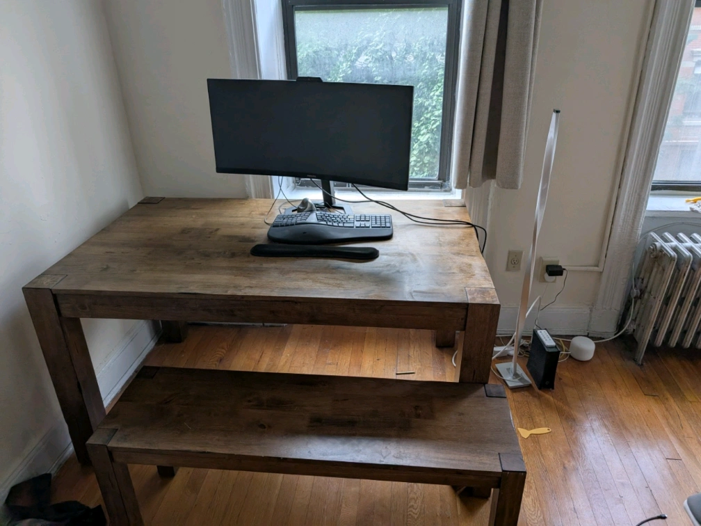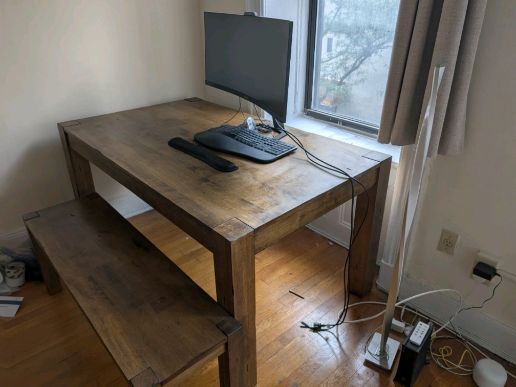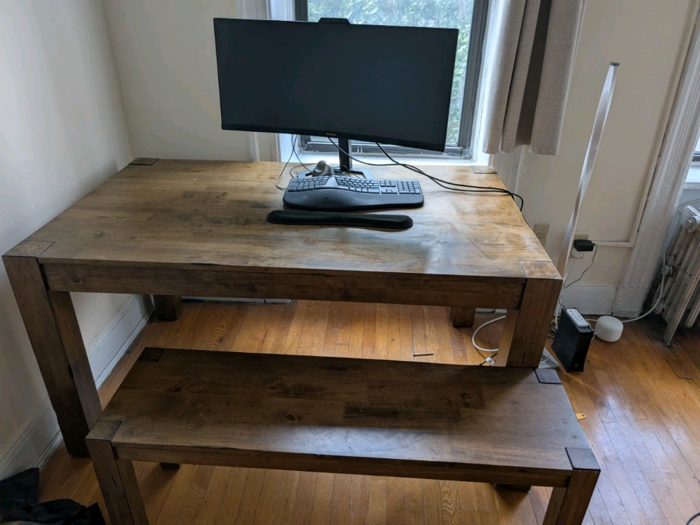 67Selling a sturdy wood dining table with a matching bench. It's perfect for a dining room or kitchen. The table has a nice, solid feel and is in good condition. Great for family meals or gatherings!