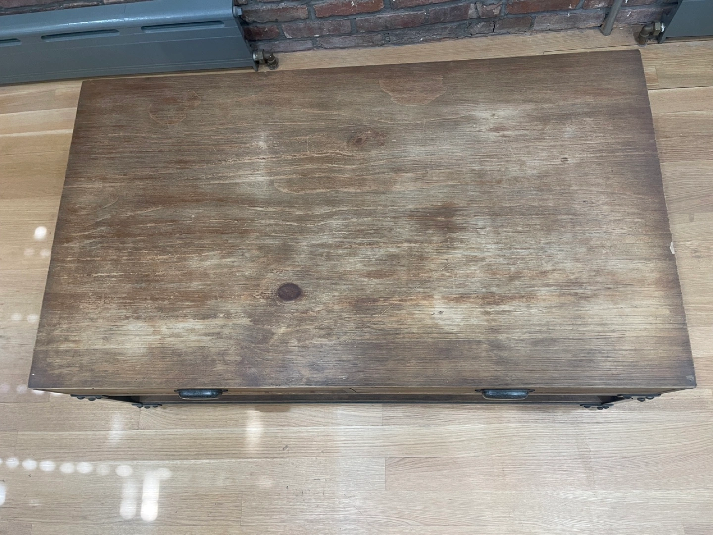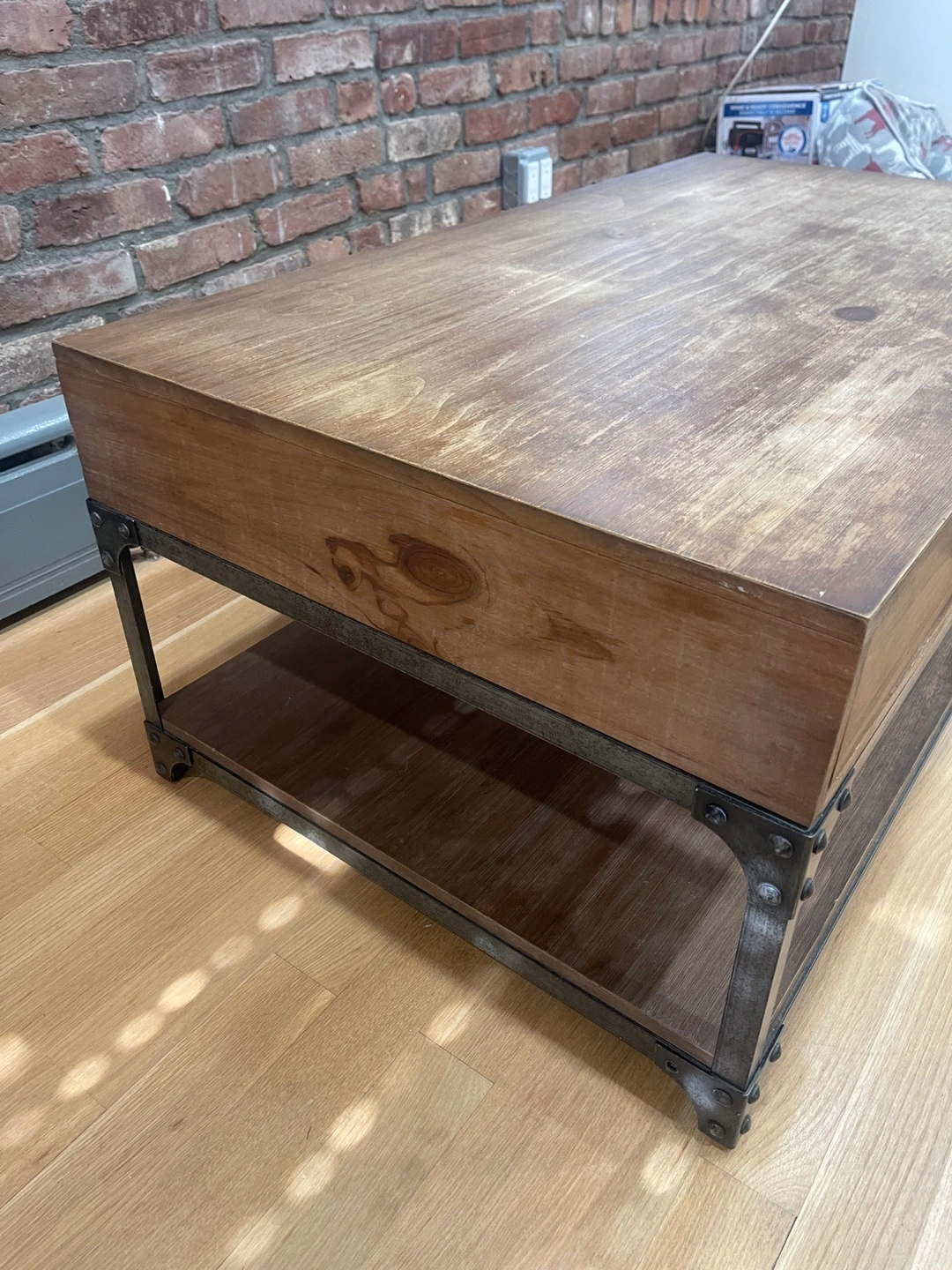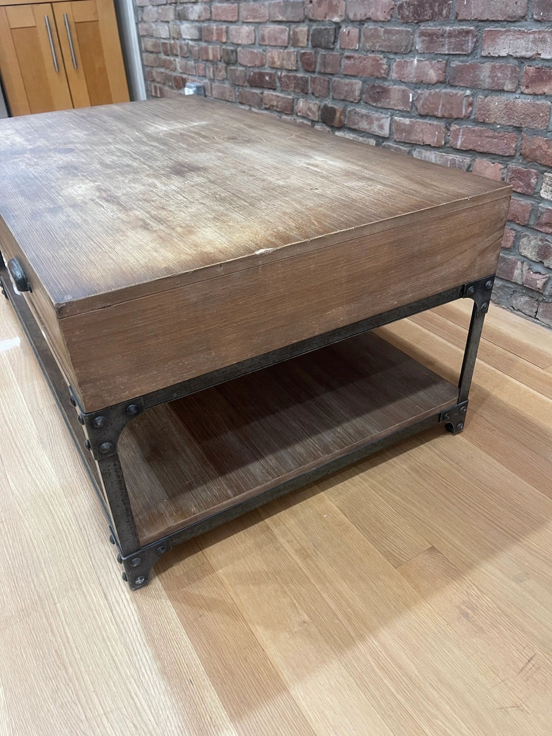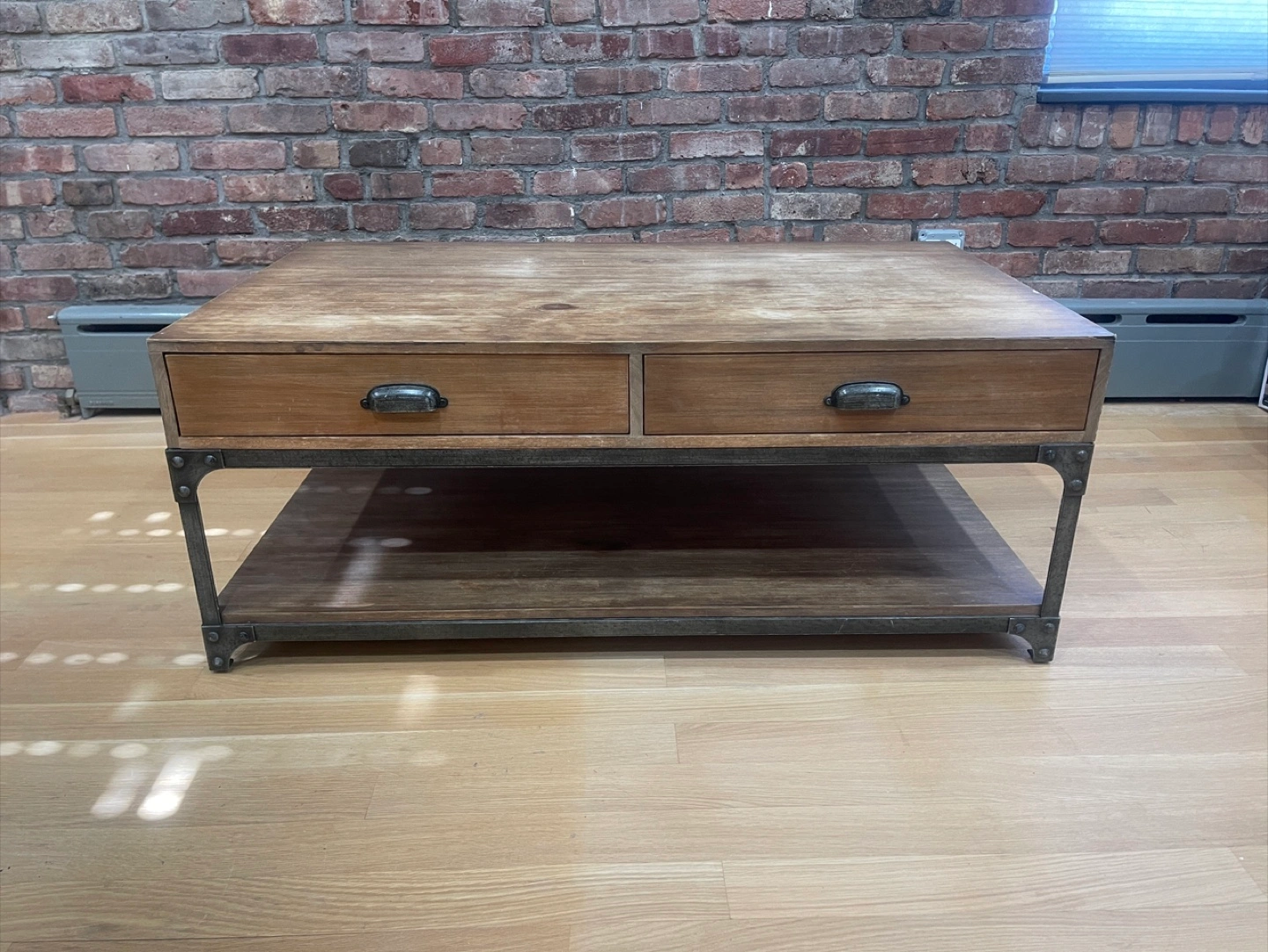 Selling a wood coffee table with a metal frame and two drawers. It has a rustic look and a shelf at the bottom for storage. Perfect for a living room or den! Sold as is. Item located in Williamsburg, Brooklyn. Buyer arranges for pickup and transport. Measurements are approximate. Final Sale