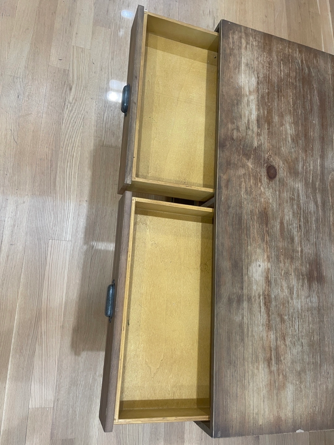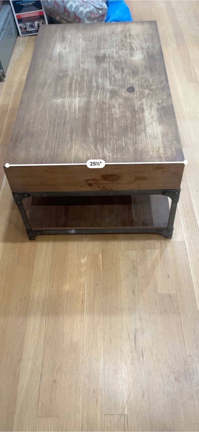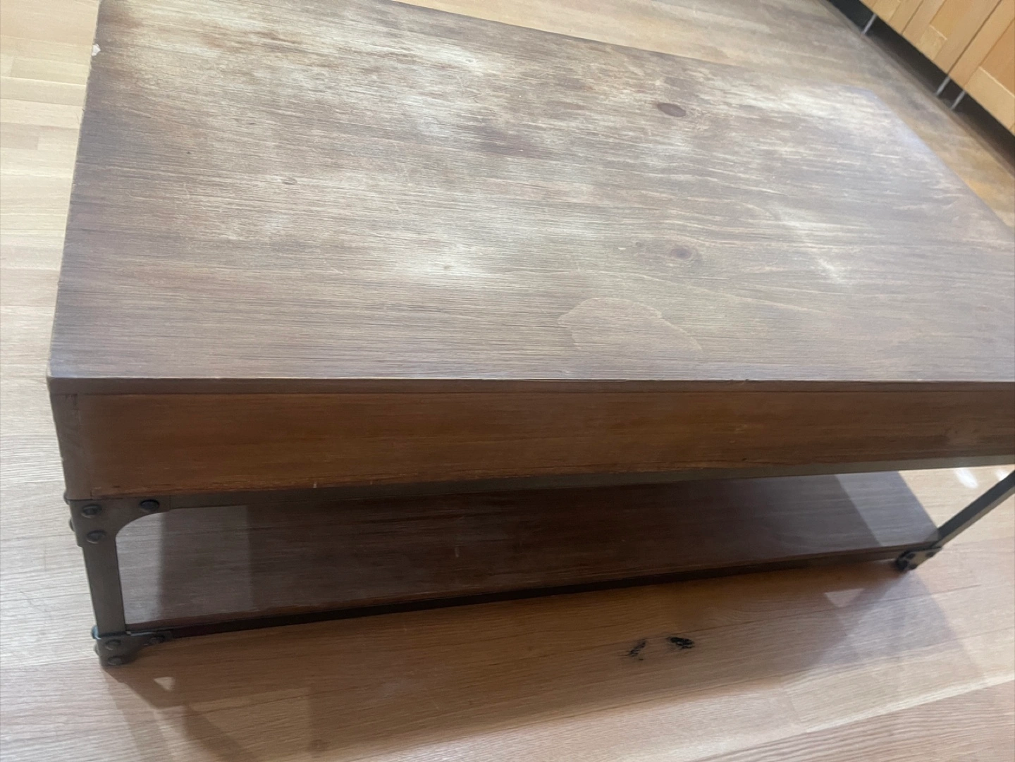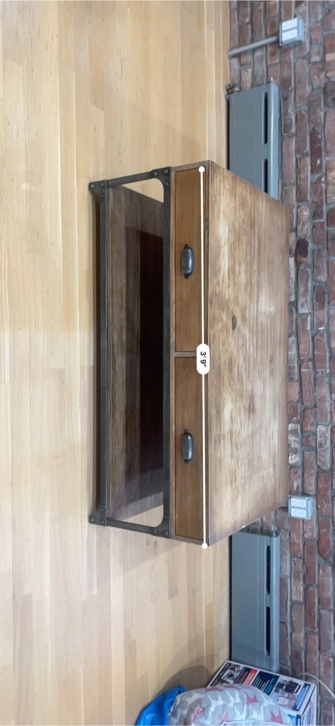 Selling a wood coffee table with a metal frame and two drawers. It has a rustic look and a shelf at the bottom for storage. Perfect for a living room or den! Sold as is. Item located in Williamsburg, Brooklyn. Buyer arranges for pickup and transport. Measurements are approximate. Final Sale