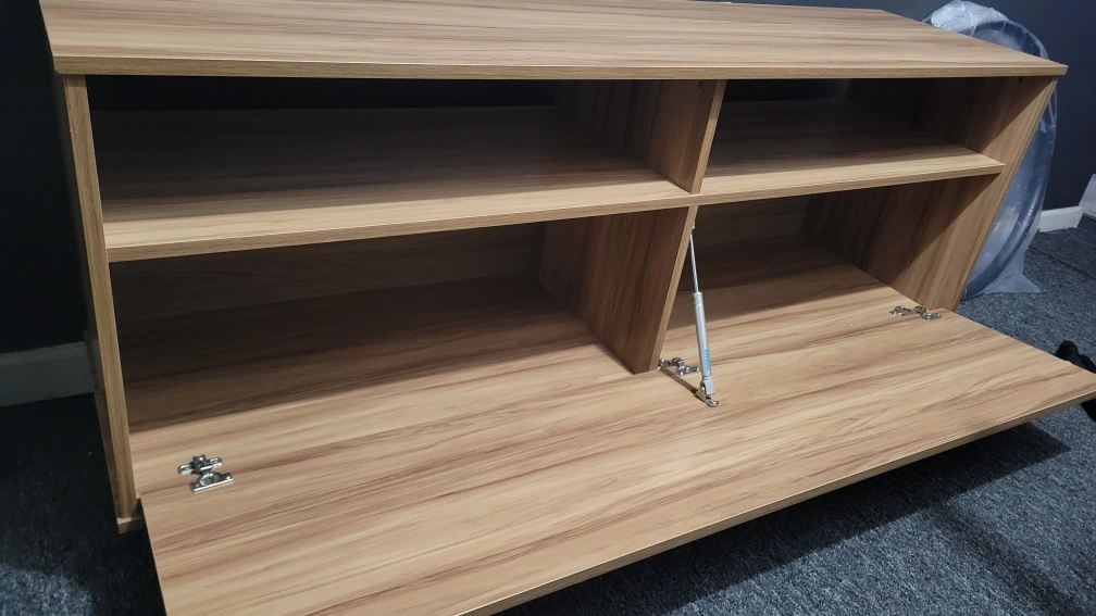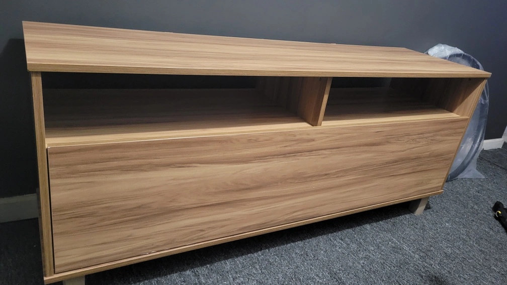 13Selling a wood TV stand with storage. It features open shelves and a cabinet with a door. The stand is in good condition and perfect for organizing your entertainment area