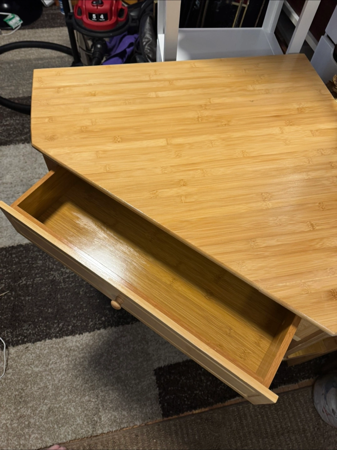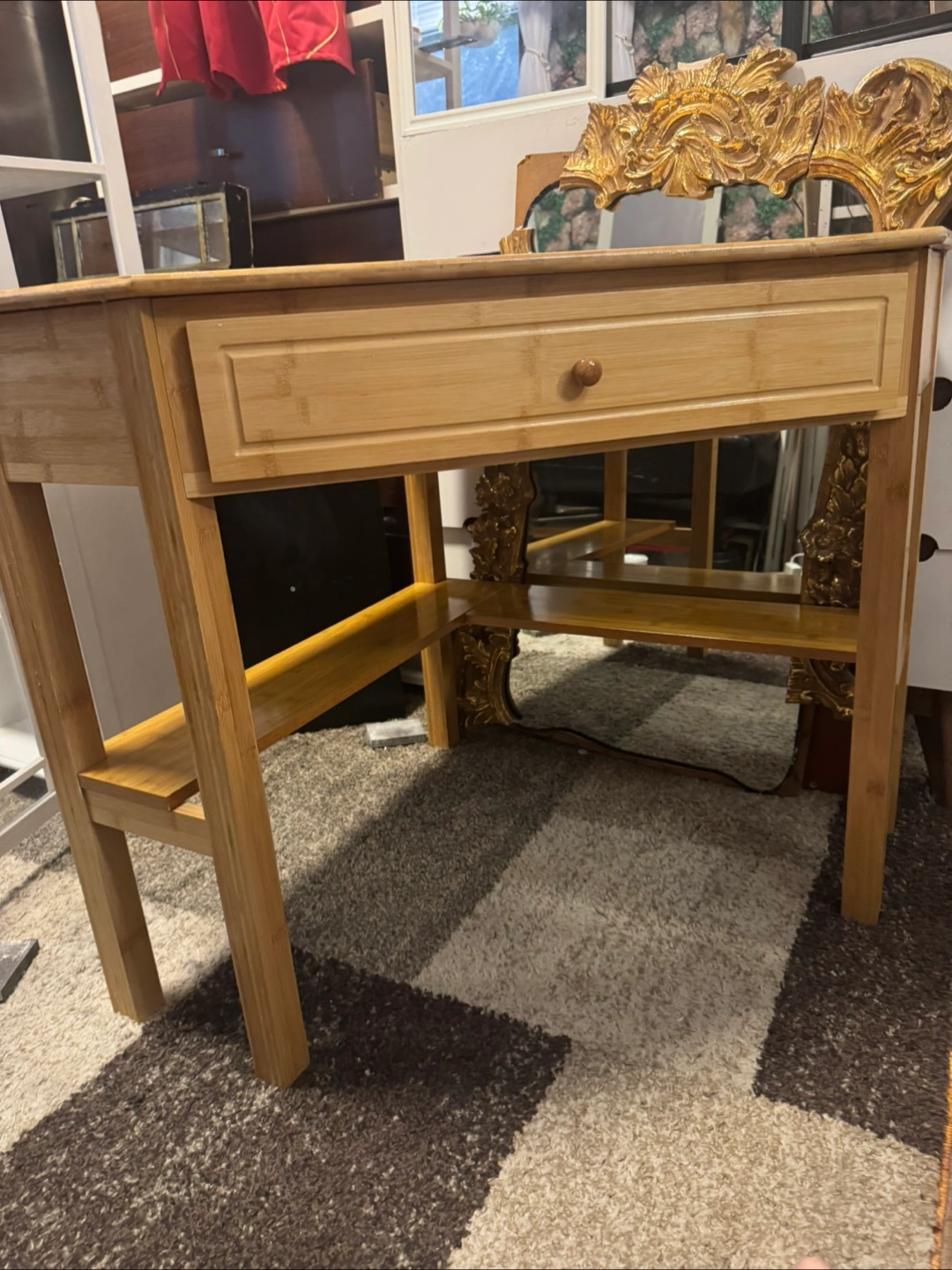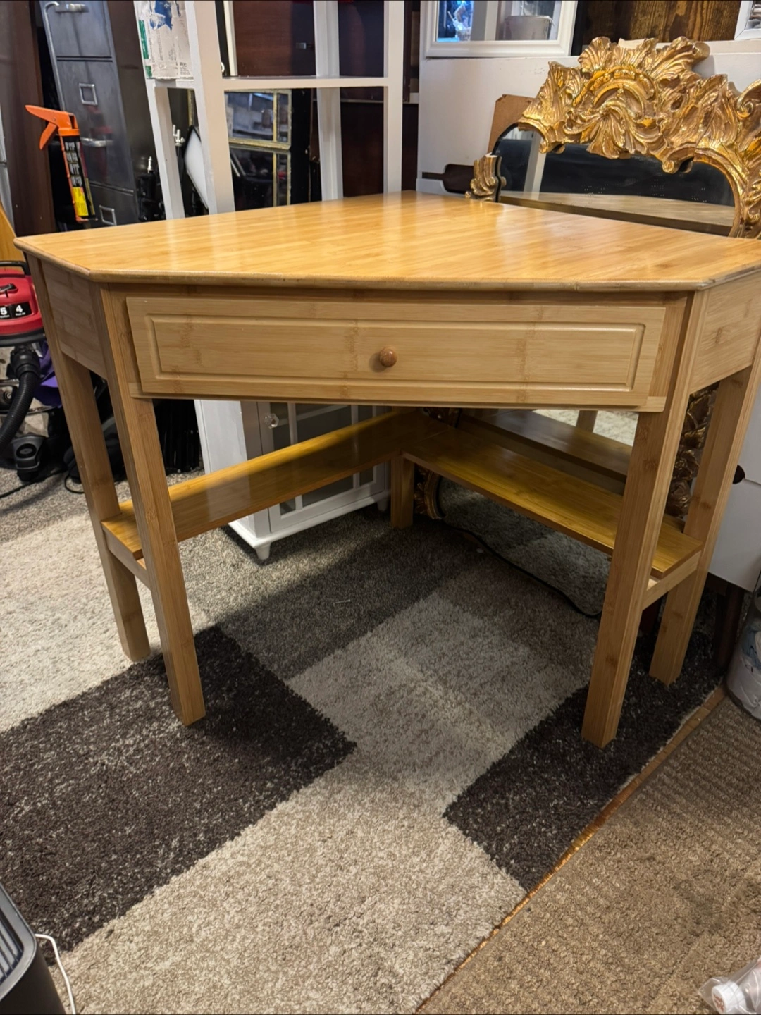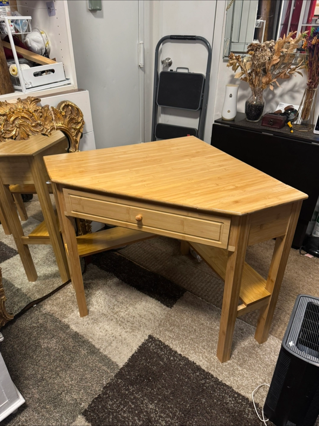 Selling a 30x30x30” corner desk with a spacious drawer and handy shelving underneath! It's a light wood color, bamboo/composite I think and in good shape. Perfect for small spaces or to fit in a corner of a room. Can store all kinds of supplies on the shelving underneath. I like the natural color so I just put a protective coat of SealCoat over it. Selling because I have no corners to put it in lol
