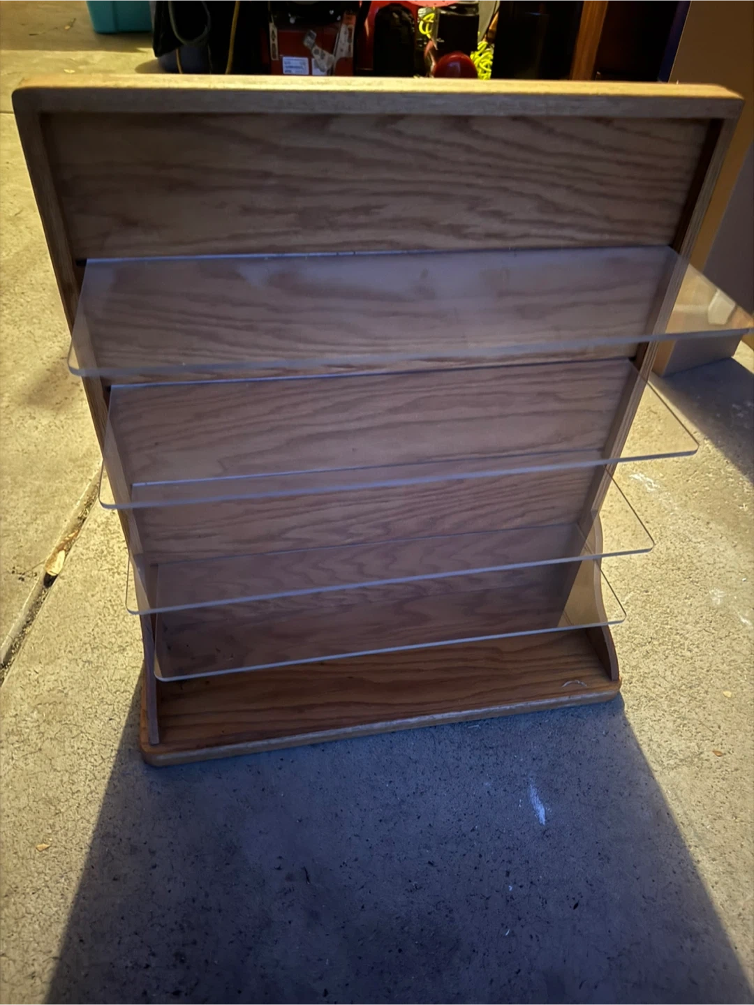 10Selling a wooden display shelf featuring clear acrylic shelves. It's in good condition and perfect for showcasing items or organizing your space. The wood has a light finish, and the acrylic shelves are sturdy and clear. Great for retail displays or home organization!