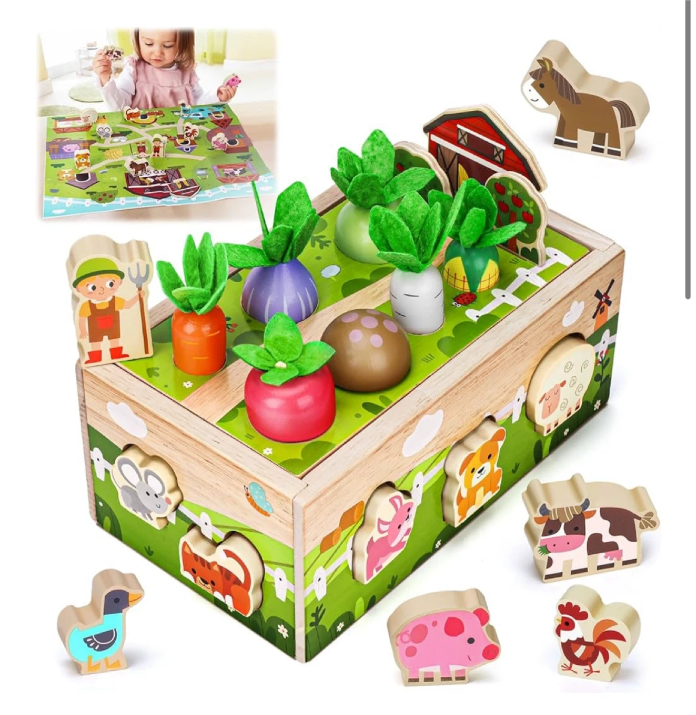 This is a cute wooden toy where you can harvest veggies and match animals to their spots on the farm box! It's a fun and educational game for little ones