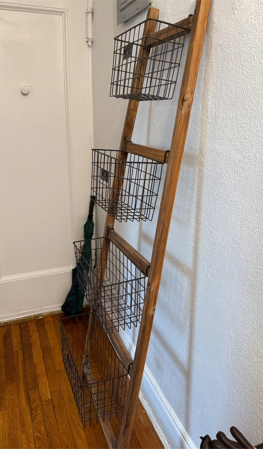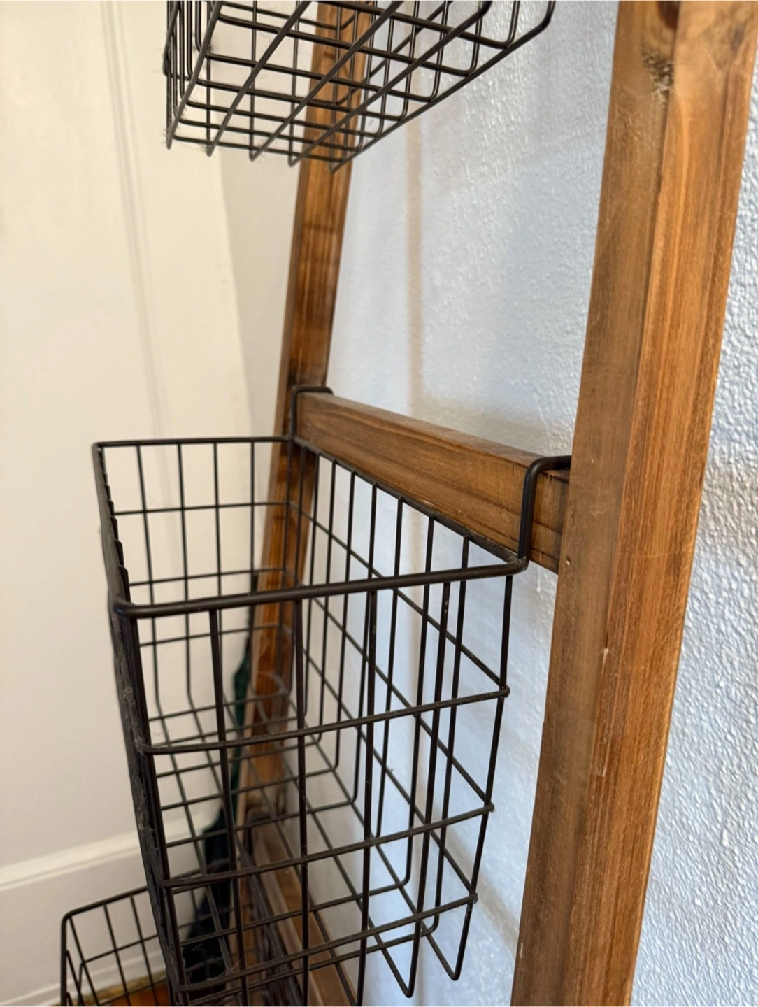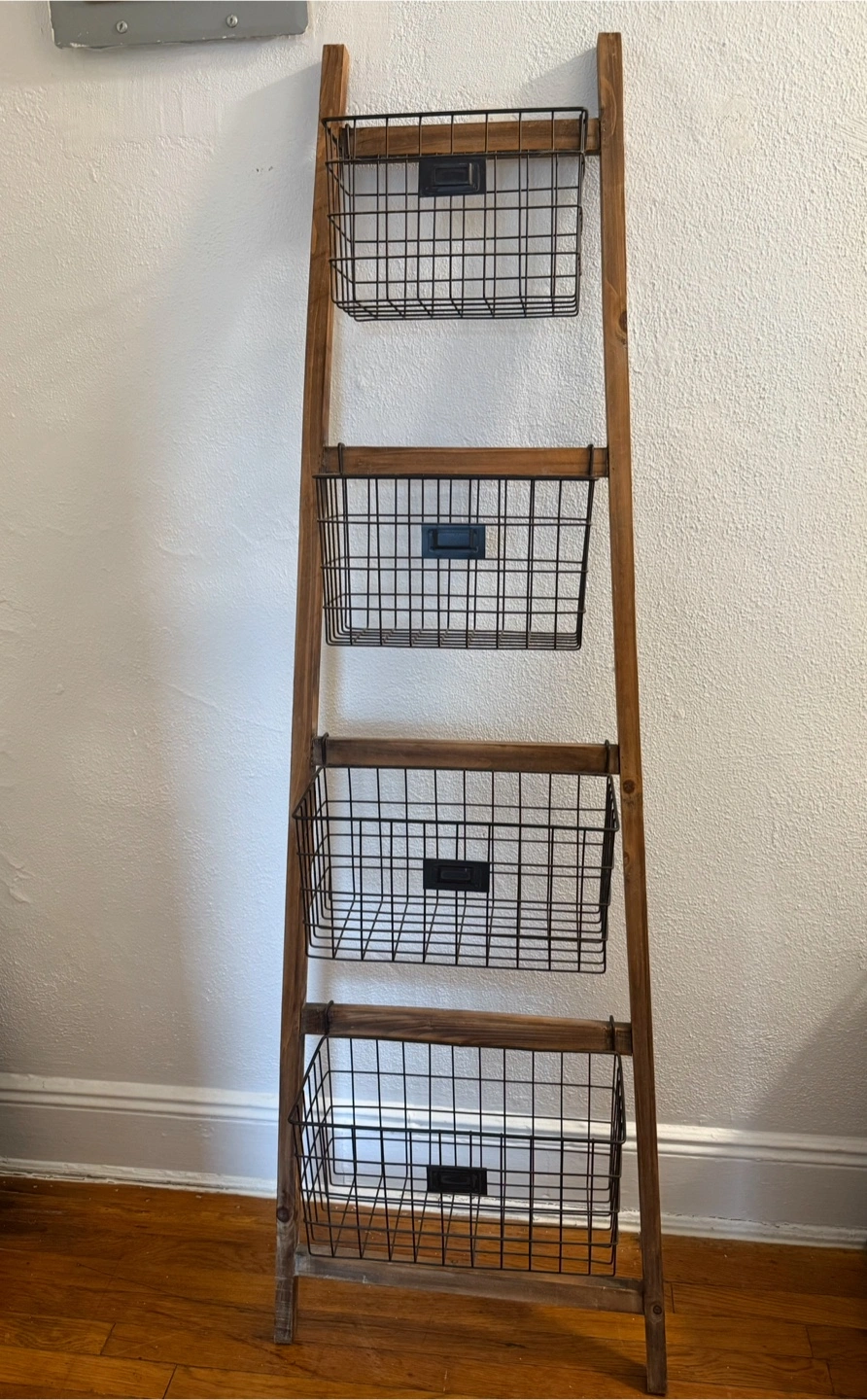 Selling a NEW ladder shelf with four wire baskets. It's in great condition and perfect for adding some rustic charm to your space! It's great for storing blankets, towels, or other household items. Dimensions: Height: Roughly 72 inches Width: 21 inches Comes with 4 metal baskets that can double as additional storage for your books, towels, or plants. The ladder itself is wooden with a rustic finish to it. This is a free-standing leaning shelf and does not screw to the wall.