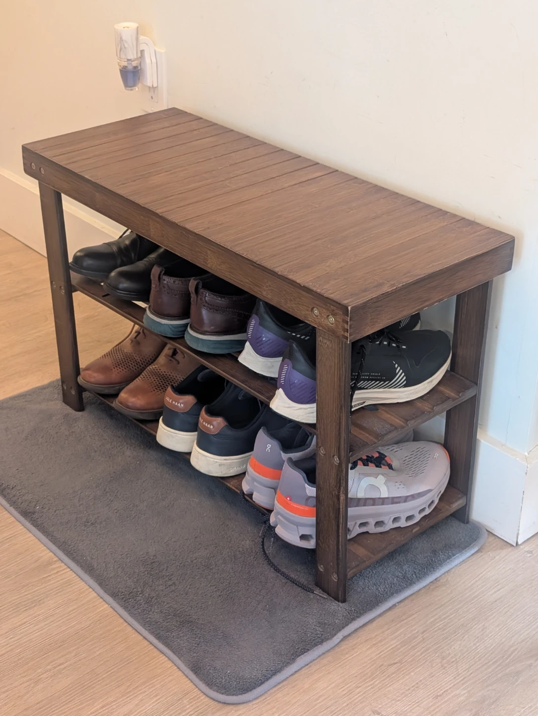 Selling a wooden shoe rack that doubles as a bench! It's in great condition and perfect for organizing your entryway or closet. It has shelves for storing shoes and a sturdy top for sitting or placing items. Dark wood finish.