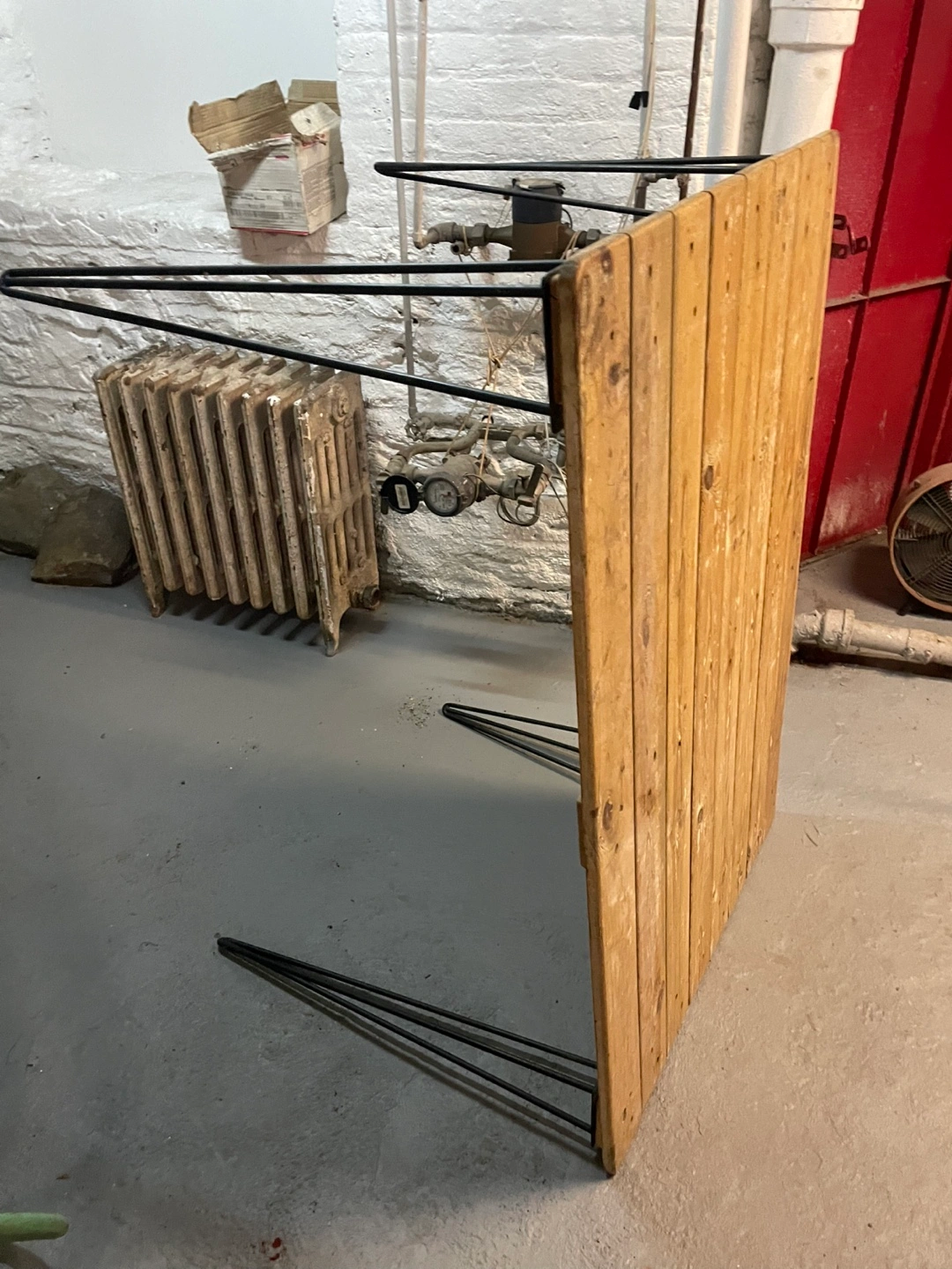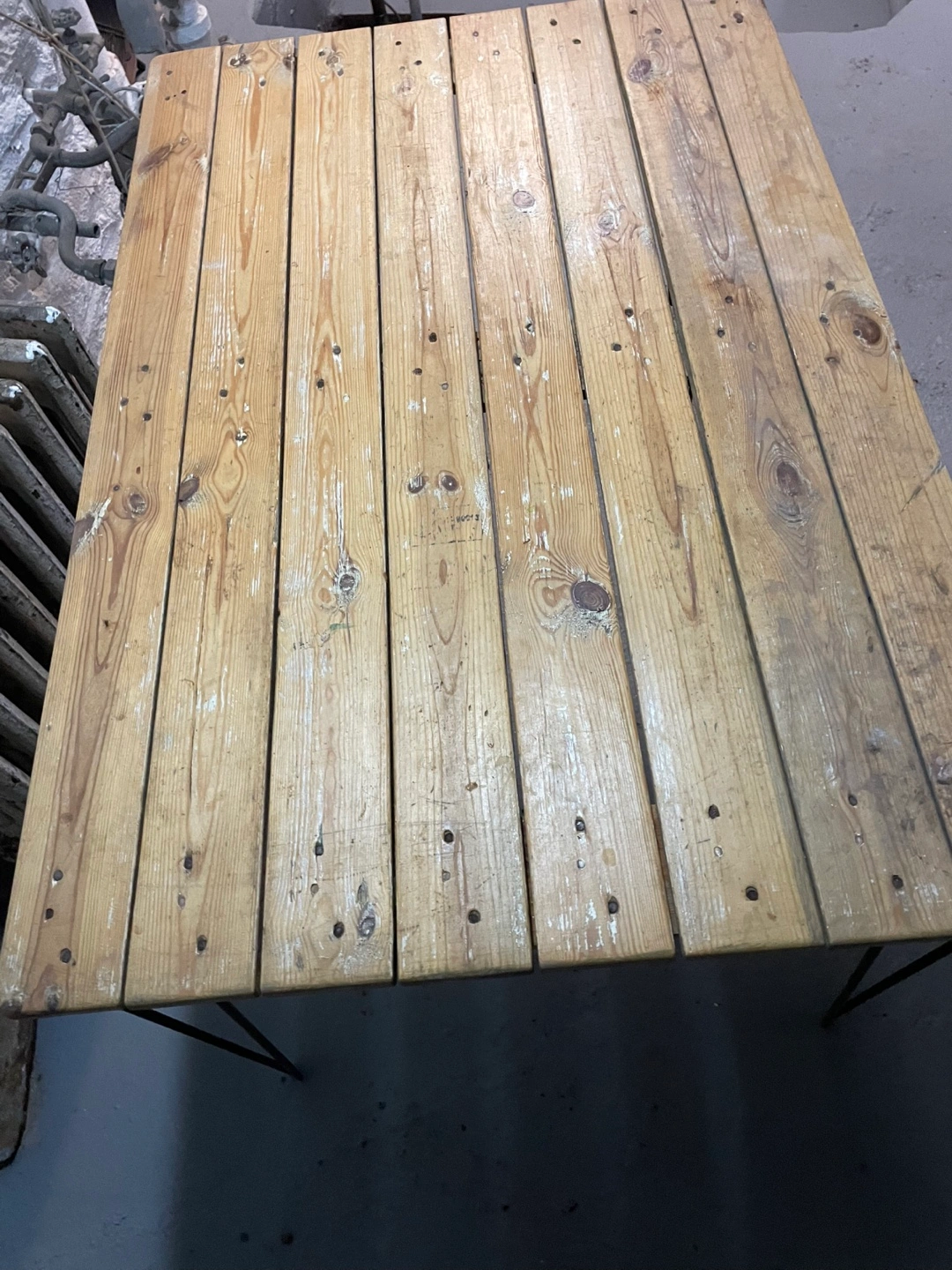 A wooden table with metal hairpin legs. Made from planks of wood. A perfect place to have a cup of tea while you are reading.
