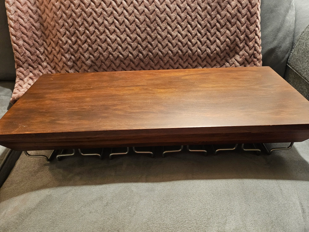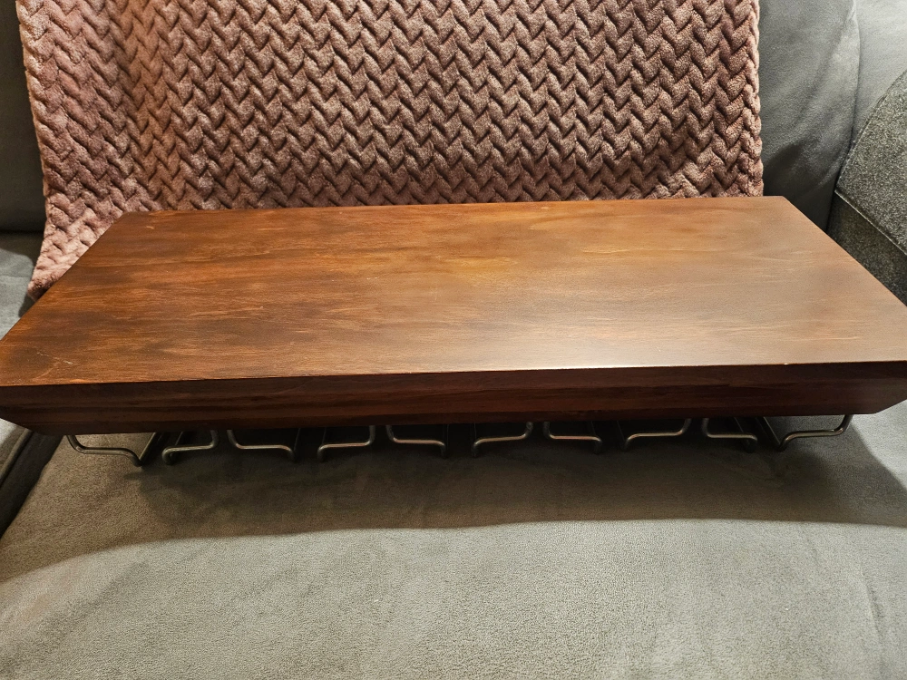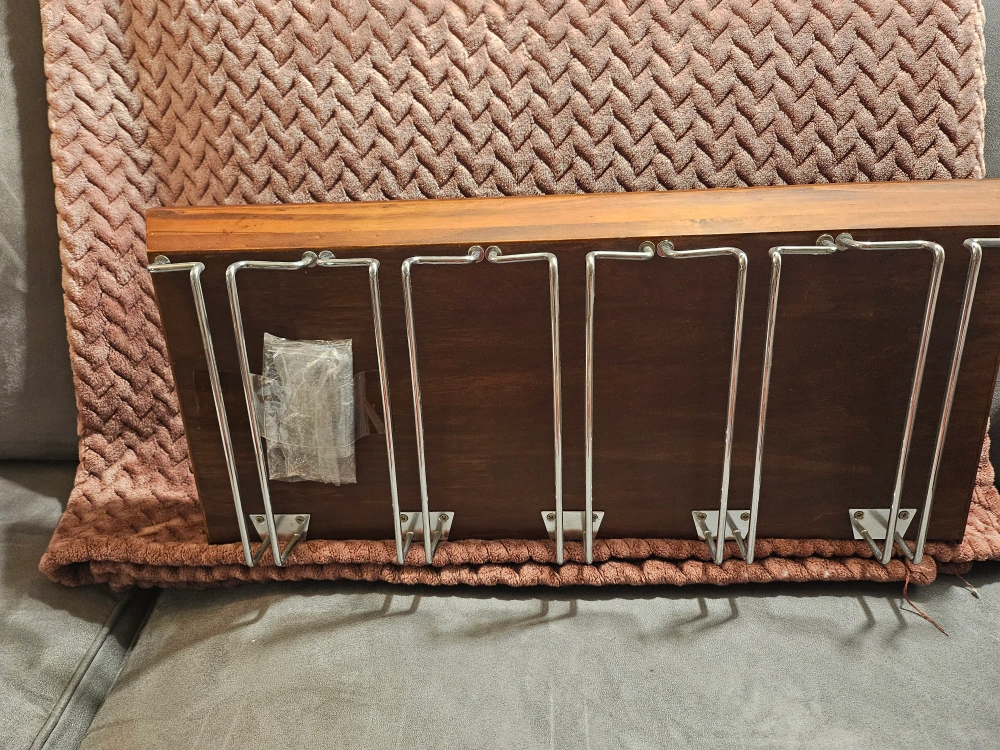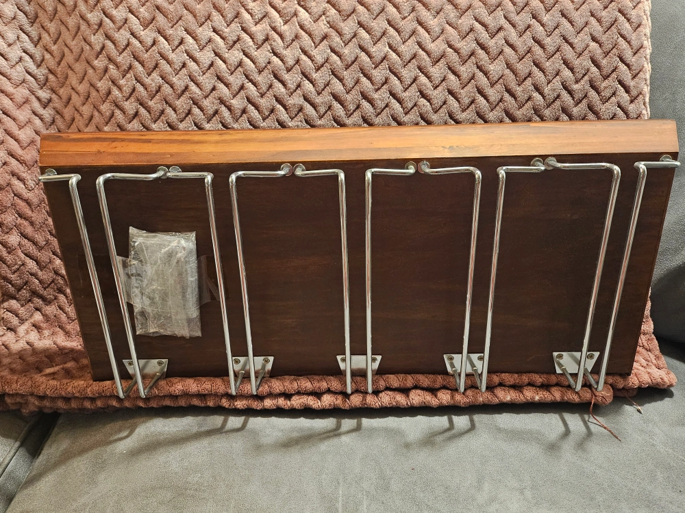 Wooden wine rack with metal holders. Holds 6 bottles of wine.