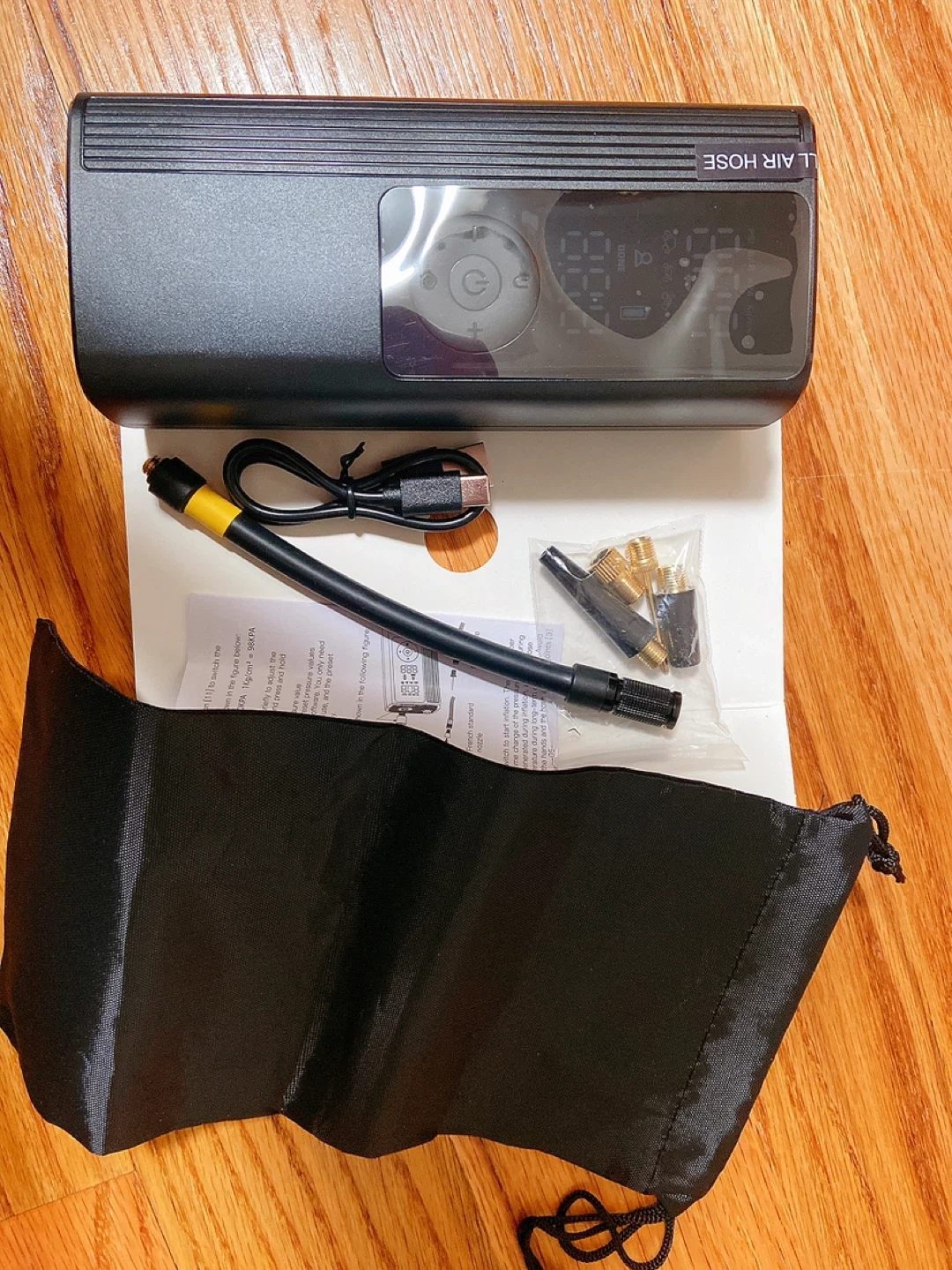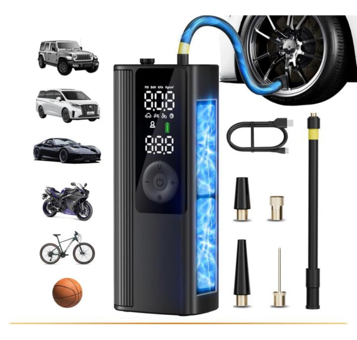 This portable digital air compressor is perfect for topping up tires on cars, motorcycles, bikes, and more. It comes with various nozzle attachments and a USB charging cable. Features a clear digital display for easy pressure monitoring. Includes a storage pouch for convenience!