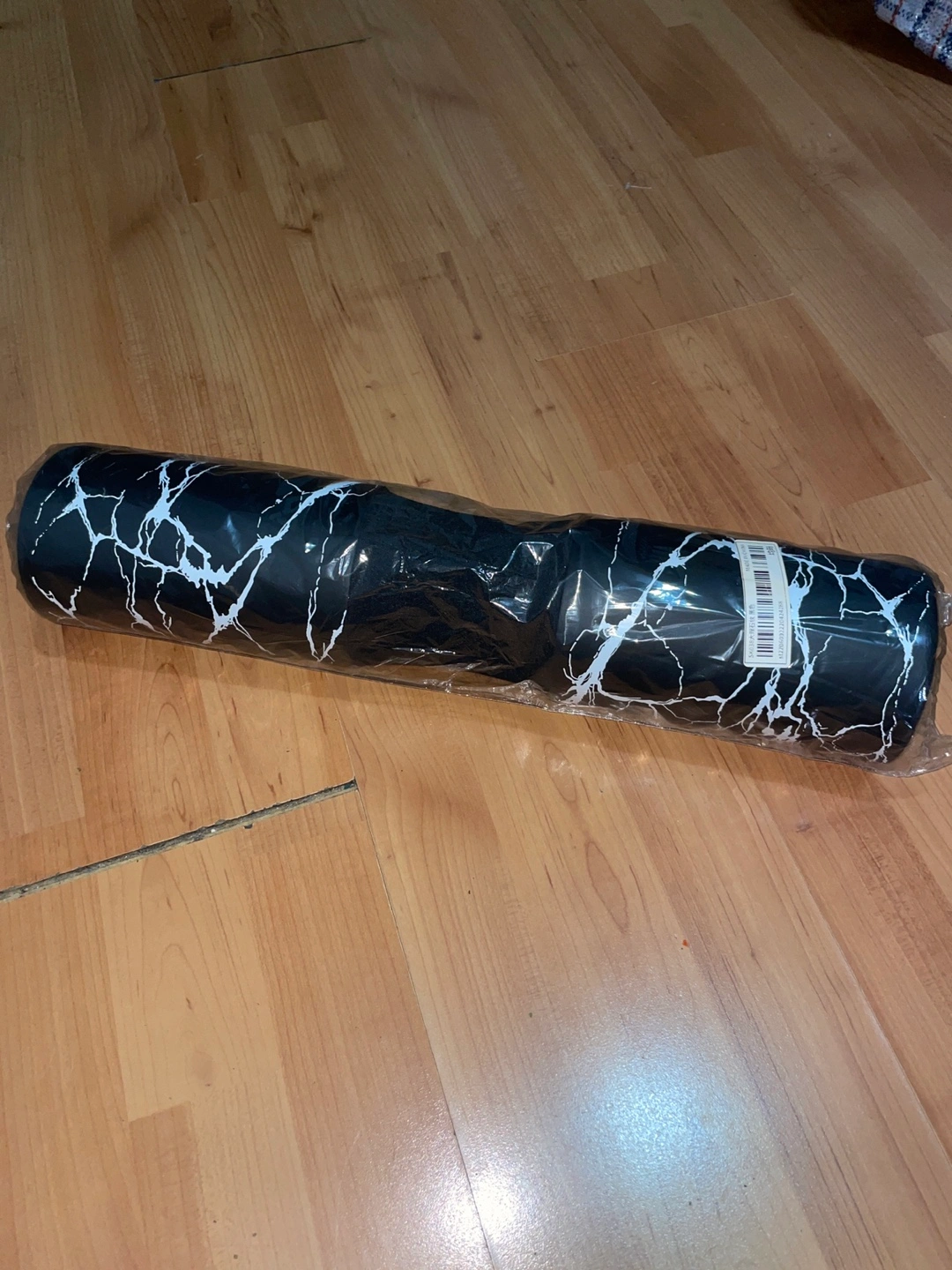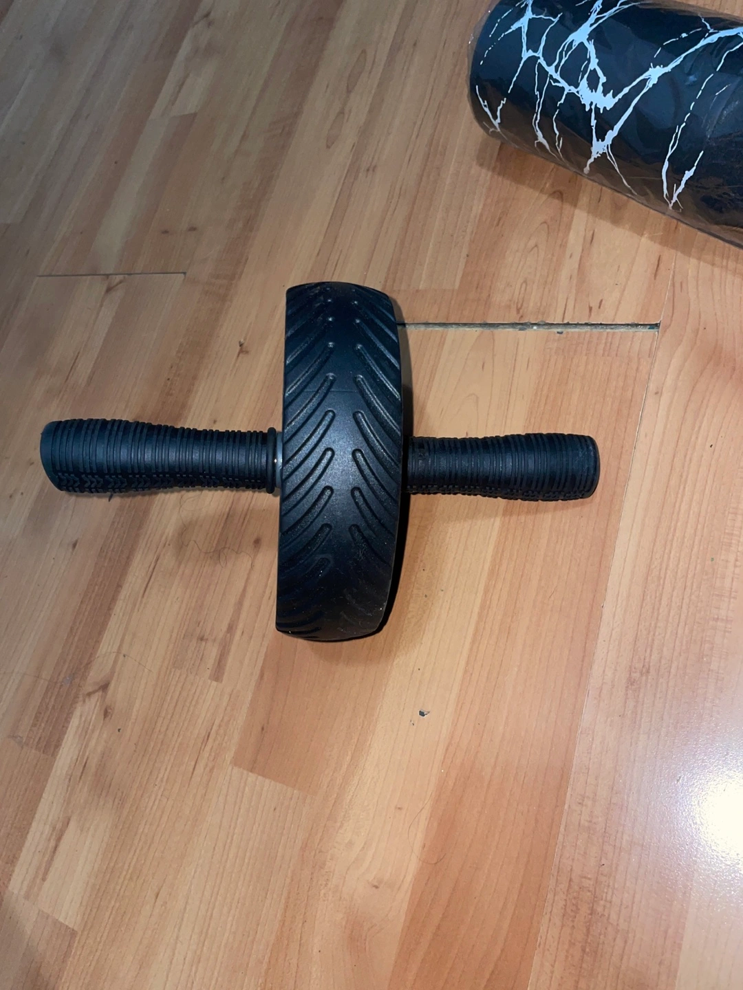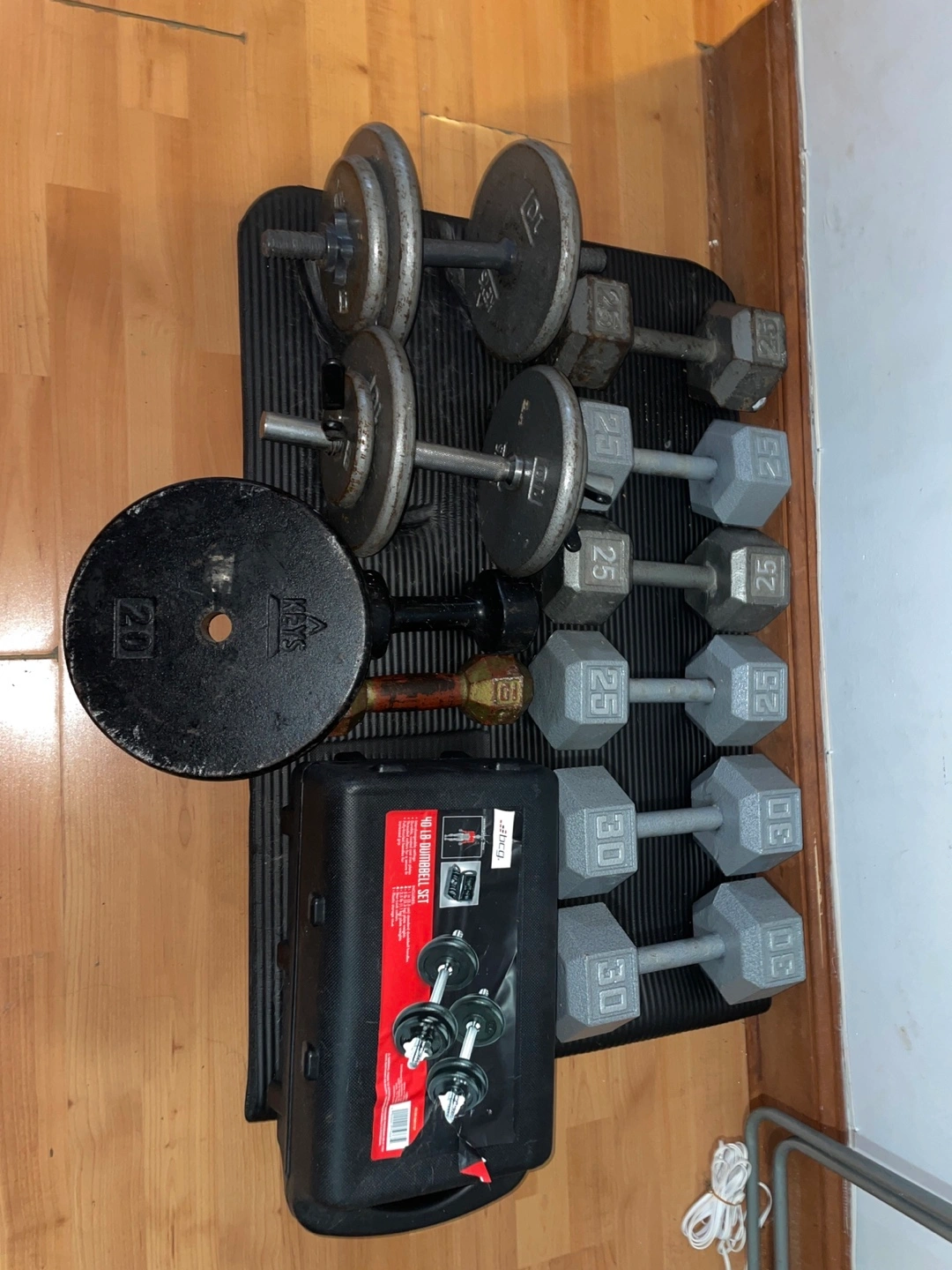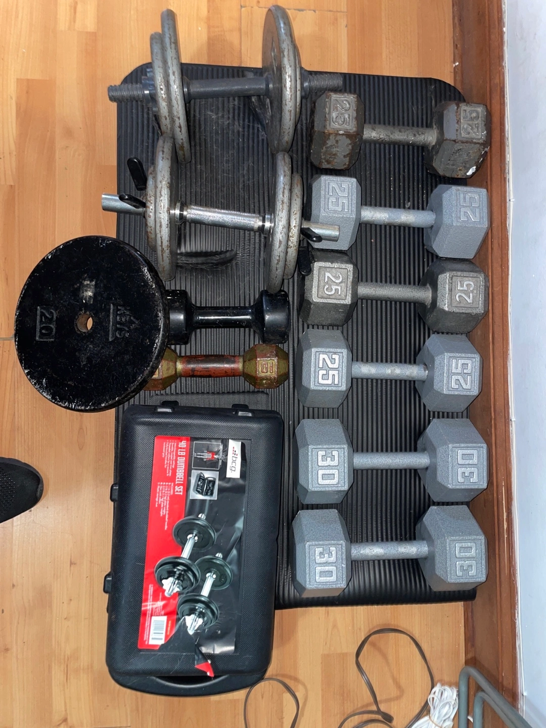 Set of dumbbells of different weights. Includes a weight plate and a weight stand. Also includes an ab wheel and a foam roller, which is perfect for stretching after a workout.