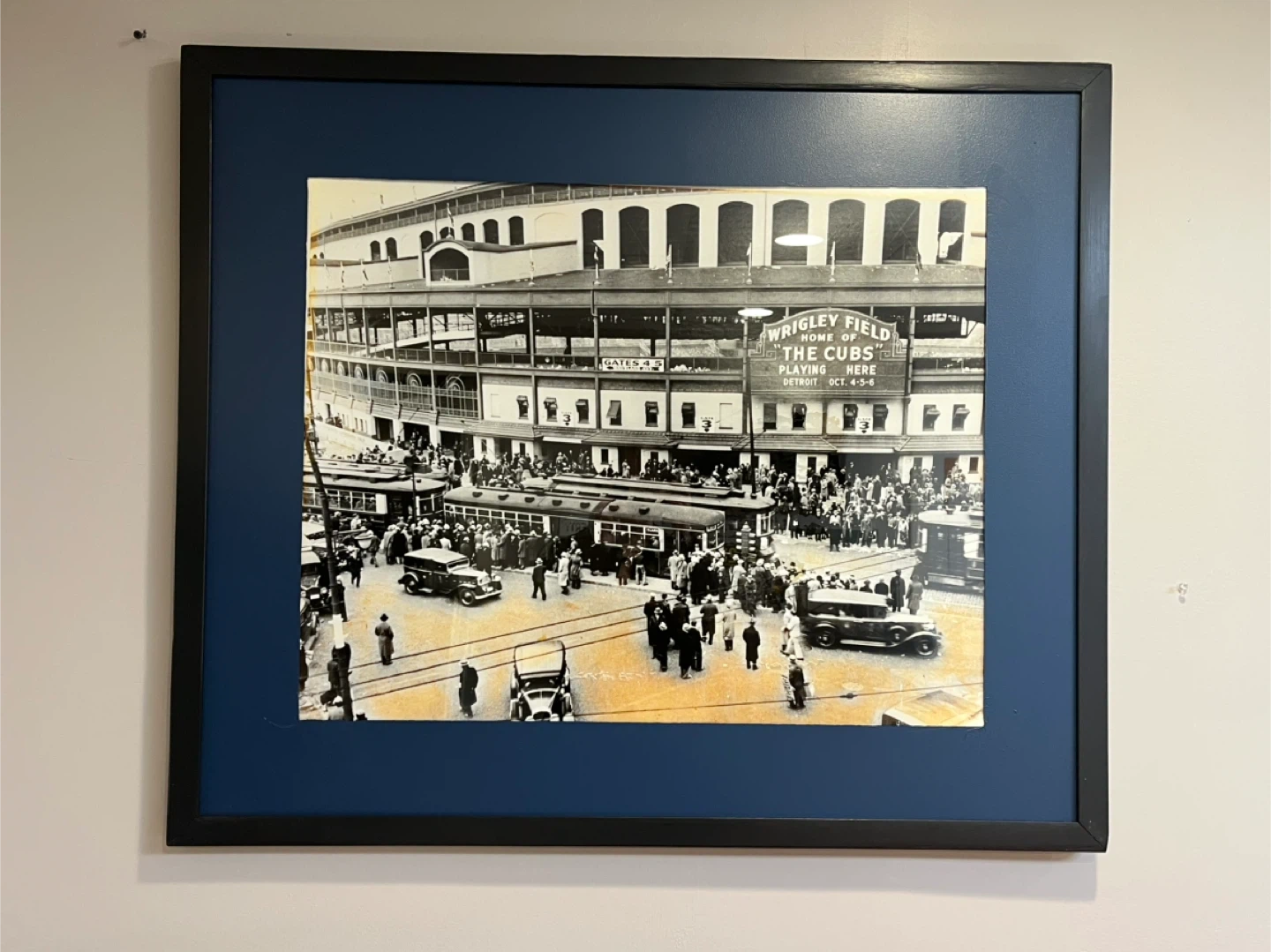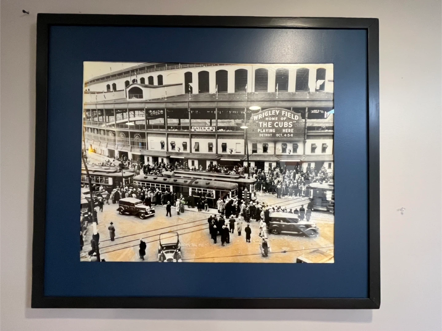 This is a framed print of Wrigley Field, labeled "Home of the Cubs". It depicts the stadium with a crowd and vintage vehicles outside. This piece captures a historical scene of the Chicago Cubs stadium.