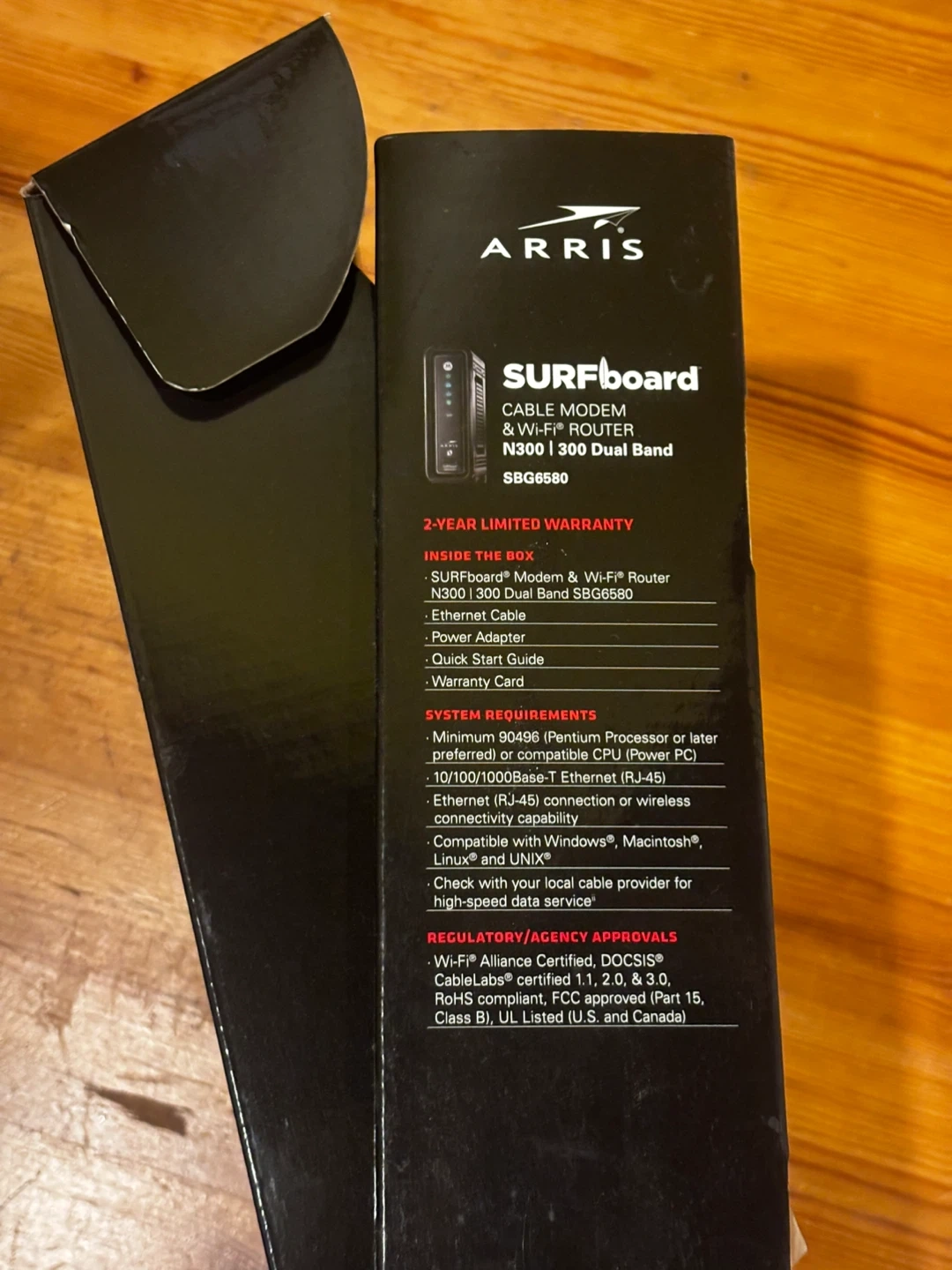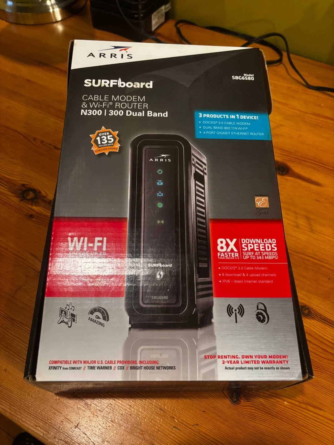 ARRIS SURFboard cable modem and Wi-Fi router, model SBG6580. This unit is N300 dual band. It comes with the modem, Wi-Fi router, power adapter, Ethernet cable, quick start guide, and warranty card. This is a 3-in-1 device, functioning as a DOCSIS 3.0 cable modem, N300 dual band Wi-Fi router, and 4-port Gigabit Ethernet router.