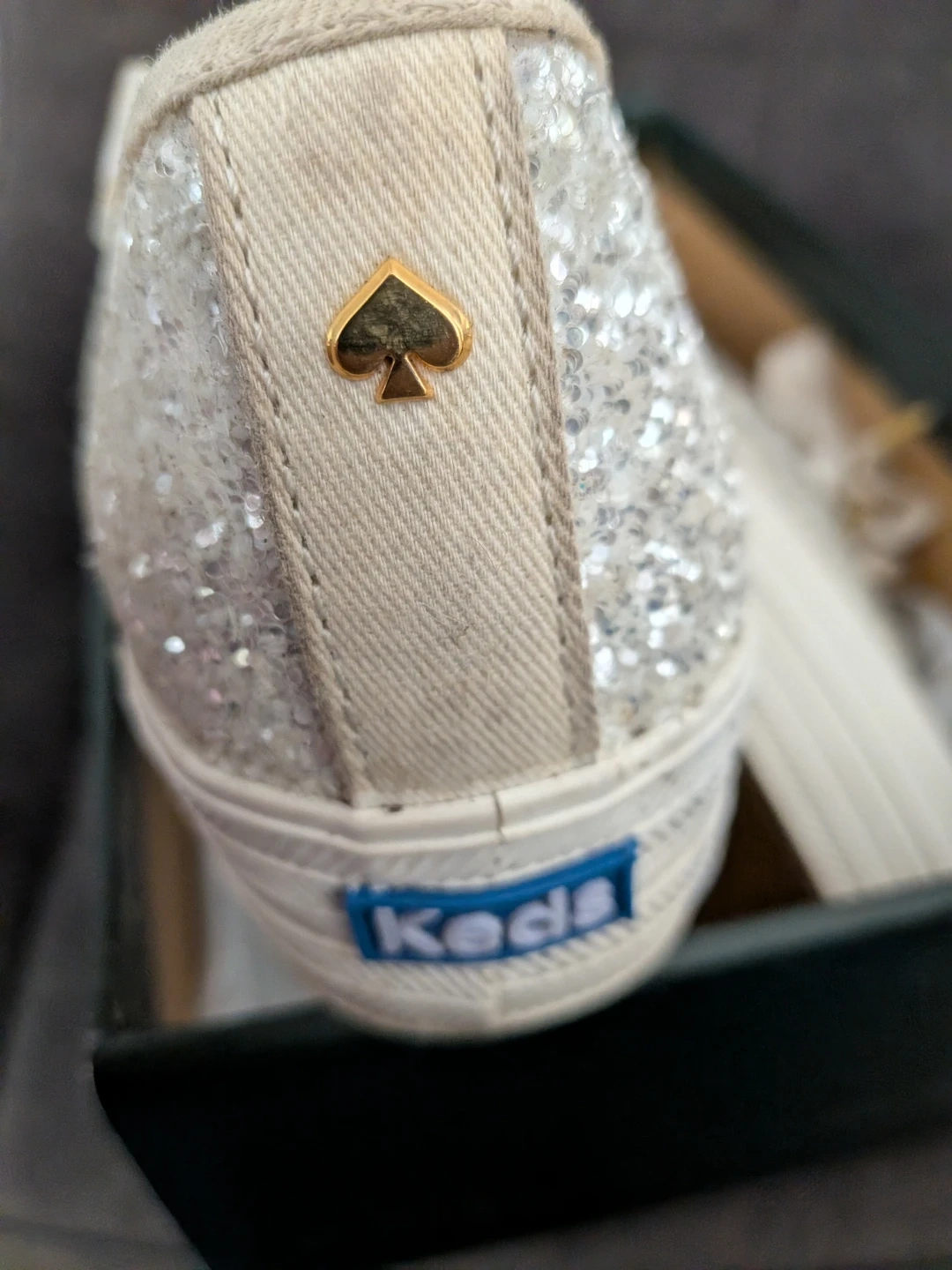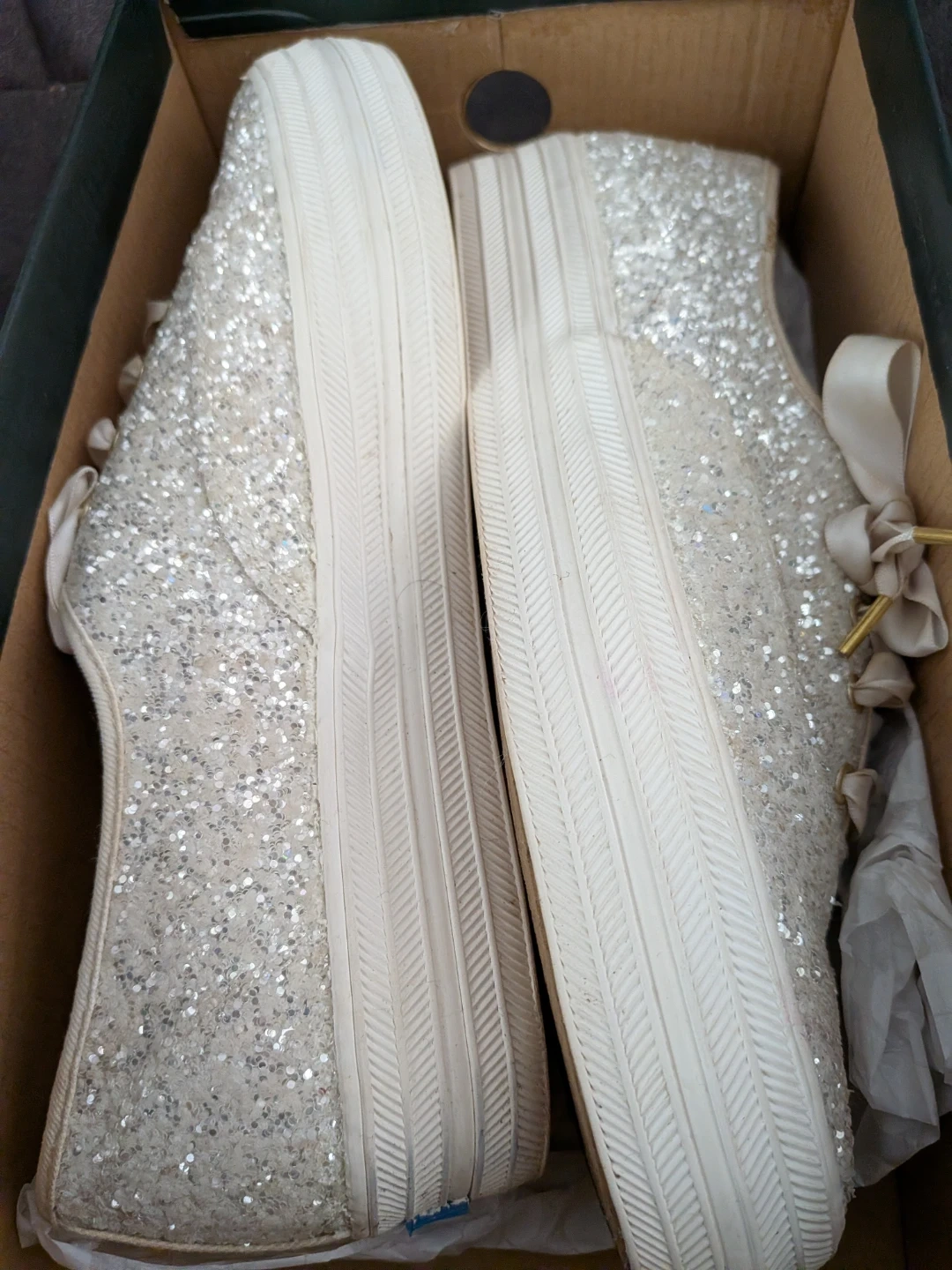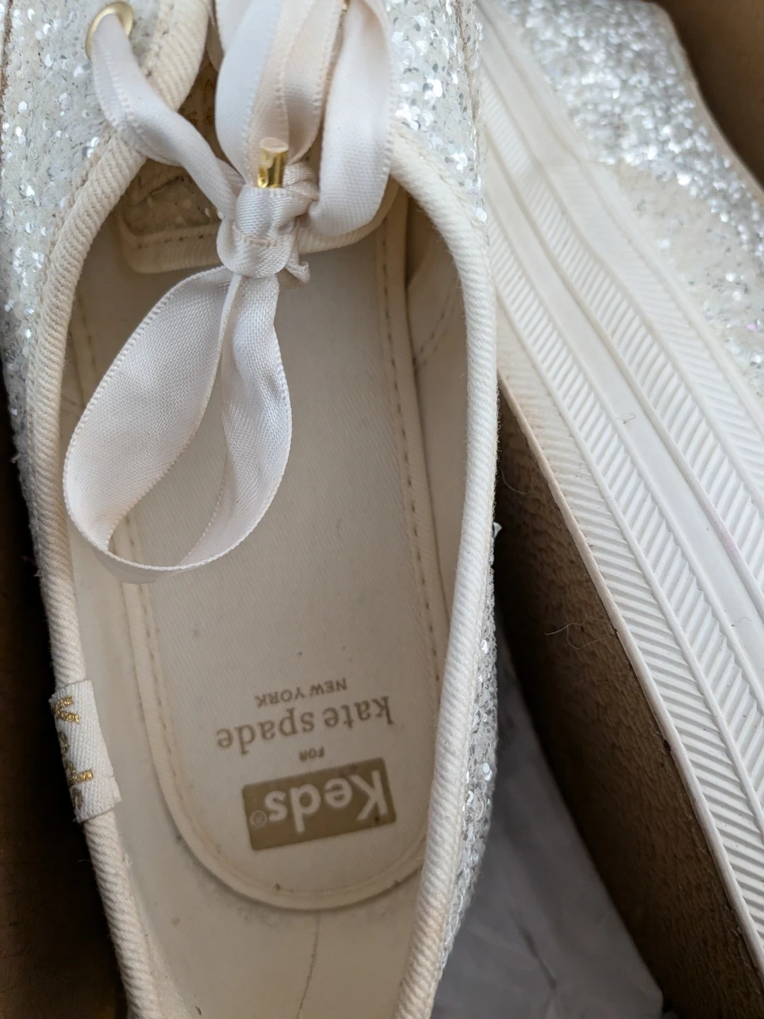 Sparkly glitter sneakers in cream, a collaboration between Kate Spade and Keds. Features white ribbon laces and a comfortable rubber sole. Perfect for adding a touch of glam to any outfit!