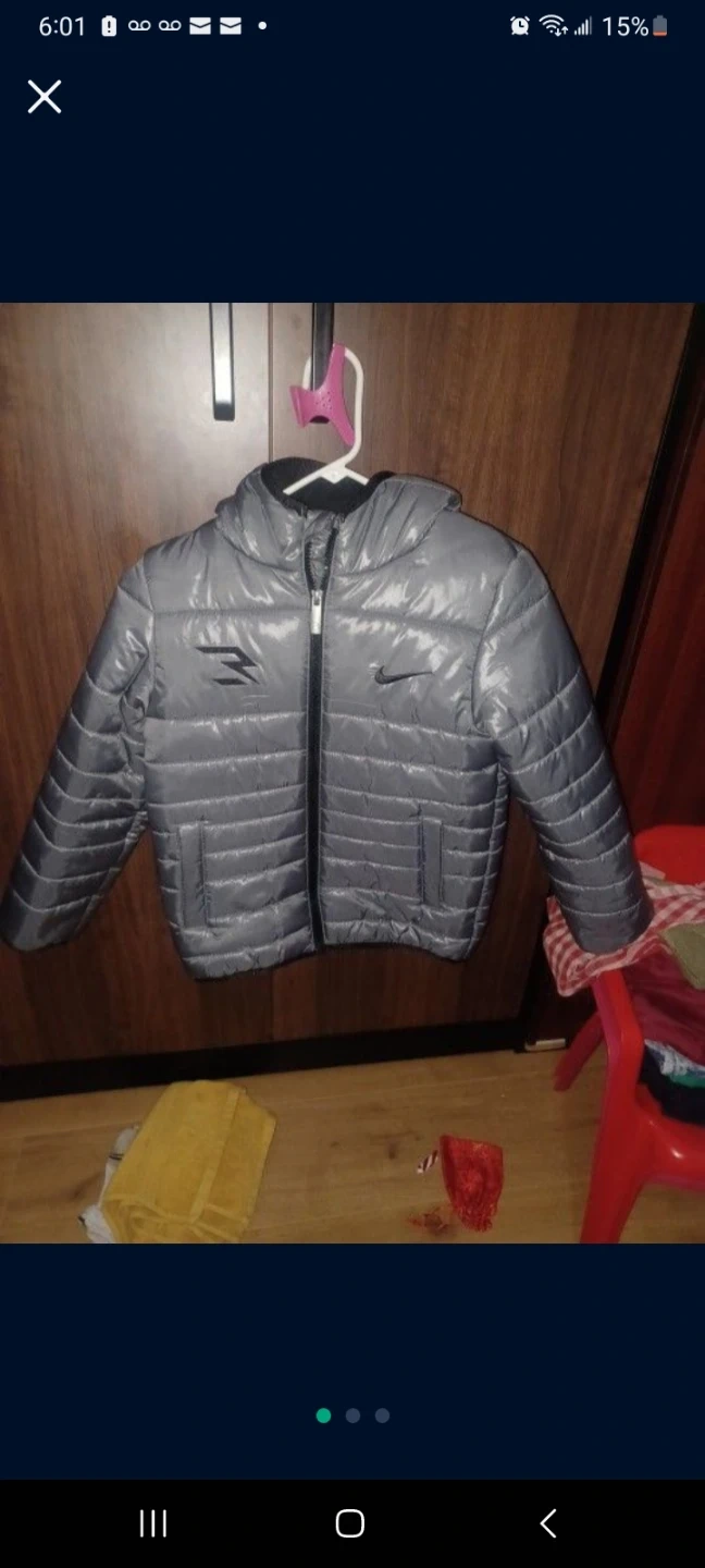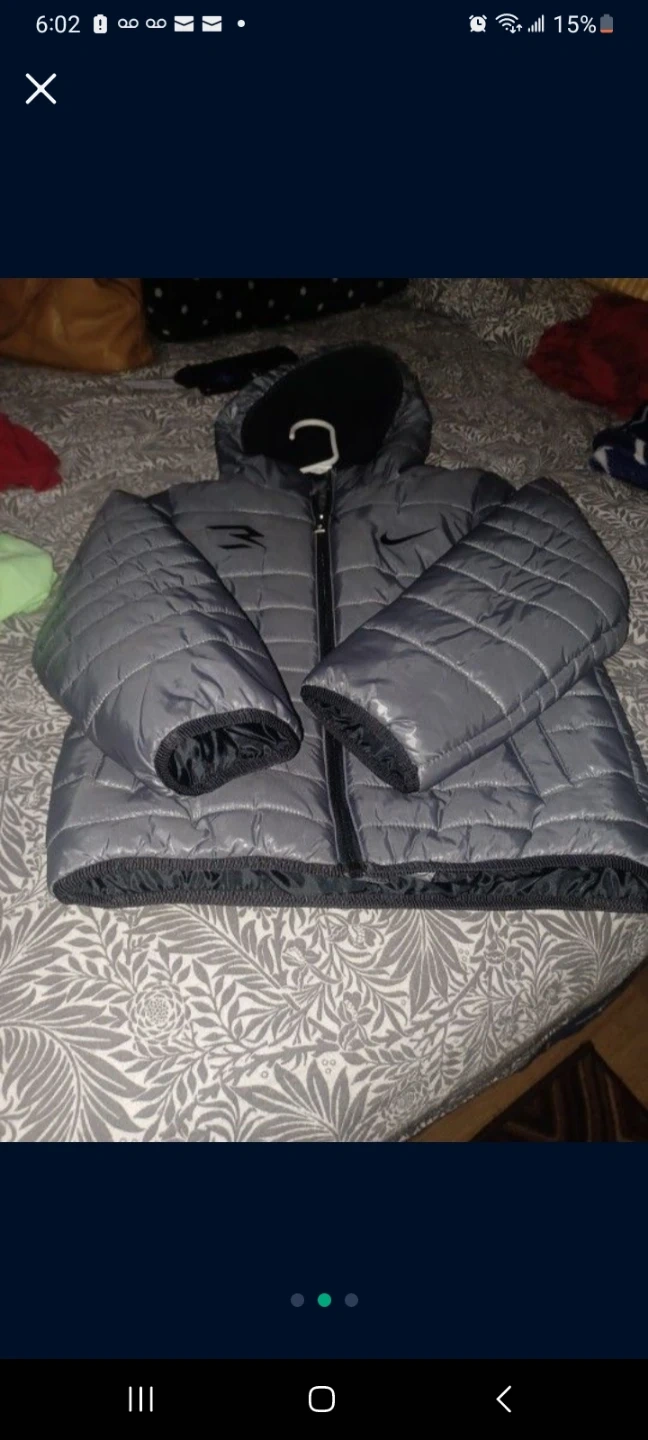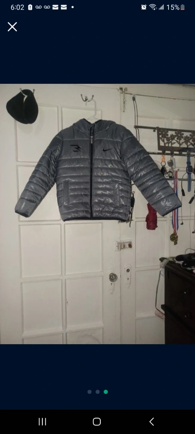 This is a gray puffer jacket with a hood. It's warm and suitable for cooler weather. The jacket zips up the front.Bought from Macy's.