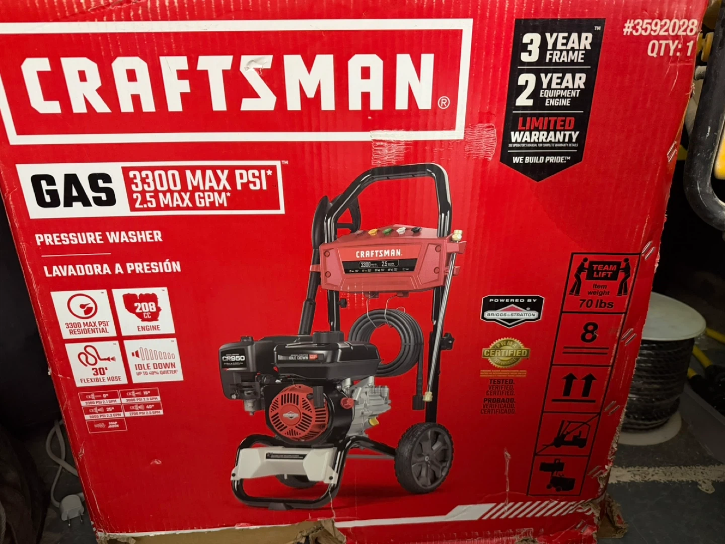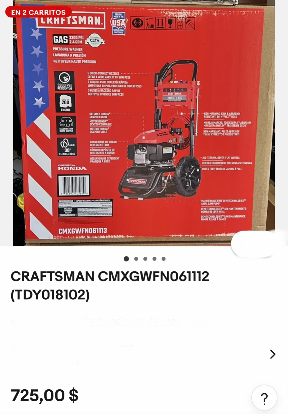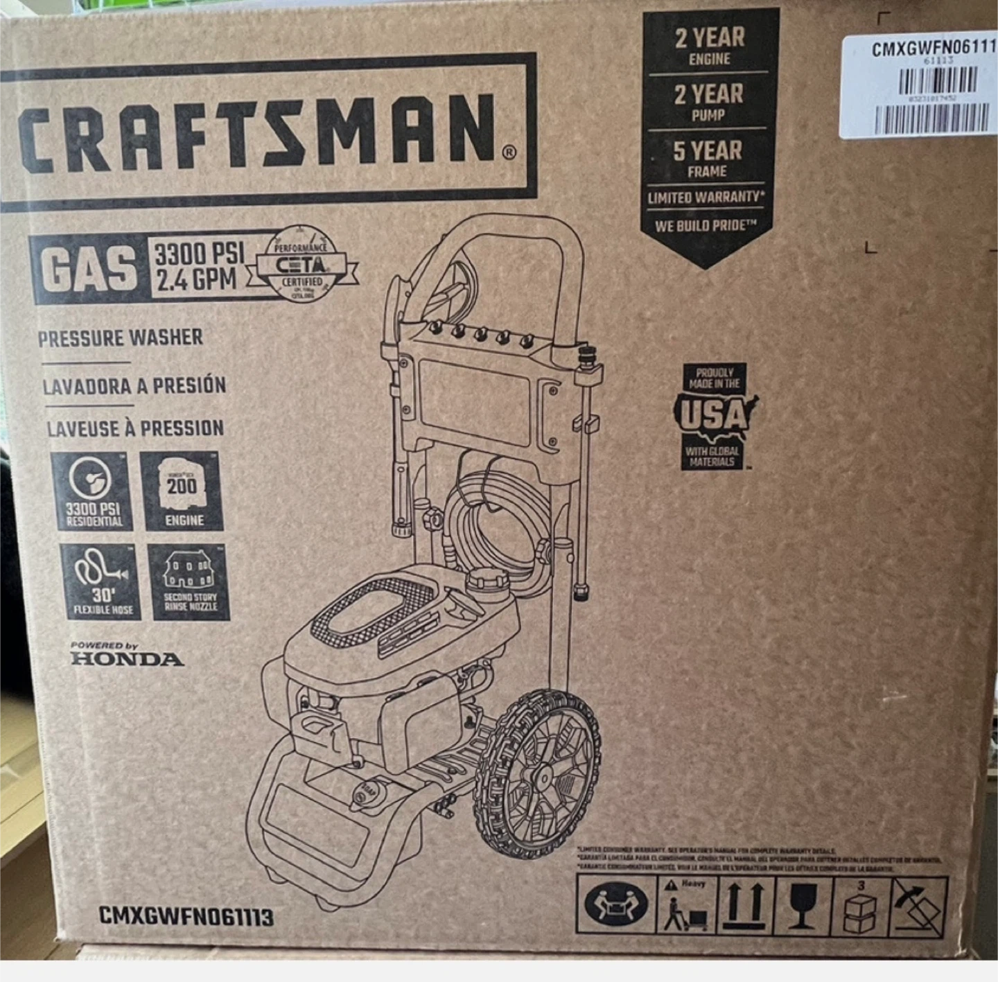 This is a Craftsman gas pressure washer with 3300 PSI and 2.4 GPM. It's powered by a Honda engine and features a 30' flexible hose. Includes 5 quick-connect nozzles.