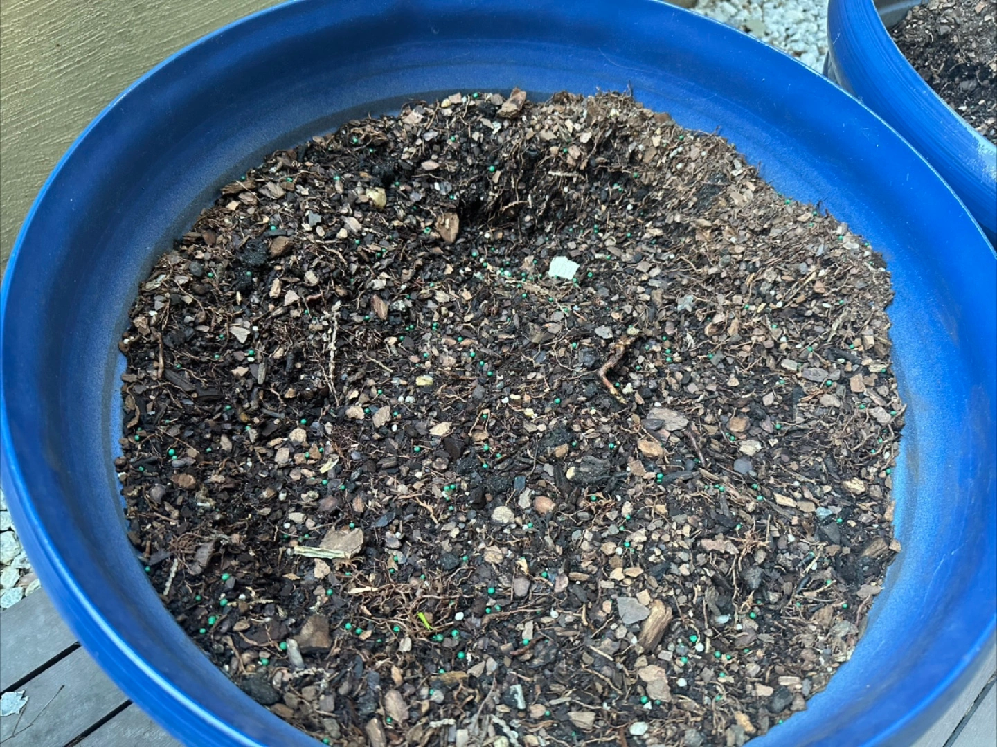 Soil seems like a well-draining mixture of bark, garden soil, and topsoil. There are green fertilizer pellets mixed in.