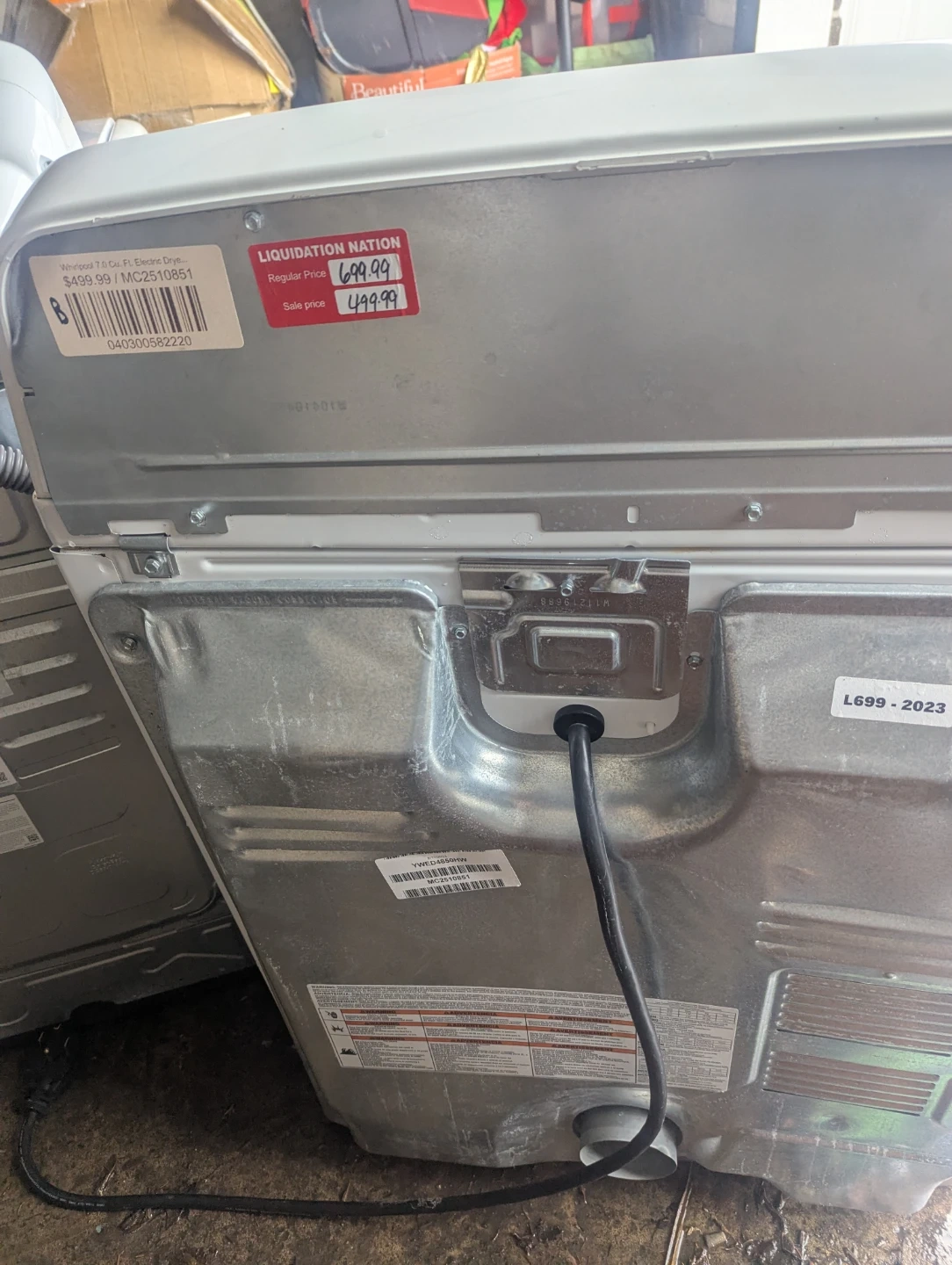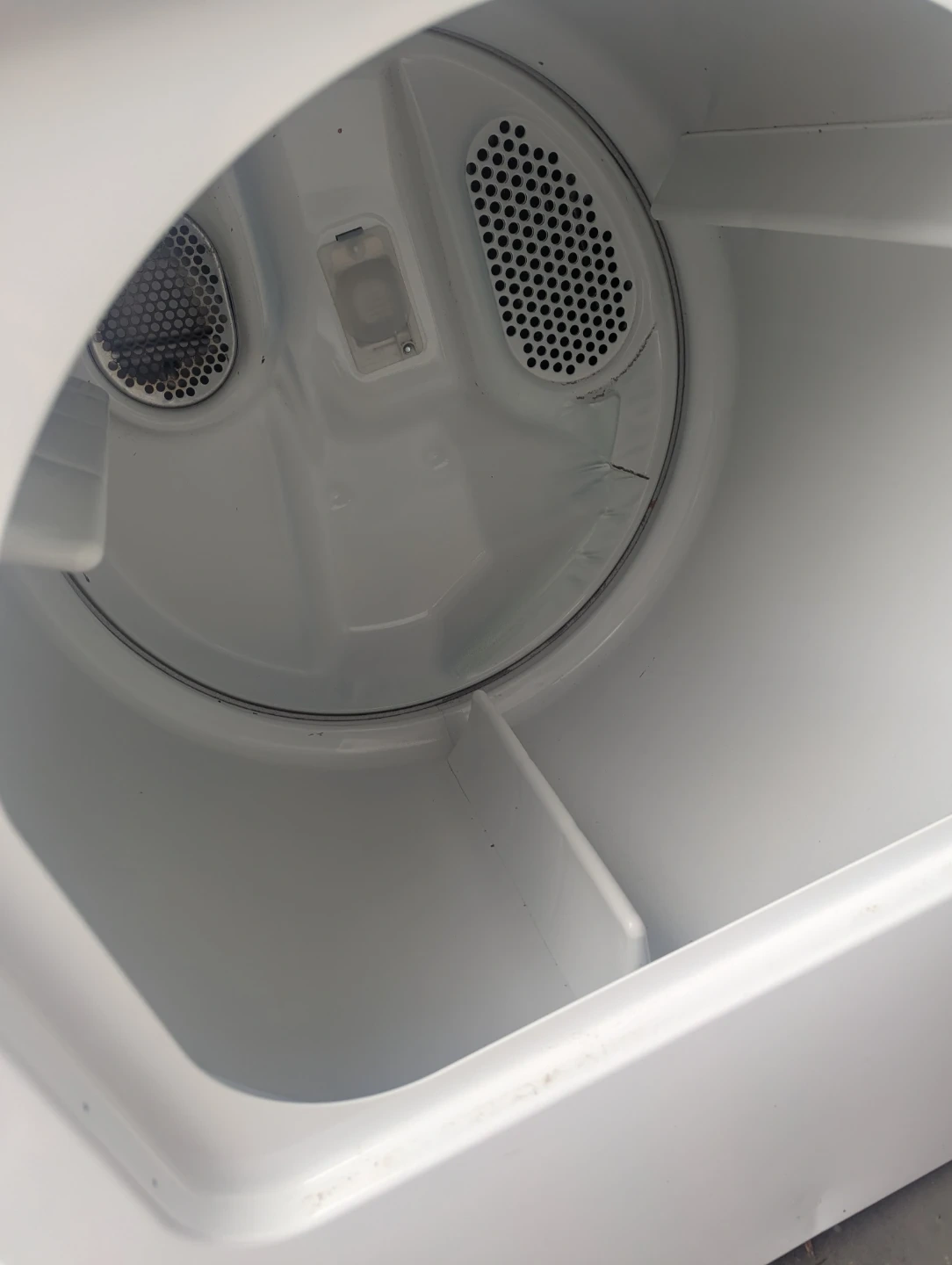 This is a white Whirlpool electric dryer. It has multiple drying cycles, including Auto Dry and Timed Dry. The interior drum has some minor cosmetic damage, but it doesn't affect operation. It's a standard size for most laundry rooms.