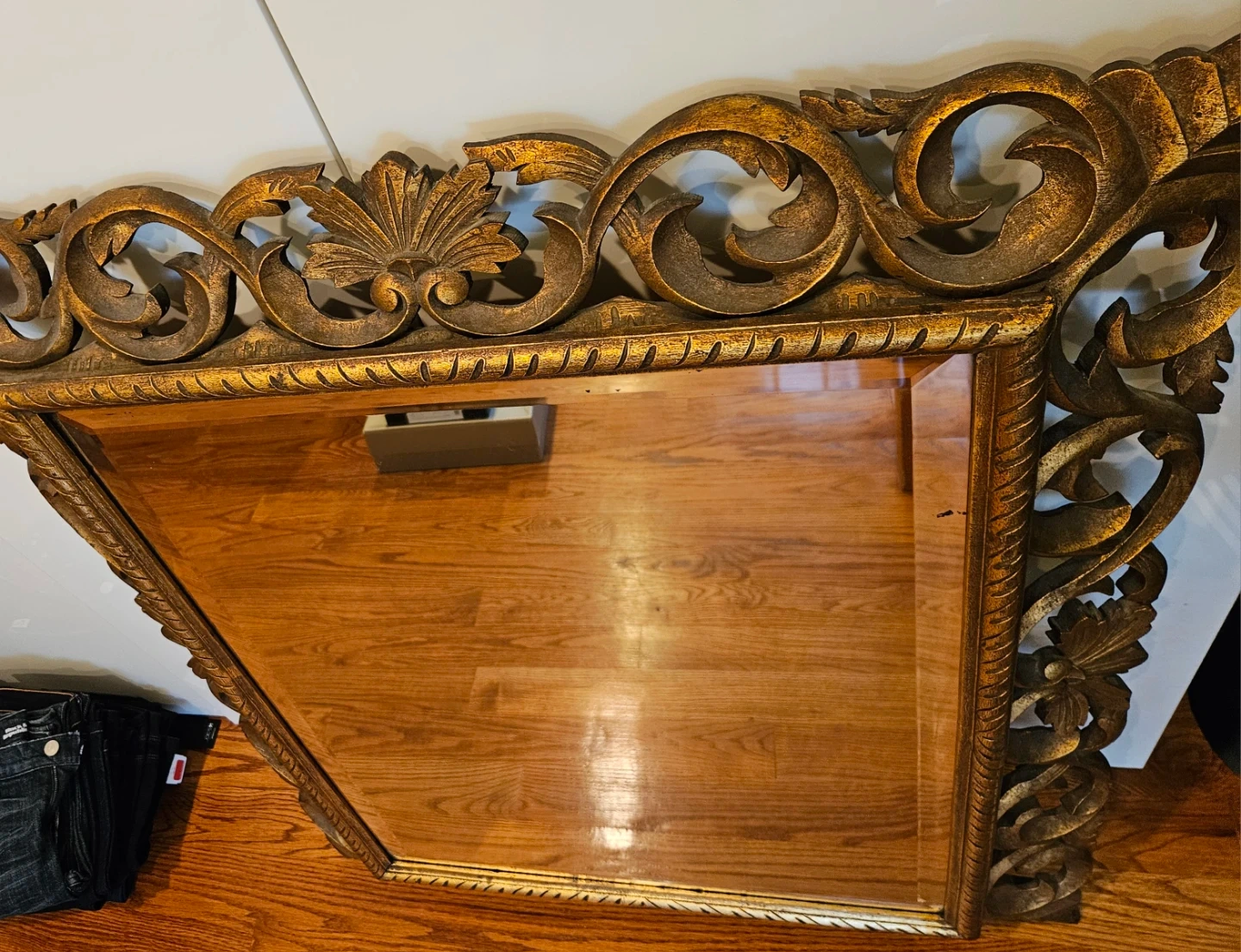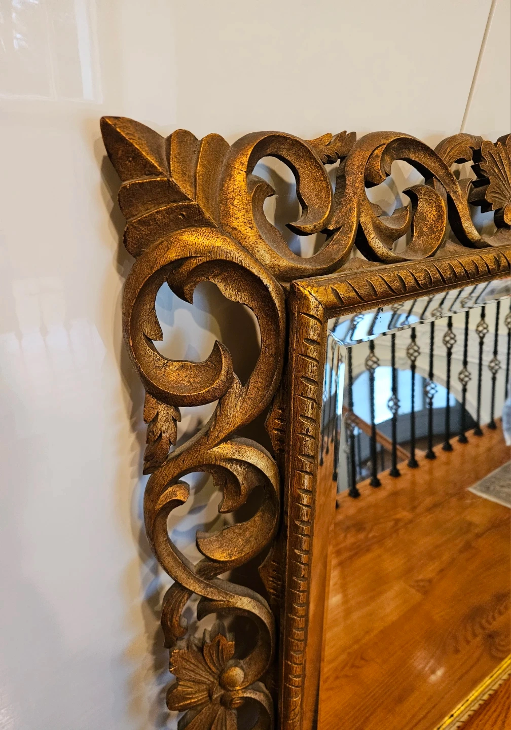 This is a large mirror with an ornate, carved gold gilt frame. The frame features intricate scrollwork and floral motifs. It's a beautiful statement piece for any room!