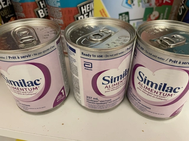 I'm selling three cans of Similac Alimentum baby formula, each containing 237ml. This formula is designed for babies with allergies and colic. These cans are ready to use and do not require the addition of water. Expiration Date: April 2026. $5 for all three cans