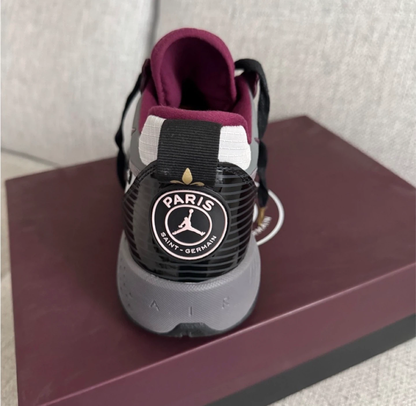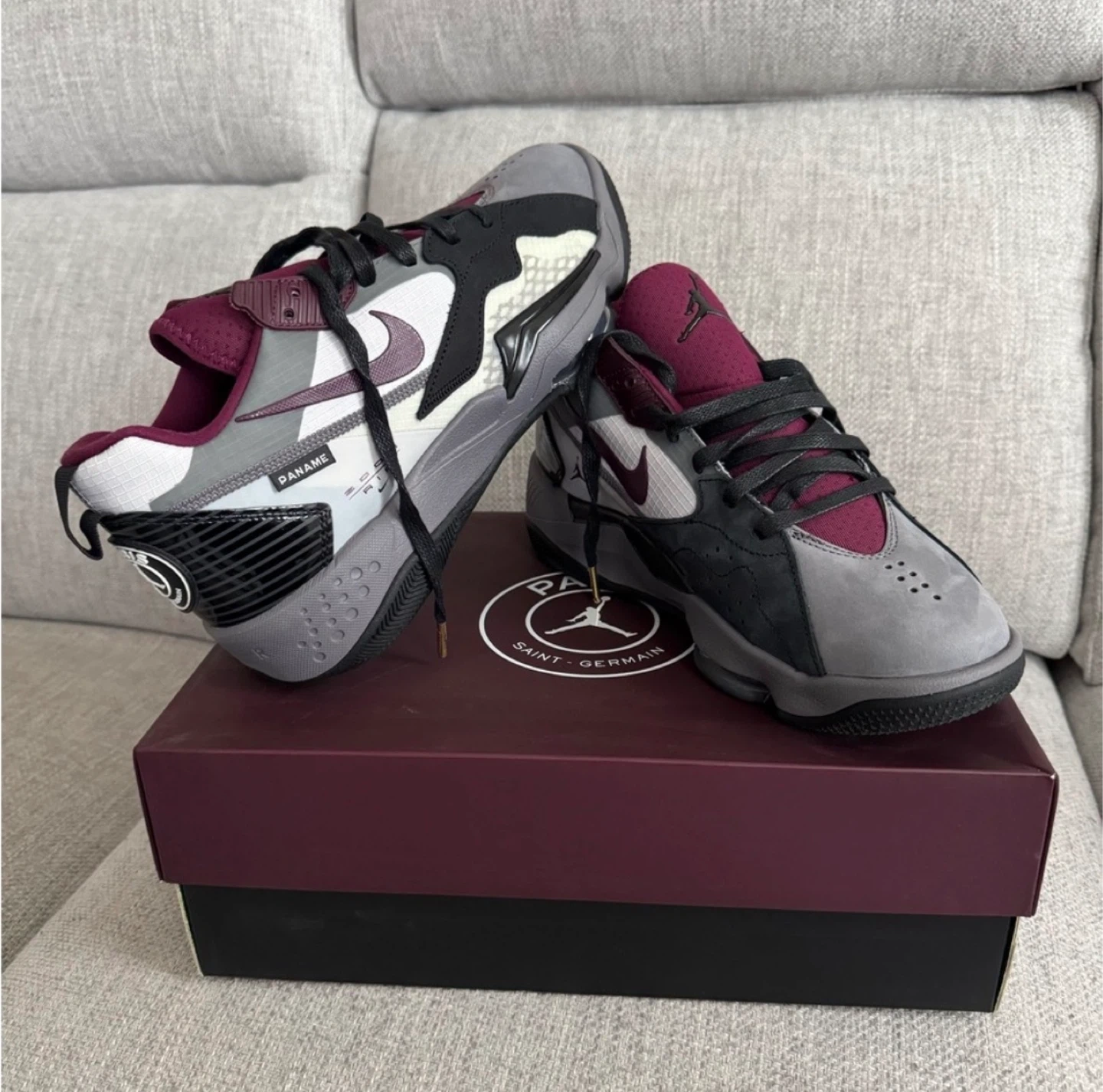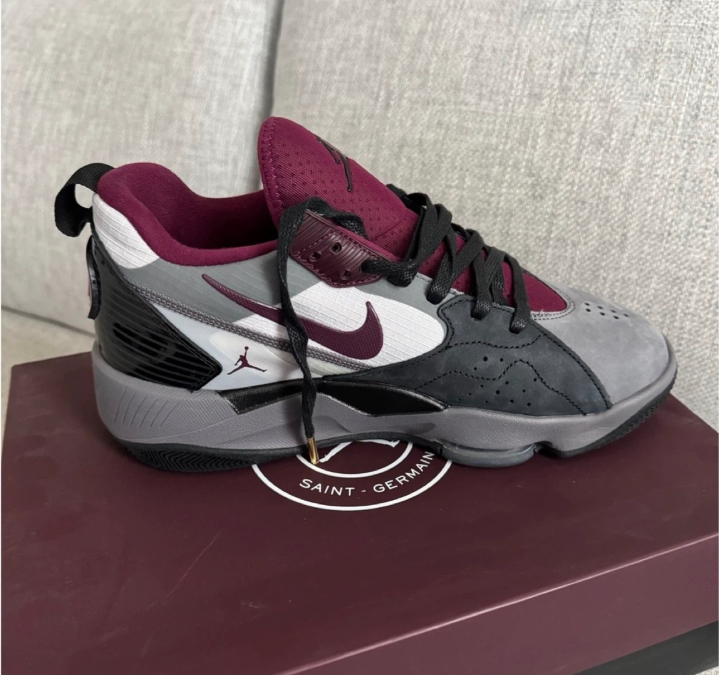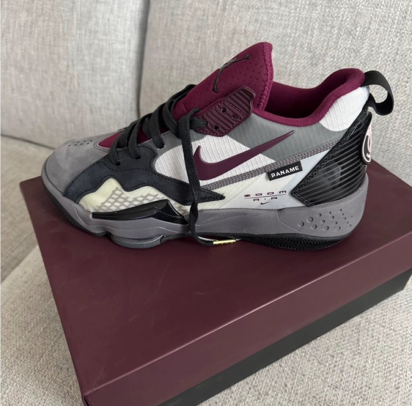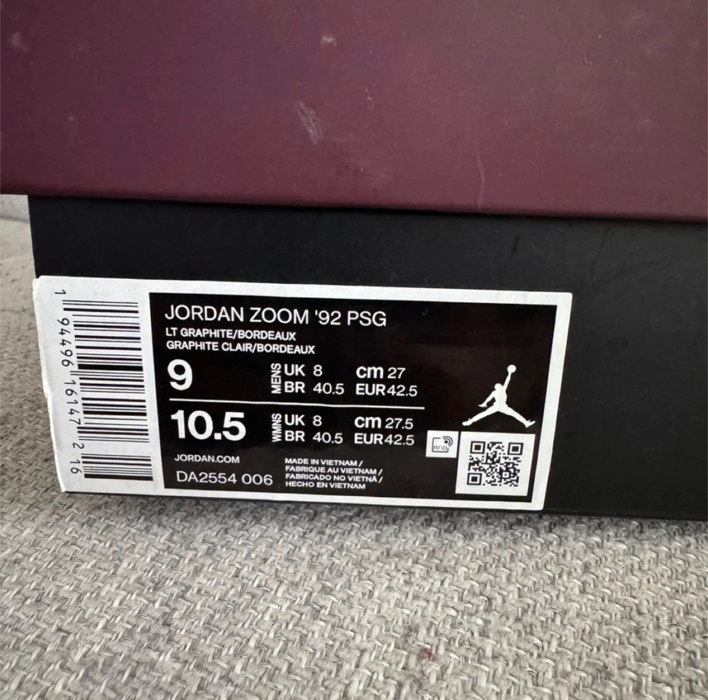These Jordan Zoom '92 sneakers come in a size 9 US Men's. They feature a combination of grey, burgundy, and white colorways. The shoes include the original box. Made in Vietnam.