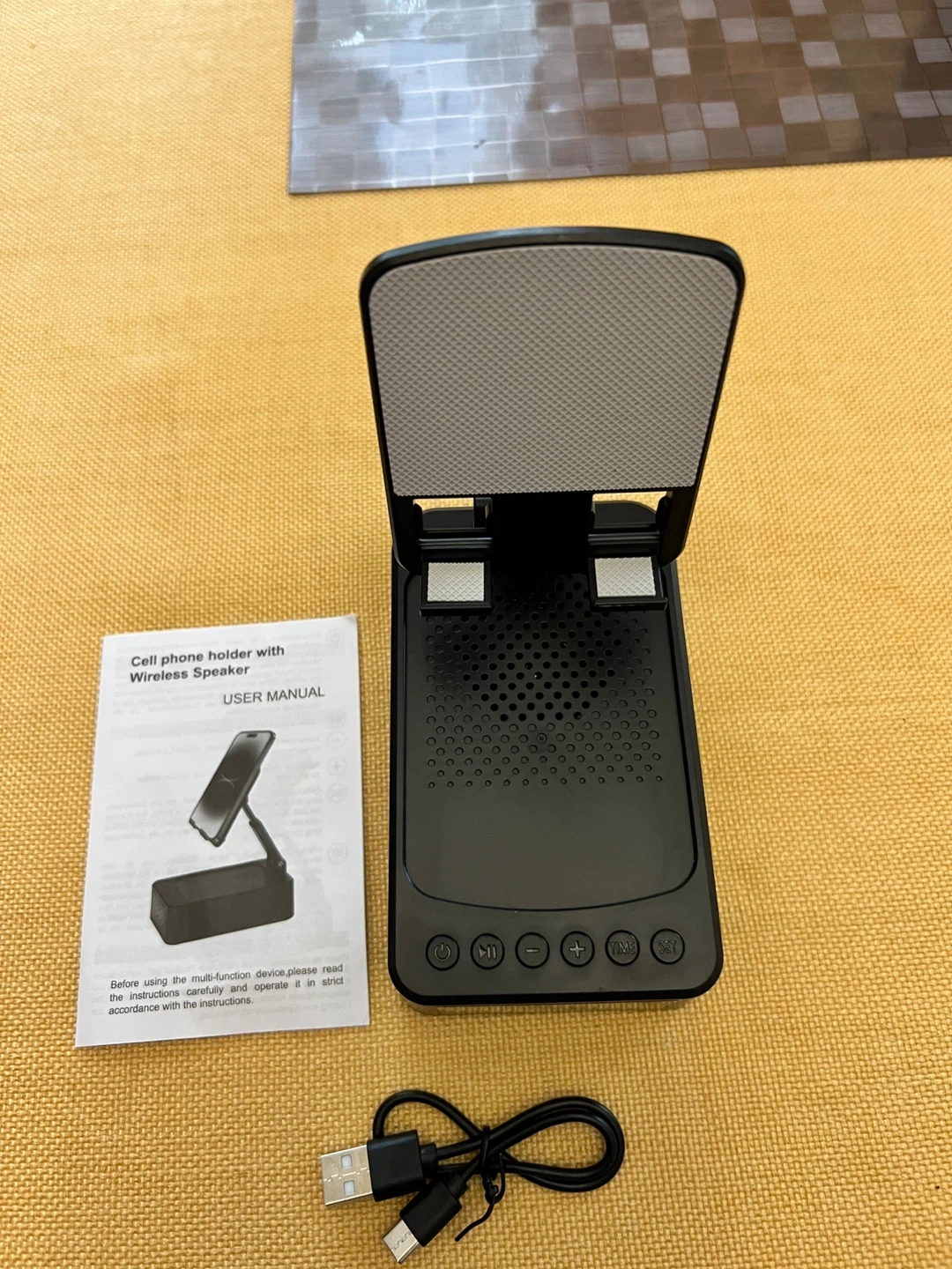 BNIB This is a black cell phone holder with a built-in wireless speaker. It includes a USB charging cable. It's great for hands-free use of your phone while listening to music or podcasts.