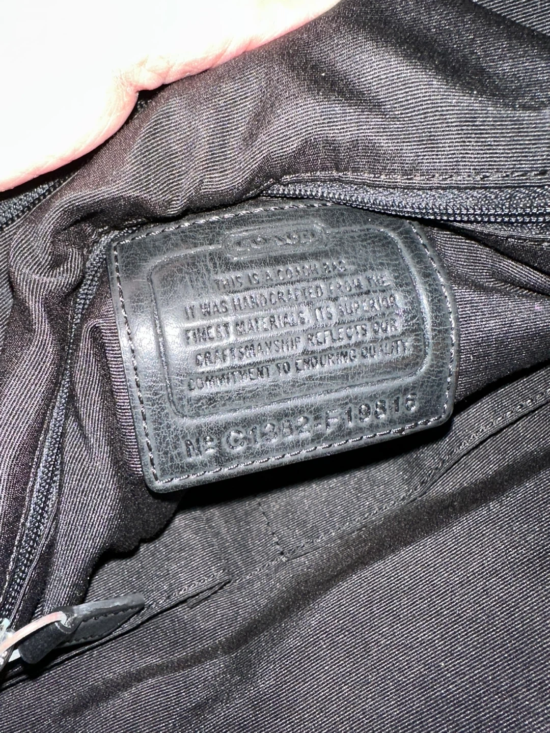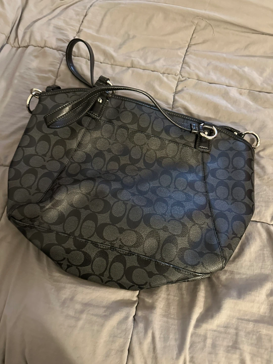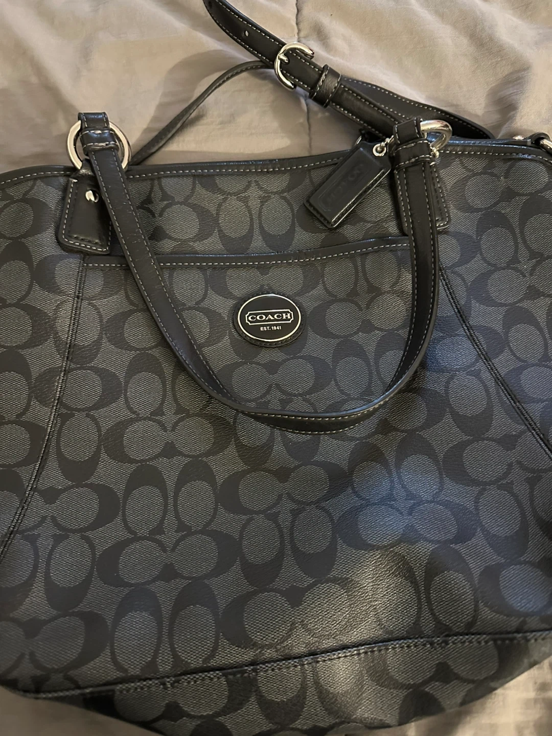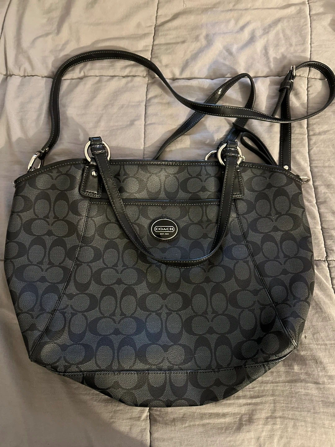 This is a Coach tote bag with a black monogram pattern. It has leather trim and silver hardware. The interior has a fabric lining. Some wear is visible on the top trim can be fixed.. pick up only! Cash only! East 106th st and 1st ave!