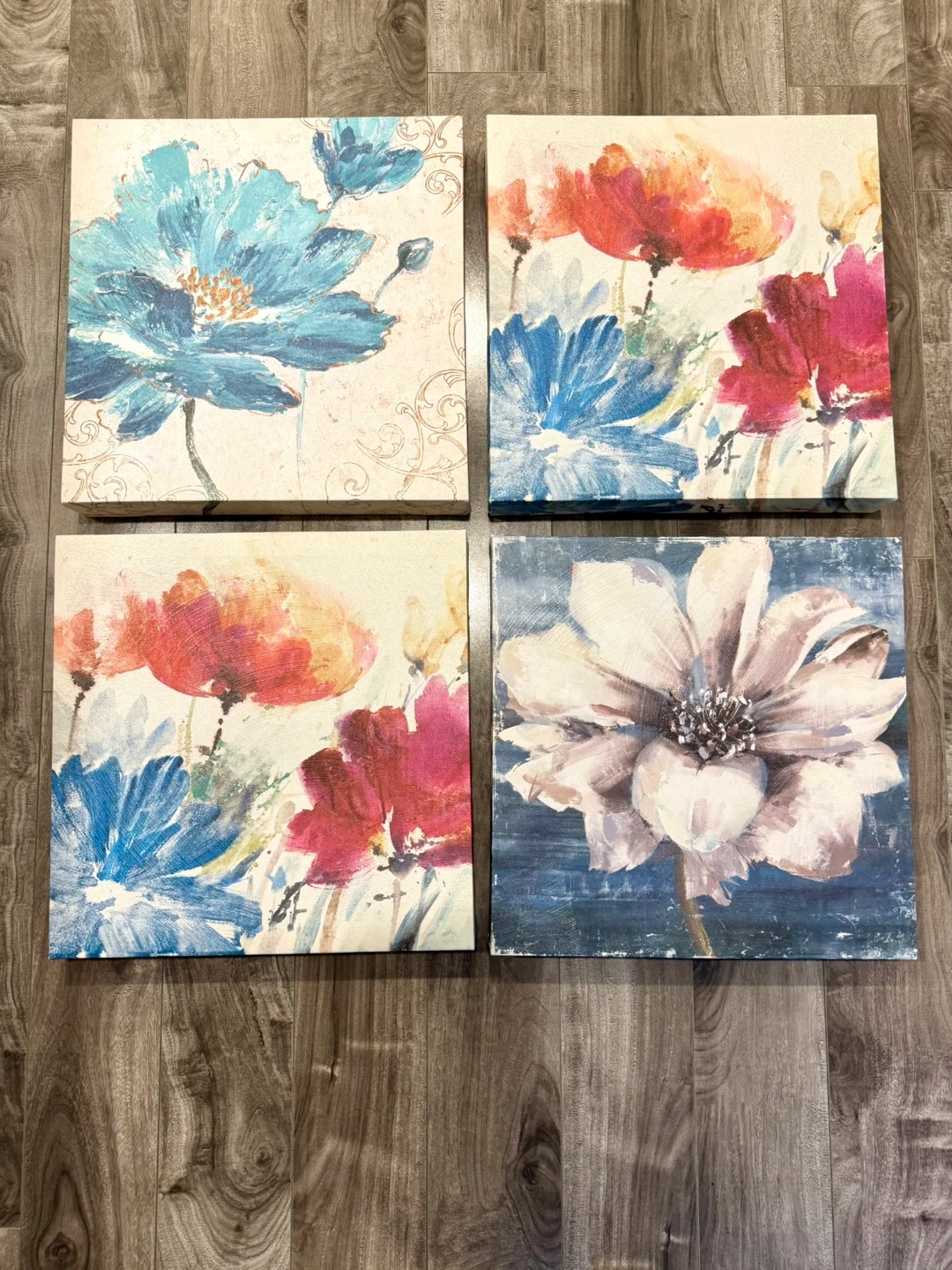 Four square canvas prints featuring vibrant floral designs. Includes a blue poppy, red and pink poppies, and a white cosmos. Perfect for adding a splash of colour to any room!