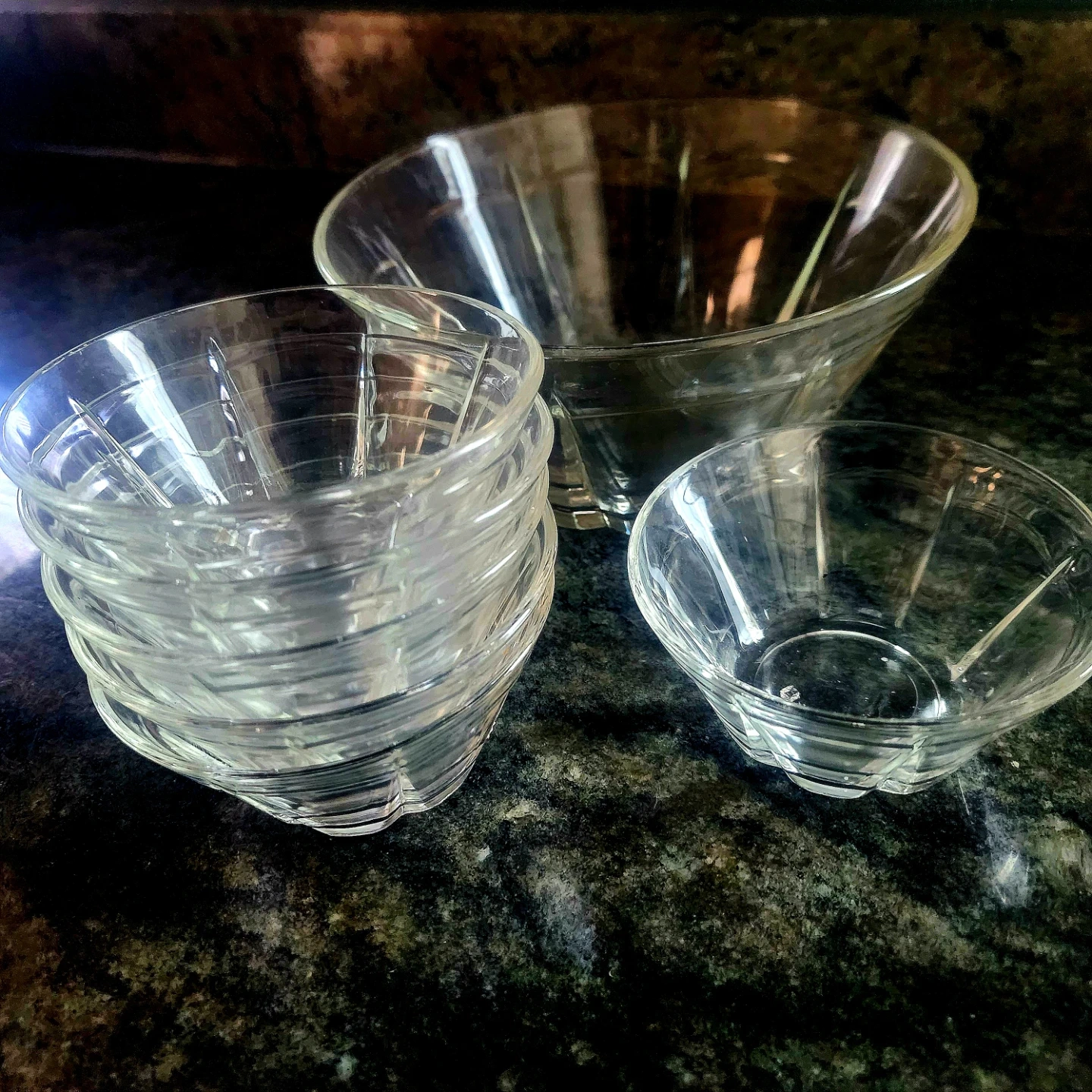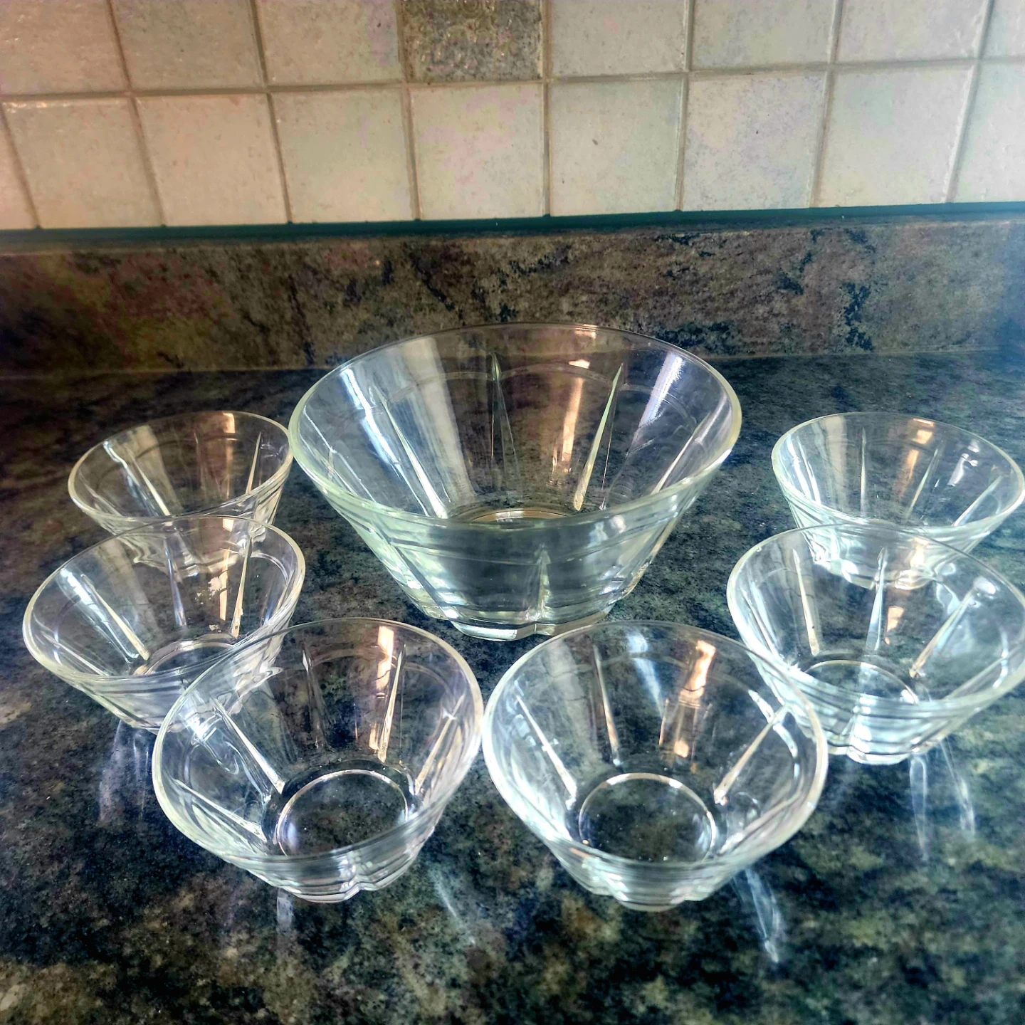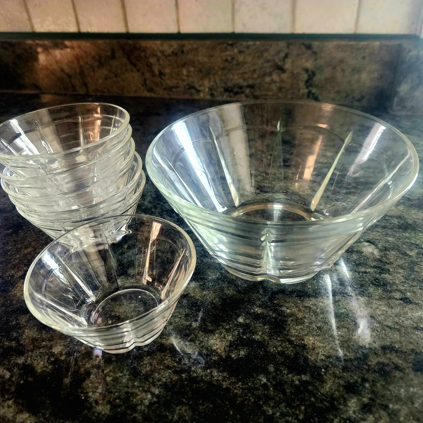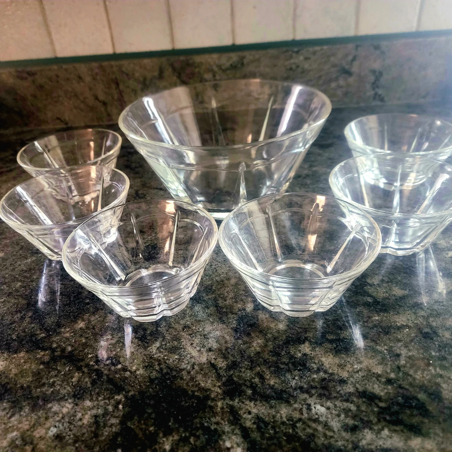 This set includes one large serving bowl and six small bowls. They're made of clear glass and feature a fluted design. Perfect for serving snacks or dips. Pickup near Harlem and Devon Chicago 60631, cash only