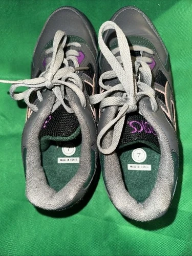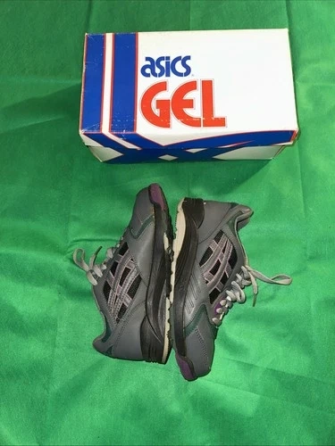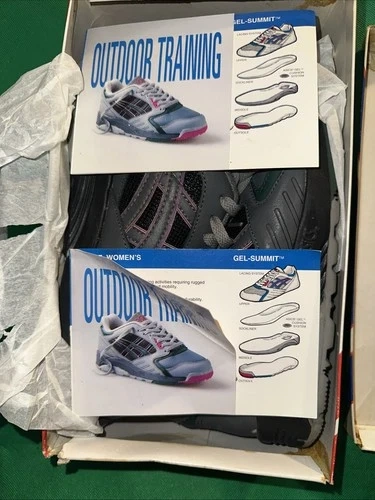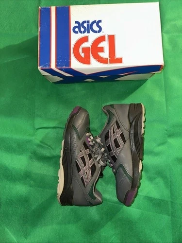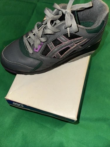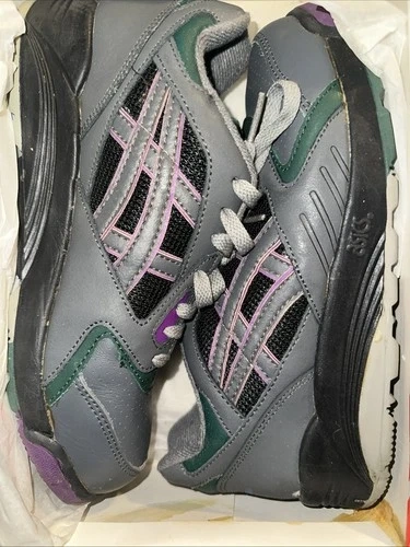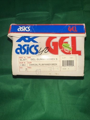 The product shown is the vintage Asics Gel-Summit women's running shoe in the "Charcoal/Plum/Ranier Green" colorway. The model number for this specific shoe is SL97, and the color number is 1361. This model is considered a vintage, 90s-era Asics running shoe. With box!!