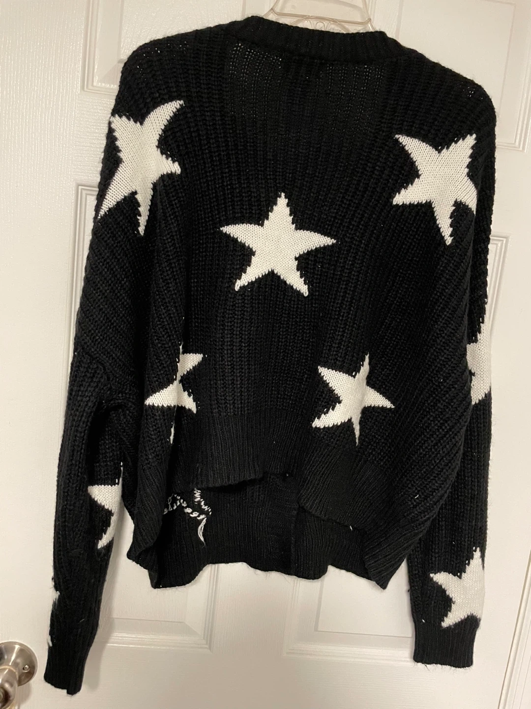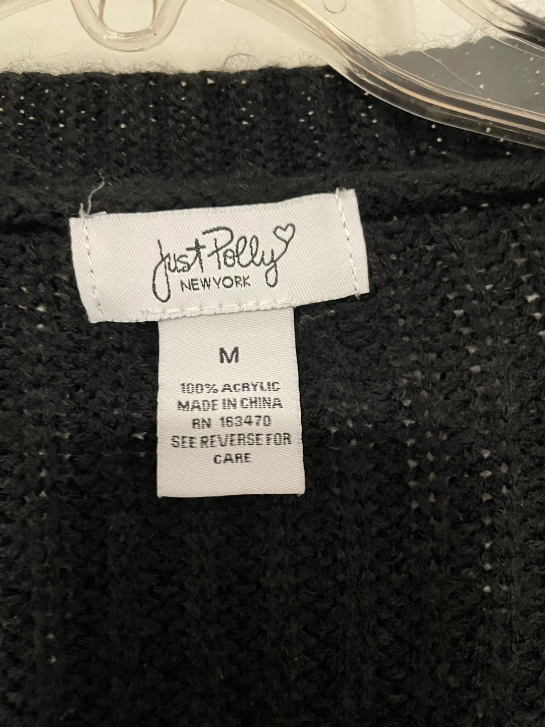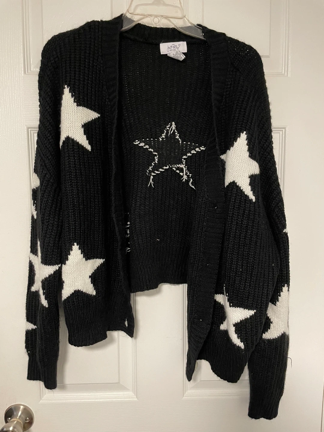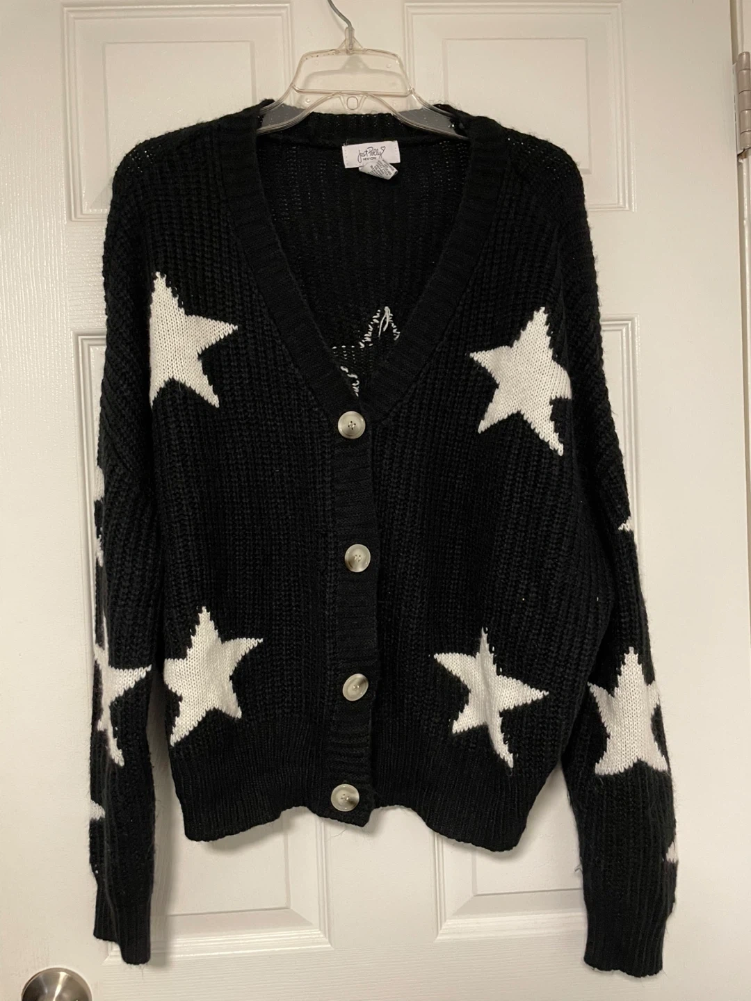 Selling a Just Polly cardigan in size medium! It features a fun star pattern in white against a black background. The material is 100% acrylic, making it a cozy and stylish piece for layering