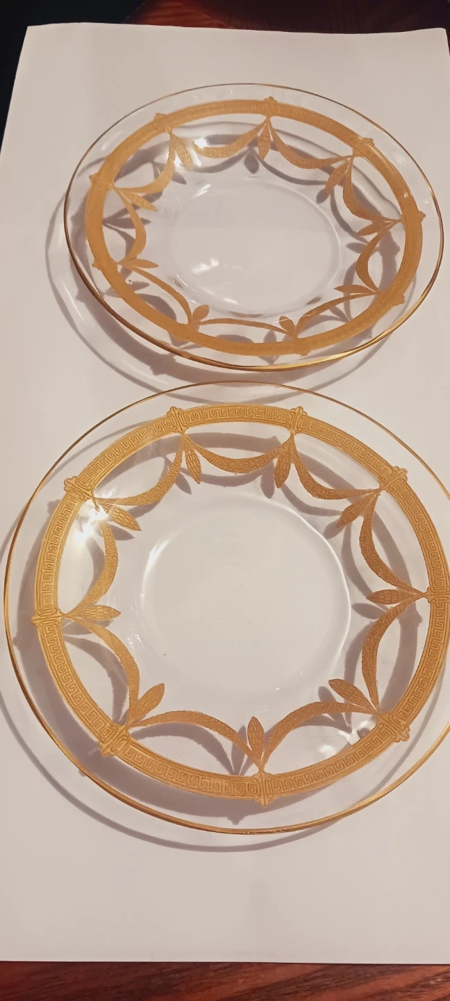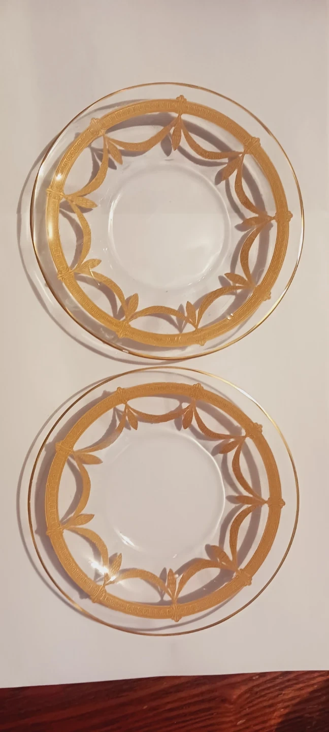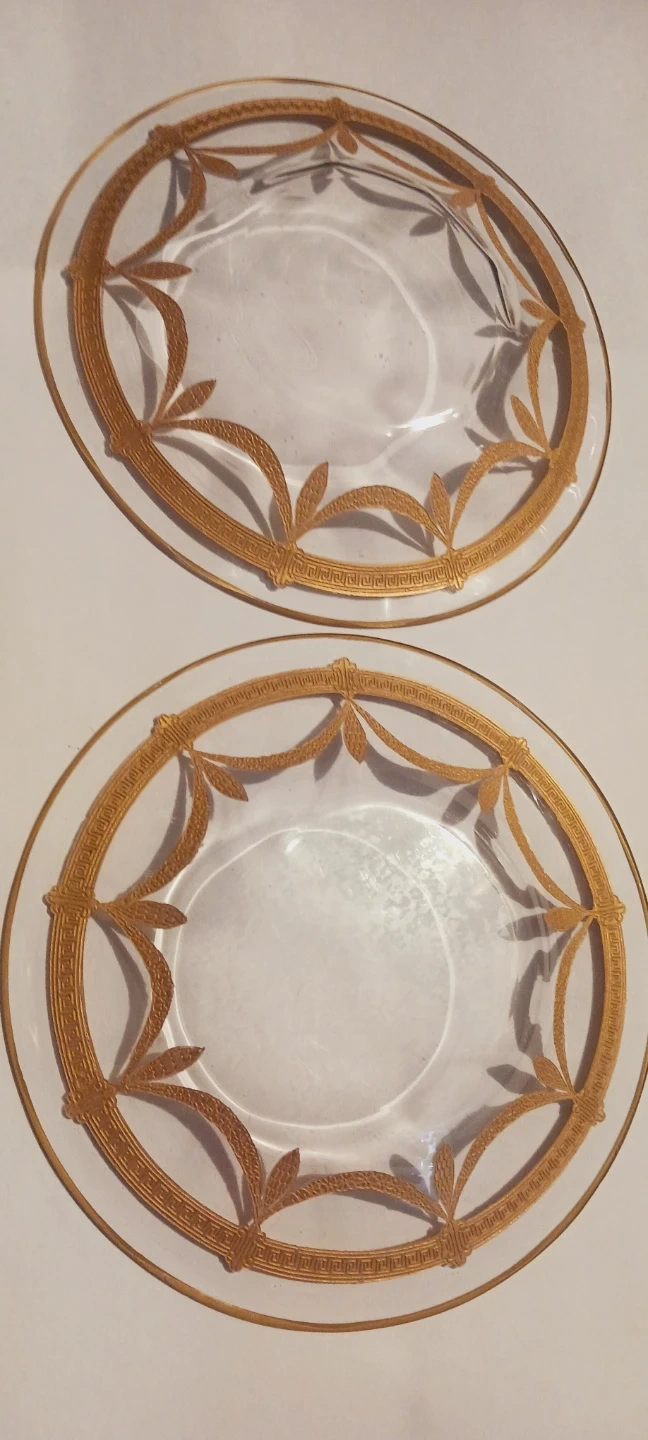 SET OF 2 × MOSER LOBMEYR ANTIQUE 19TH CENTURY BOHEMIAN 24KARAT GOLD GILT GOLD ETCHED BOWS AND WREATHS DESIGN HAND PAINTED HAND BLOWN FINE CRYSTAL DESSERT PLATES. 6" diameter. Excellent condition. Made in 1880s in Austro- Hugarian Empire. ALL MY PRICES ARE NEGOTIABLE !