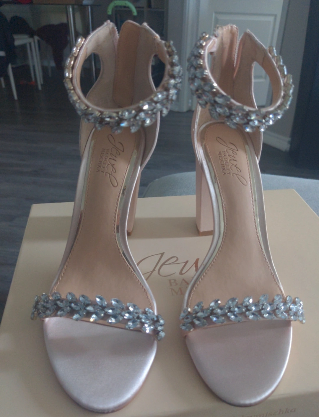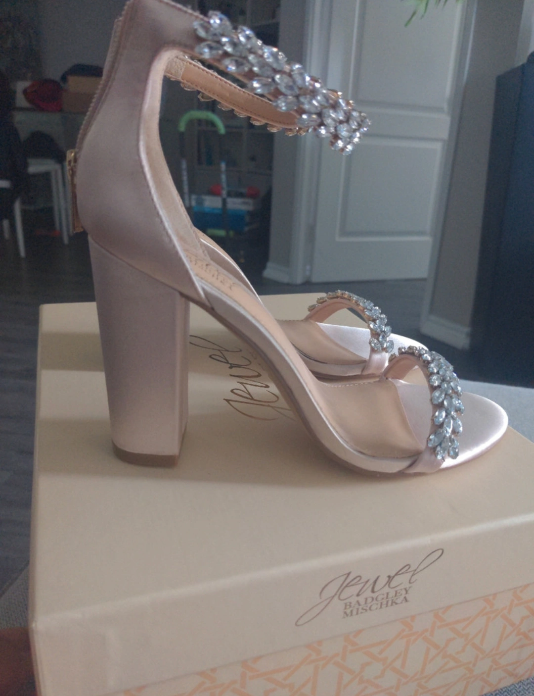 Brand new never worn Badgley Mischka shoes- size 6 1/2 in champagne satin. Comes with the box it came in. Was buying for my wedding, but found another pair that matched better. Purchased for $175. Selling for $80 or best offer.