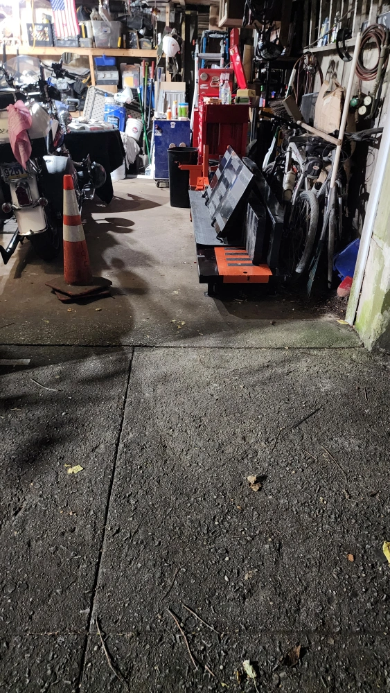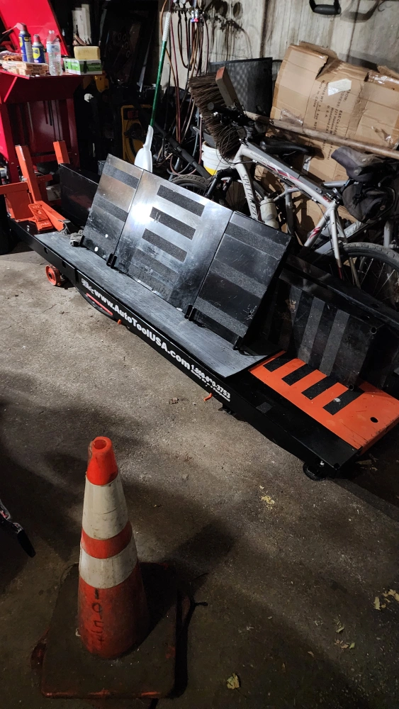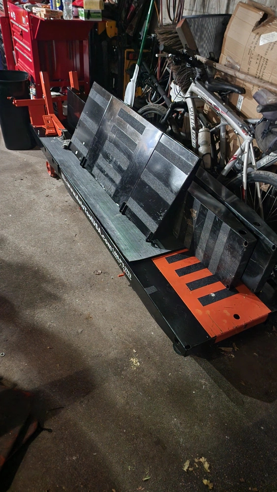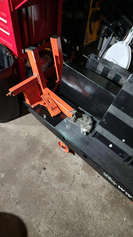 Black motorcycle lift table with orange accents. Four wheels and a handle on one side. Some wear and tear. Air compressed lift, with side attachments for ATV's and 4 wheelers. Great lift, this is top of the line.
